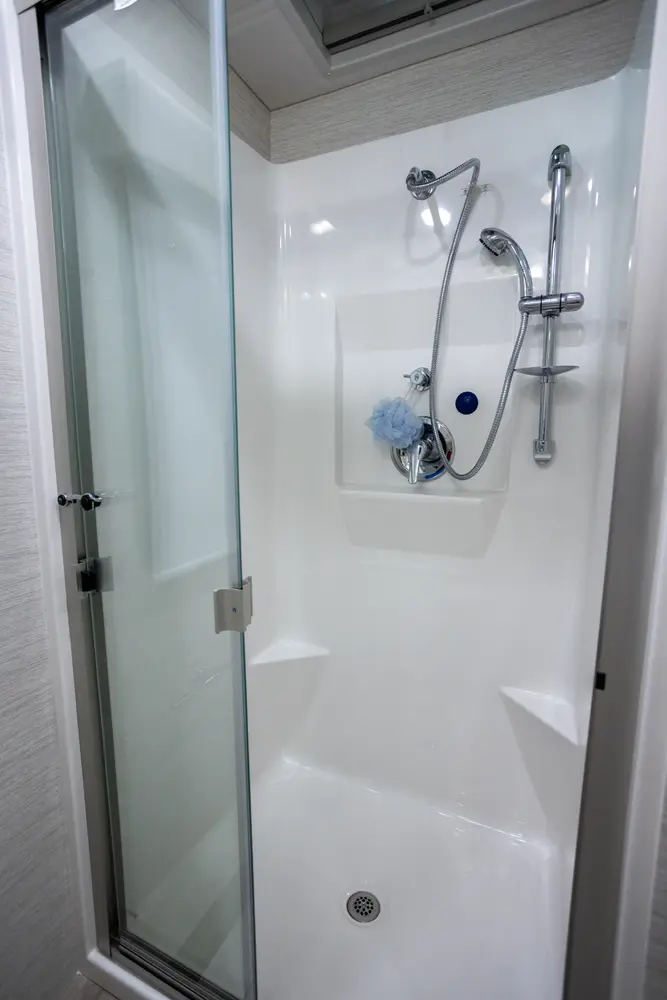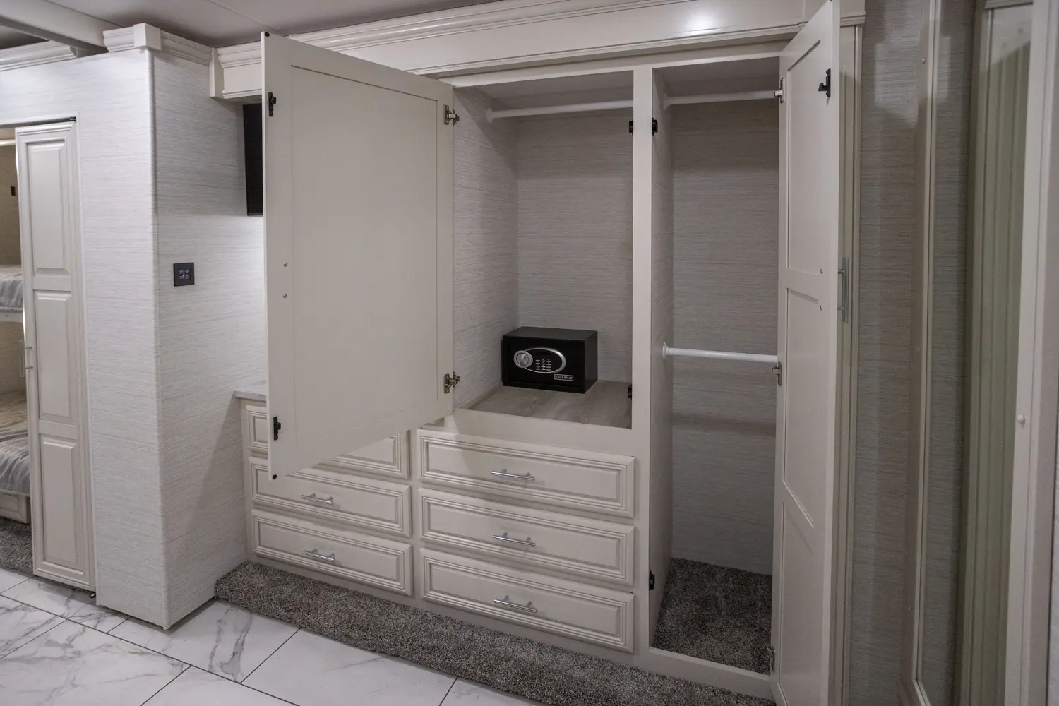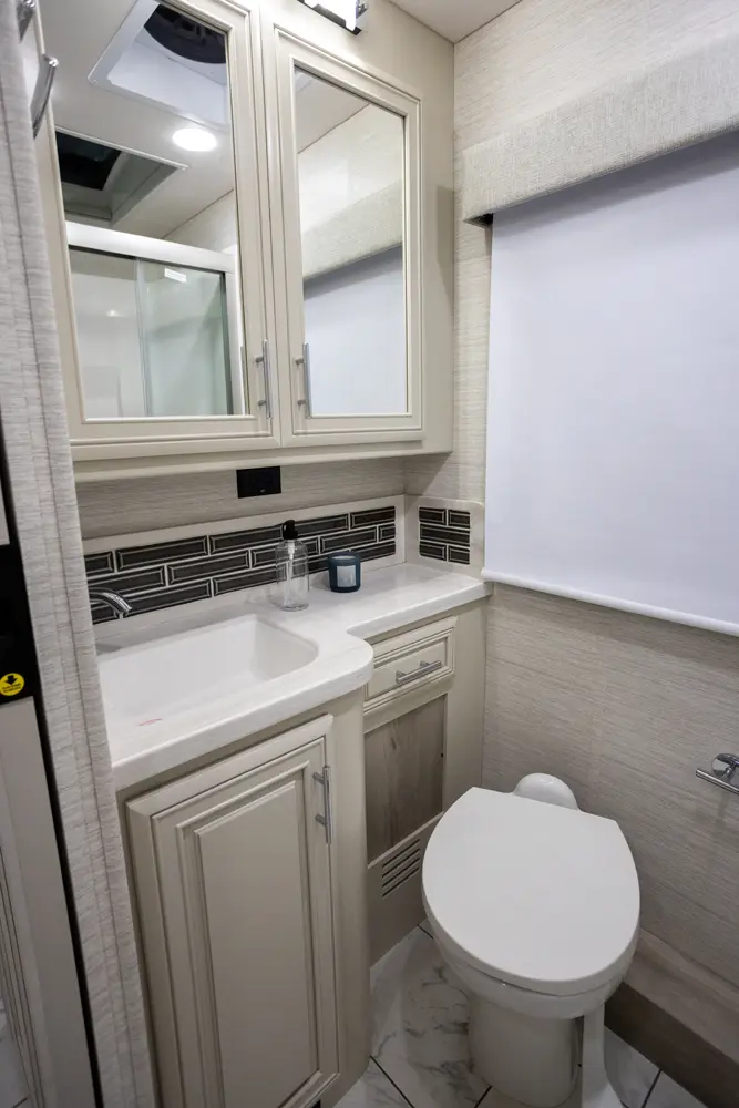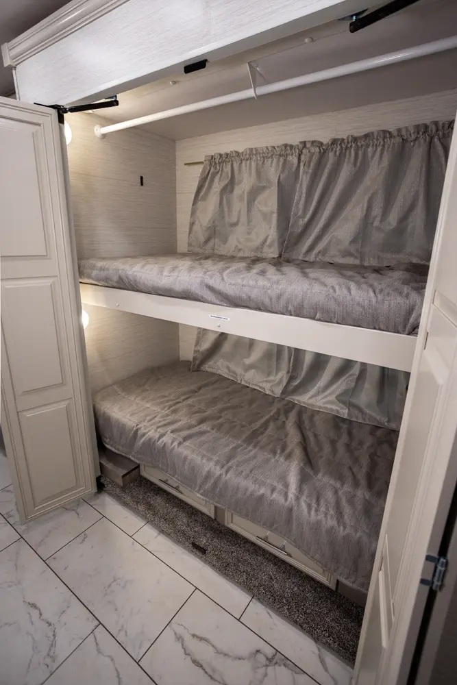 The Berkshire XL 40E is a three-slide bunkhouse model with two full bathrooms. The rear full bath includes a shower, vanity sink with medicine cabinet, and stacking washer/dryer. The bedroom has a slideout, 72" x 80" Tilt-a-View king bed, plus a dresser, wardrobe cabinet, TV, and overhead cupboard. The second full bath sits across from the bunk room/wardrobe combo. The kitchen is fully equipped, with a convection microwave, induction cooktop, and residential-style refrigerator.