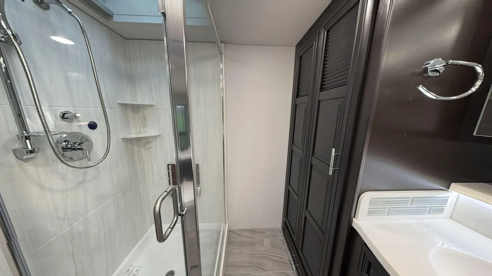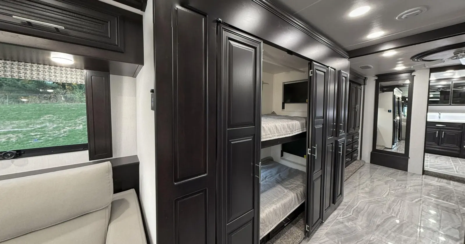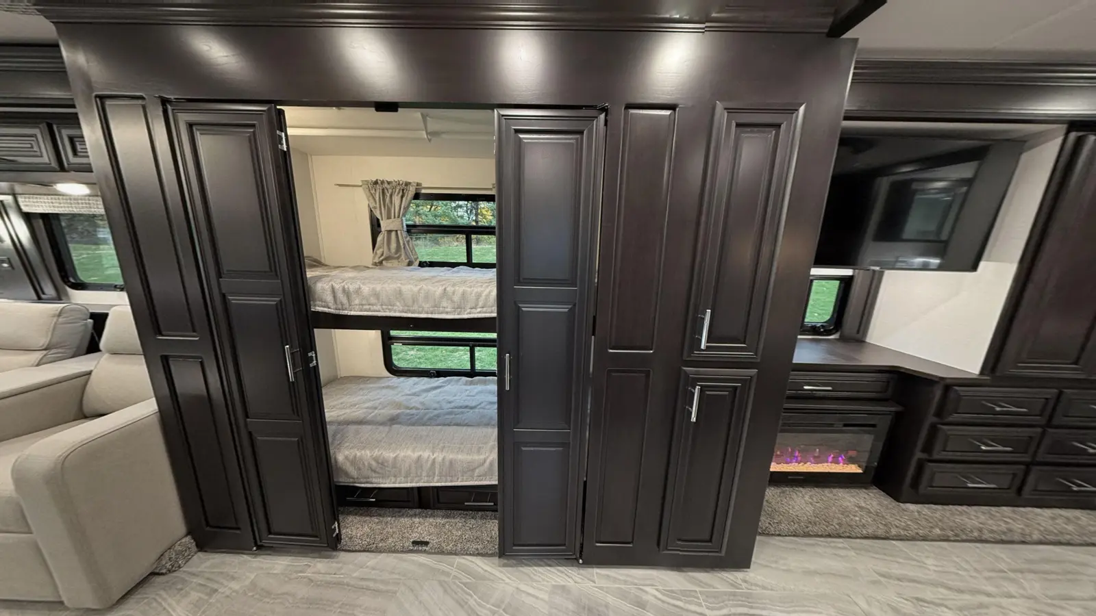 The Berkshire XLT 45CA is a three-slide bunkhouse model with two full bathrooms. The large full rear bath includes a roomy shower, vanity with dual sinks overhead cabinets, and stacking washer/dryer. The main bedroom is just off the bath, with a slideout, 72" x 80" Tilt-a-View king bed, plus a dresser, wardrobe cabinet, 43" TV, and overhead cupboards. The second full bath has a shower, vanity sink, medicine cabinet, and commode. Across across from this bathroom is the bunk room/wardrobe combo. The kitchen is fully equipped, with a convection microwave, induction cooktop, and residential-style refrigerator. Just over the cockpit, you'll find a unique drop-down bed for an added sleeping surfac