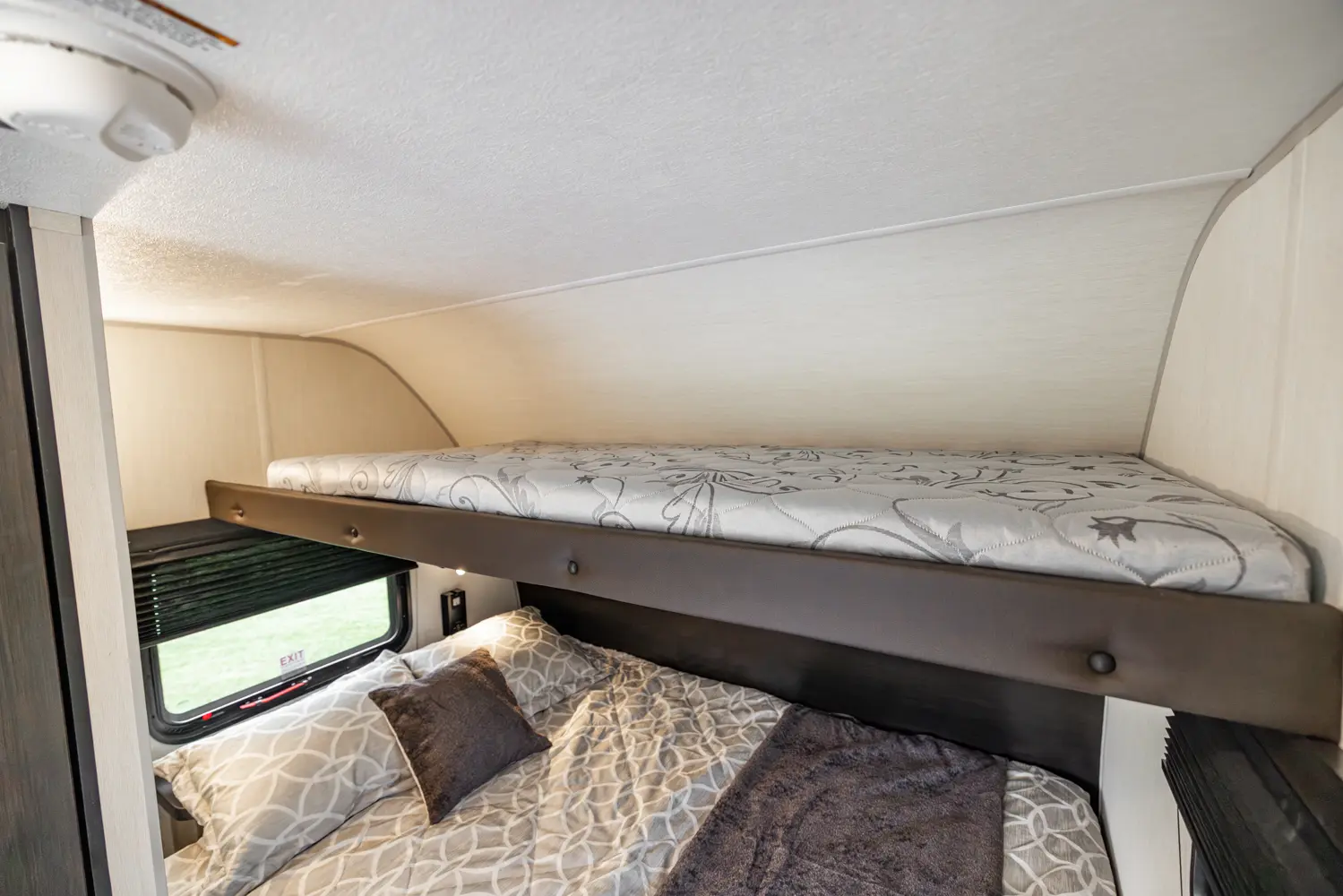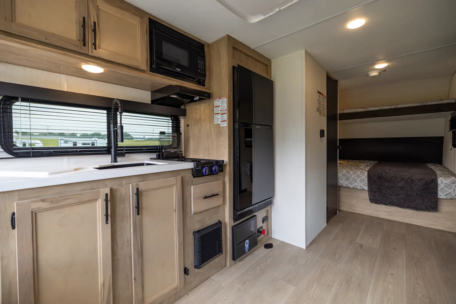 The 18RJBWBL is what a small toy hauler should be with the right combination of size, weight, and storage capacity for your toys. A modern chef’s kitchen, dinette area, queen size bed with overhead bunk and functional bath highlight the interior of this unit. On the exterior the exclusive Pup patio system will give you a great elevated seating area. As with all Pups, our outside awning area is second to none. Entertain guests with our outside entertainment area with speakers, and TV bracket.