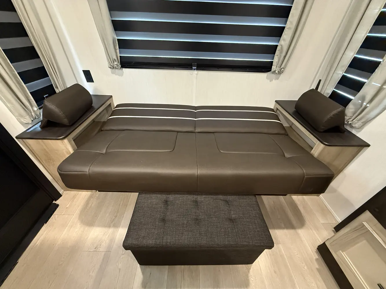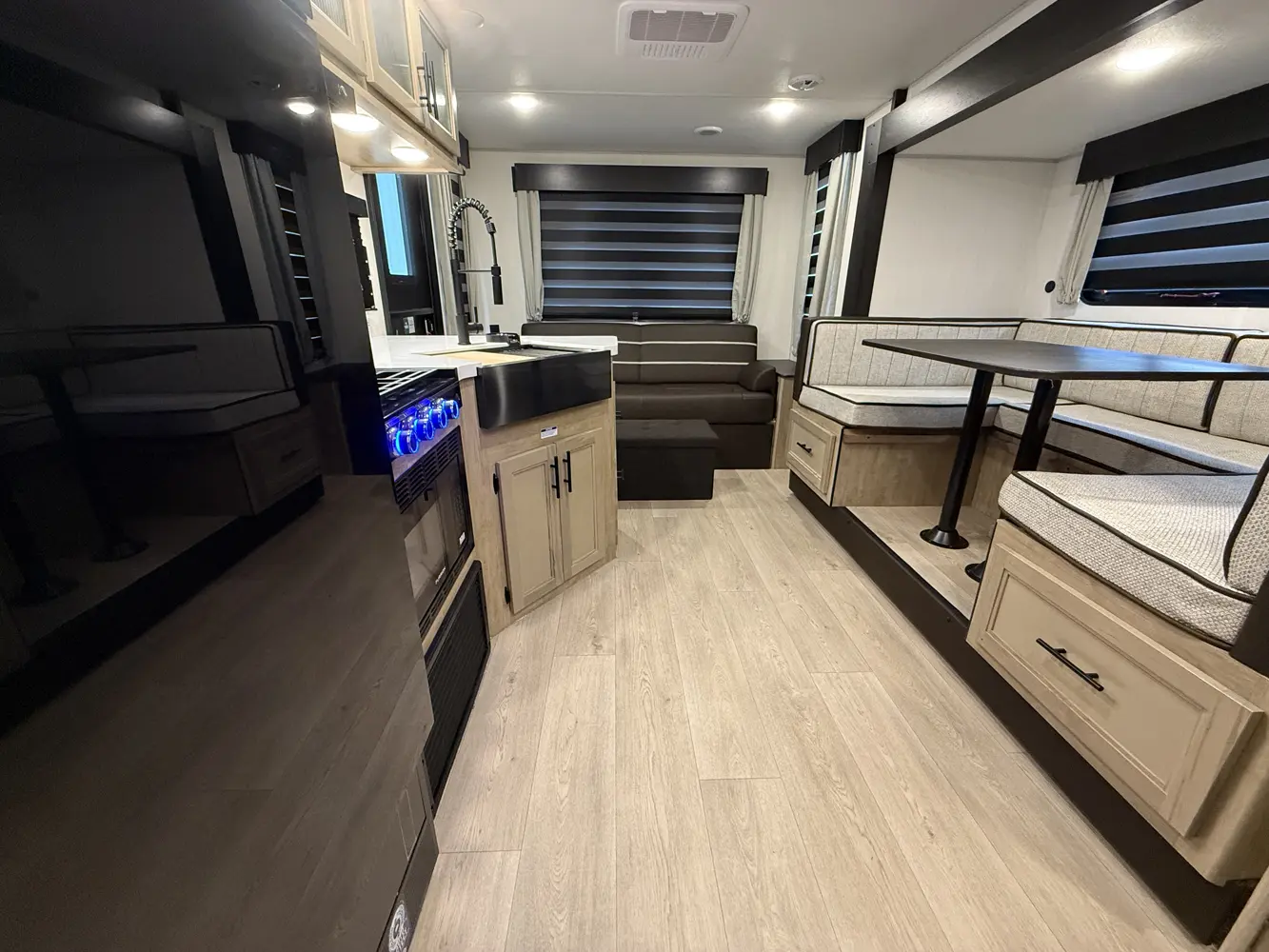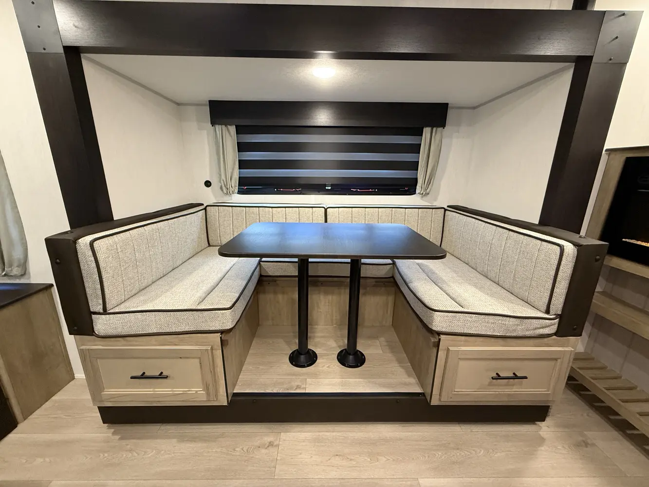 The 23MKBL is a touring unit perfect for your family. Enjoy the huge U-shape dinette situated in the slide out for dining, and additional sleeping for 2 adults. A rear sofa is positioned for comfort and TV viewing. The modern chef’s kitchen has the right combination of functionality and storage with a full-size pantry. A huge bathroom leads into a private master suite with queen bed. Outside, enjoy the Cherokee camp kitchen, exterior TV bracket with speakers, and power awning.