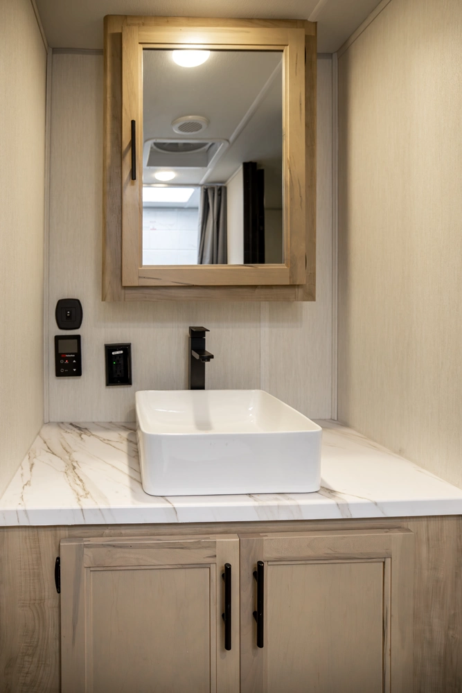 The private 11’ garage includes a dinette that converts into 2 twin beds. Outside amenities include a full outside kitchen plus shower, speakers, TV hook up and rear ramp converting into a patio for entertaining. Inside features a dinette slide out and includes a large skylight and chef’s kitchen with black stainless steel farm sink and sink cover for additional counter space. The bedroom has a queen bed and nearby bathroom includes a full size sink, medicine cabinet and shower/tub combination.