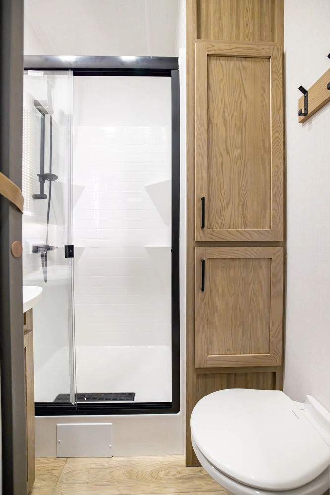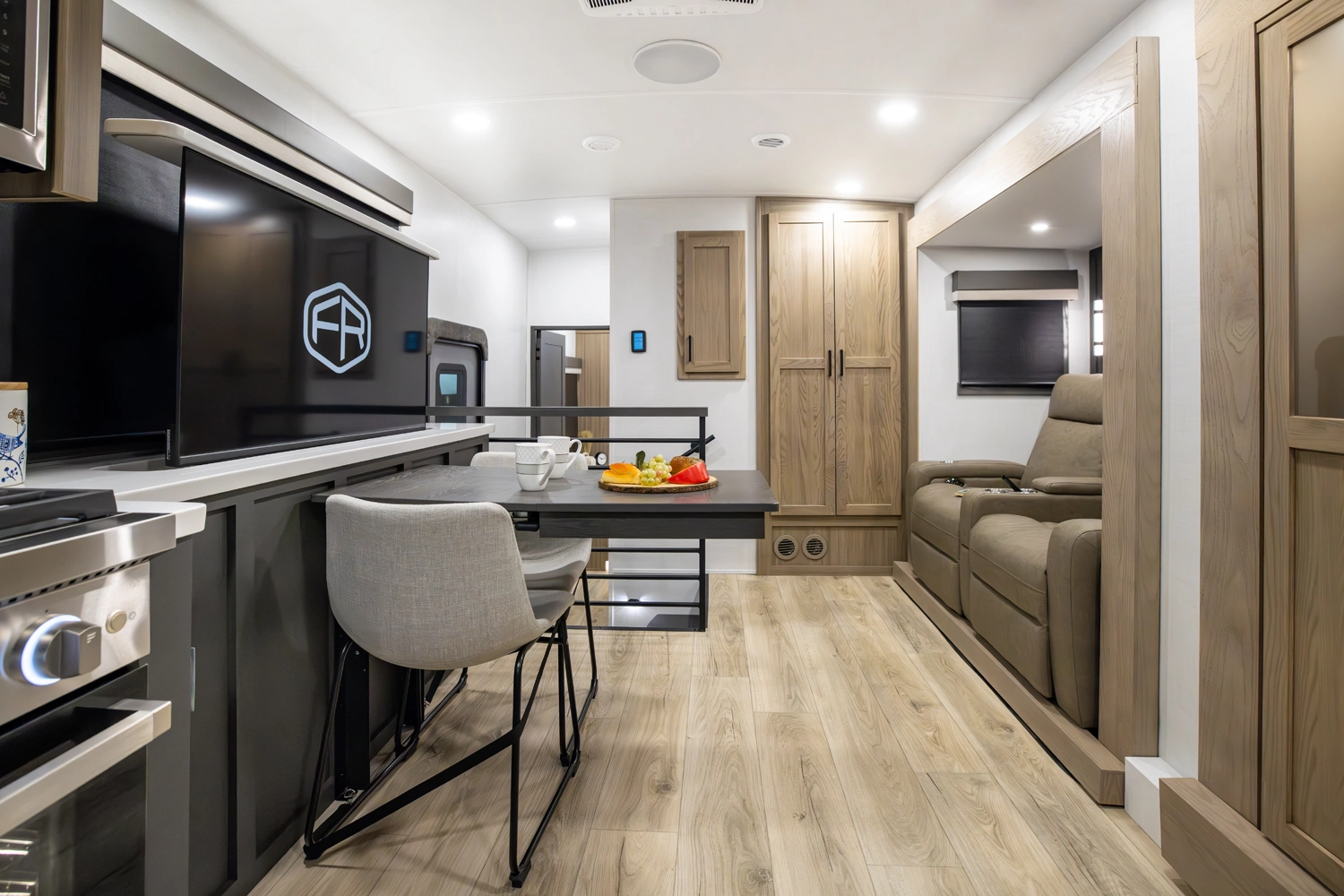 Our first front living fifth wheel under 30' delivers big luxury in a compact design! The front living area features a 60" theater seat, rotating dinette, and televator TV. The kitchen offers a full pantry, fridge, and ample counter space, while the rear bedroom includes a queen bed (king optional), wardrobe, vanity, and washer/dryer prep. With dual awnings and pass-thru storage, it’s perfect for easy towing and upscale comfort.