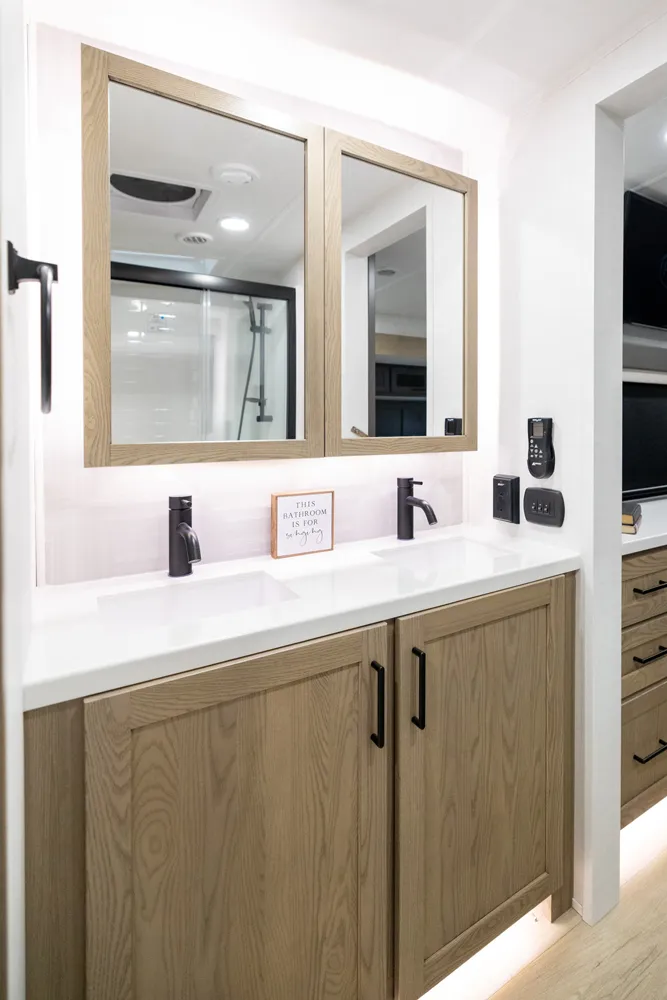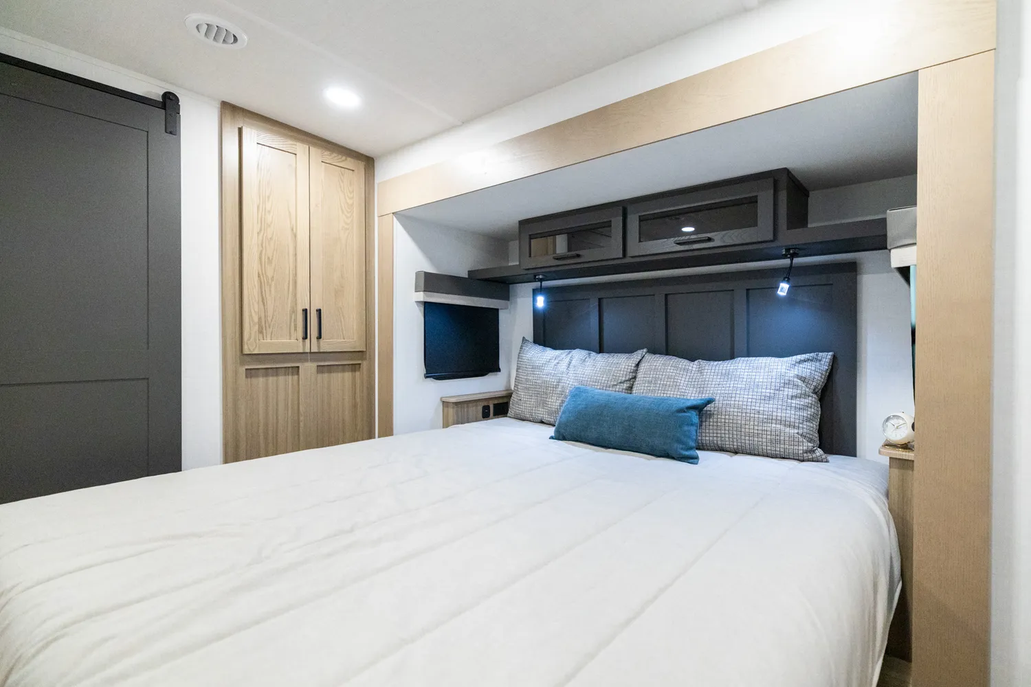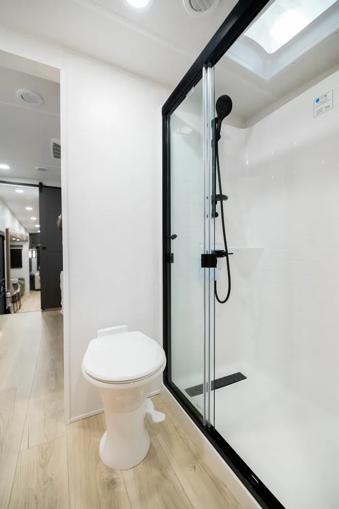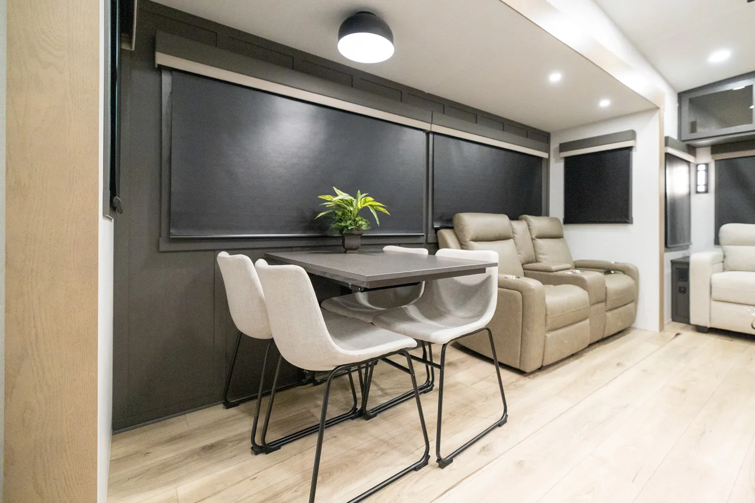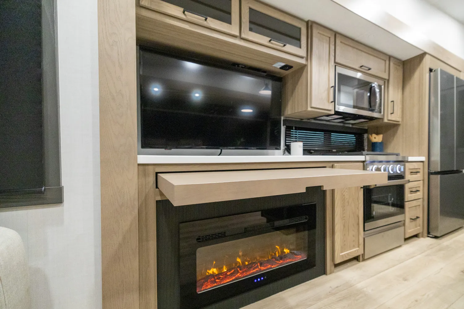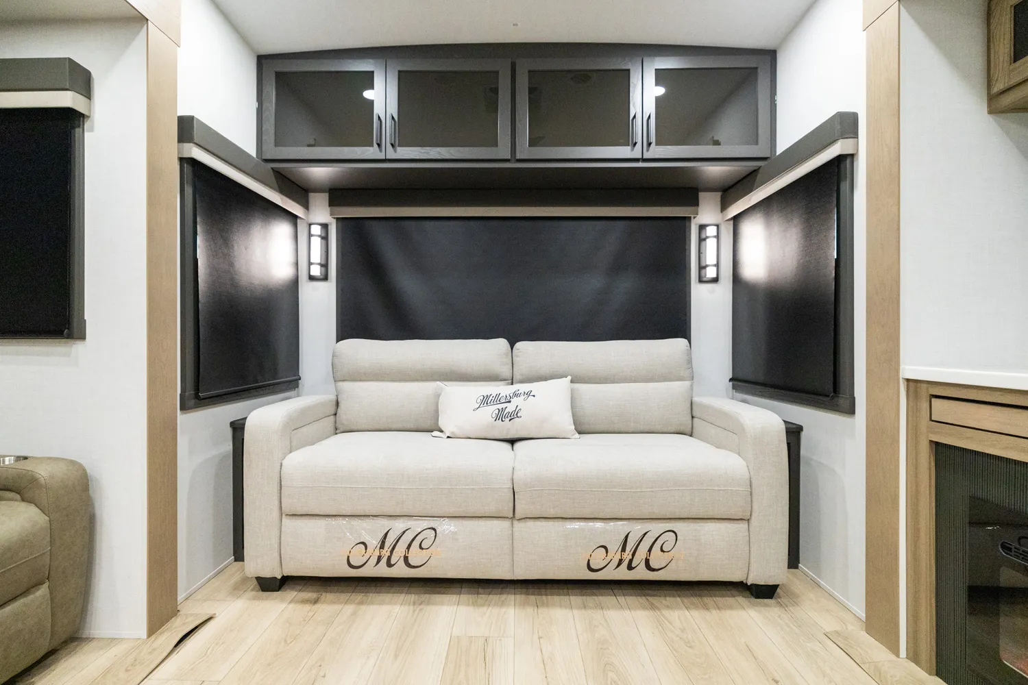 This 40' rear living fifth wheel combines comfort and versatility! The spacious living area features a 76" hide-a-bed, 67" theater seating, a fireplace, and a pull-out desk for remote work or hobbies. The kitchen offers an island, pantry, and rotating dinette seating, while the private bedroom includes a king bed, dresser with fireplace, and washer/dryer prep. With dual toilets, dual awnings and pass-thru storage, it’s built for extended stays in style.