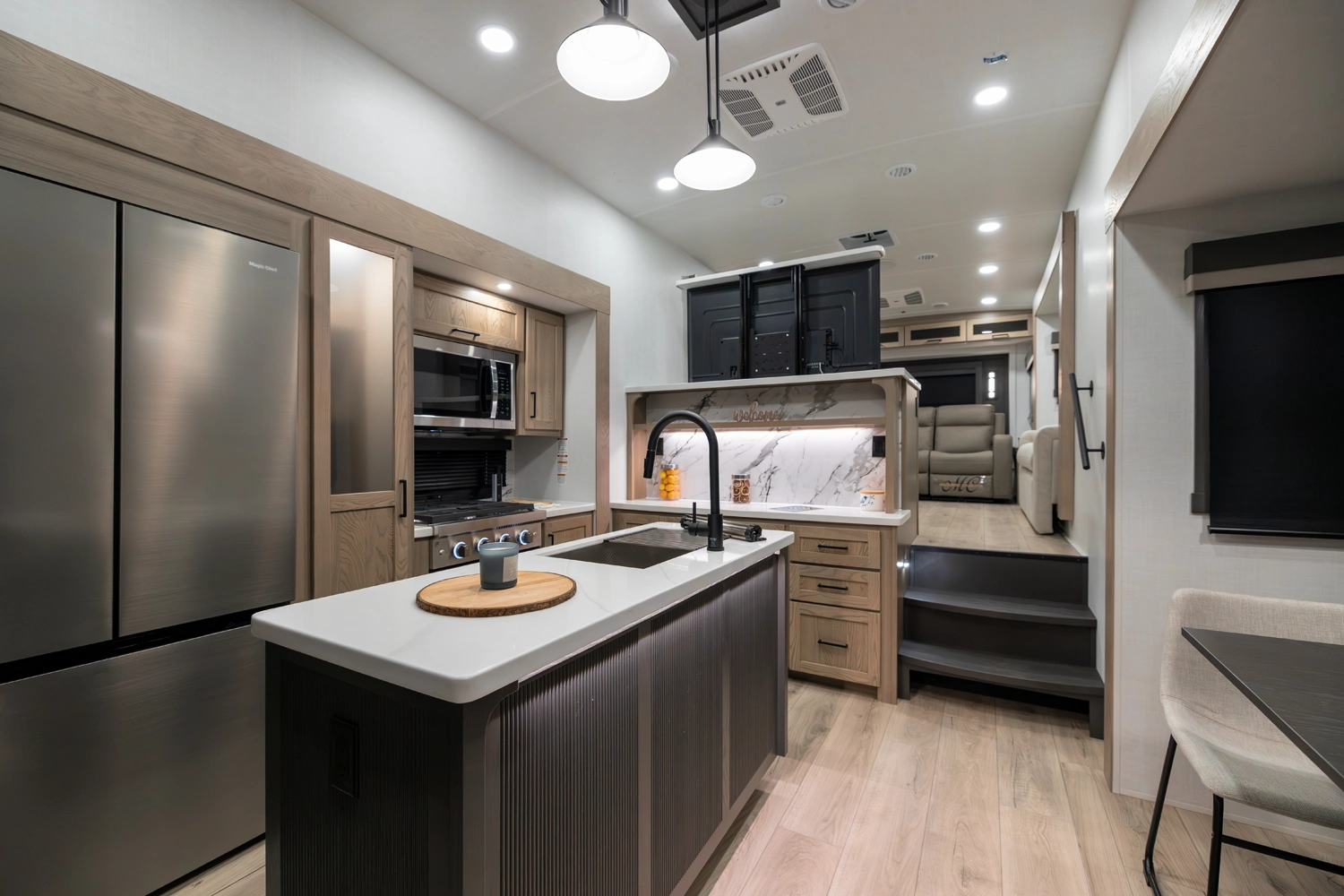 Our first 40' front living fifth wheel delivers luxury and space in every detail! The front lounge features dual 68" hide-a-beds, a 78" theater seat, fireplace, and televator TV. The central kitchen includes an island, double pantries, and rotating dinette seating. The private rear bedroom offers a king bed, washer/dryer prep, and ample storage. With dual awnings and pass-thru storage, it’s made for elevated travel living.
