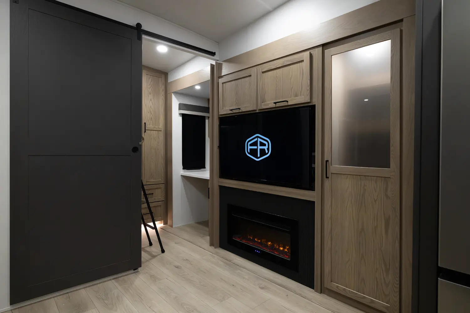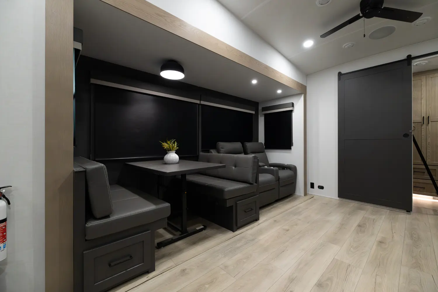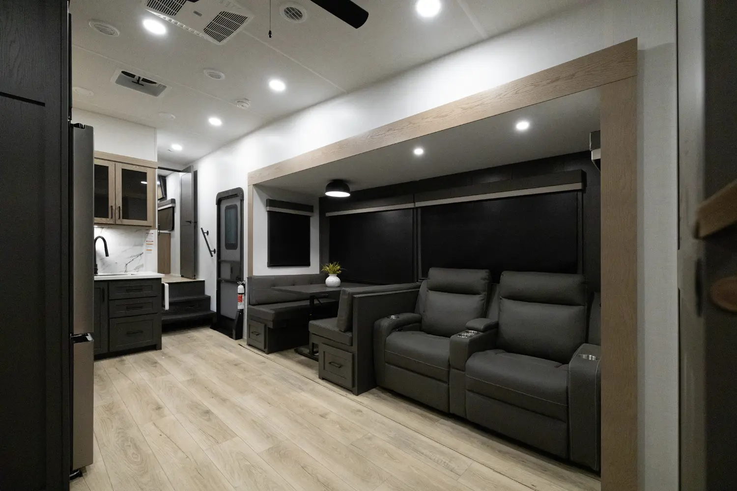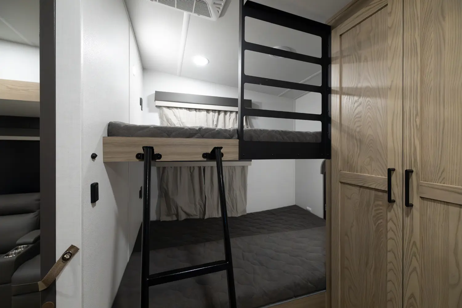 Our first 40' bunkhouse fifth wheel combines family comfort and luxury! The rear bunkroom offers double 48" x 72" bunks, wardrobe, desk, and fridge. The spacious living area features a 60" theater seat, 44" dinette, and fireplace, while the front bedroom includes a king bed and washer/dryer prep. With dual awnings, pass-thru storage, and off-grid Power Package options, it’s perfect for big adventures.