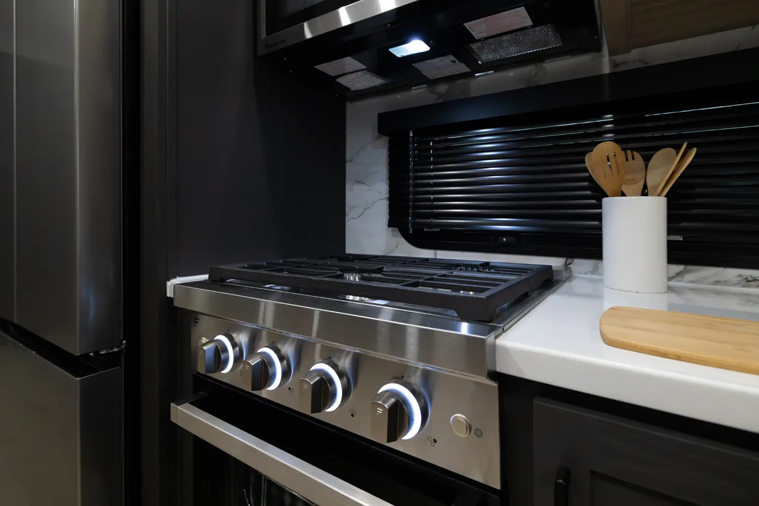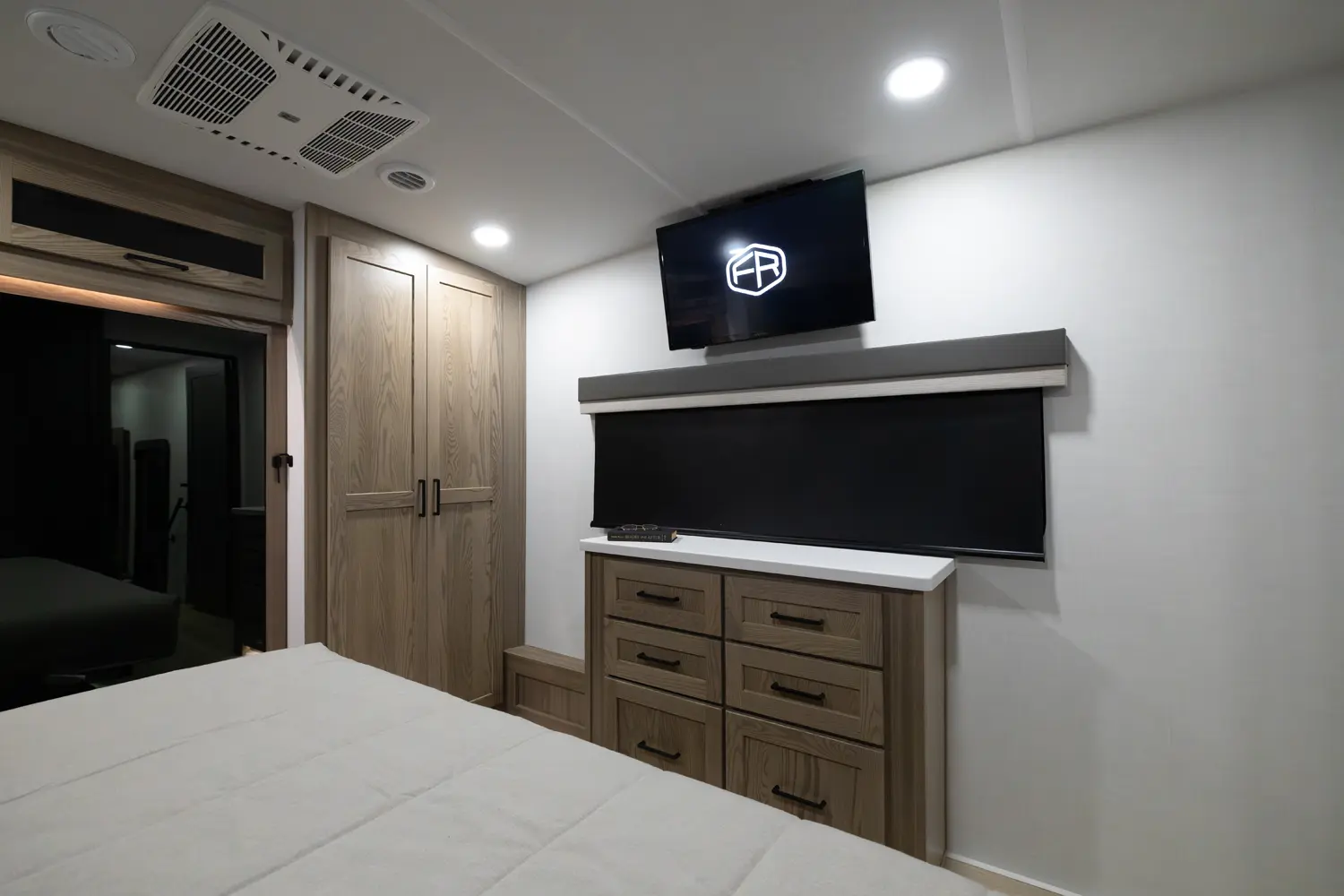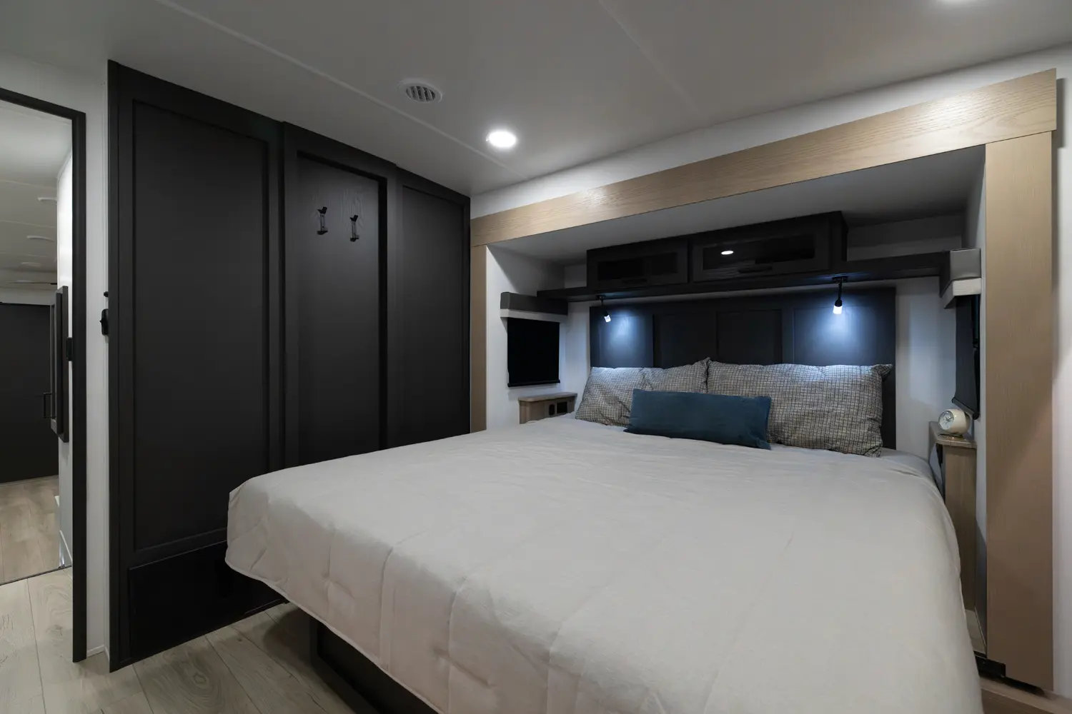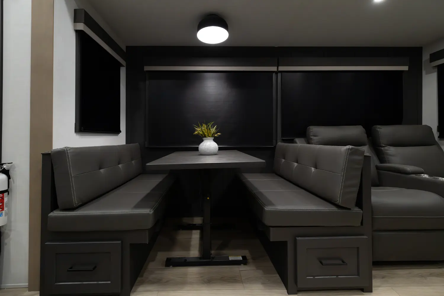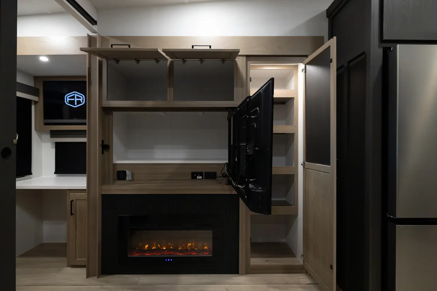 Our first 40' bunkhouse fifth wheel combines family comfort and luxury! The rear bunkroom offers double 48" x 72" bunks, wardrobe, desk, and fridge. The spacious living area features a 60" theater seat, 44" dinette, and fireplace, while the front bedroom includes a king bed and washer/dryer prep. With dual awnings, pass-thru storage, and off-grid Power Package options, it’s perfect for big adventures.