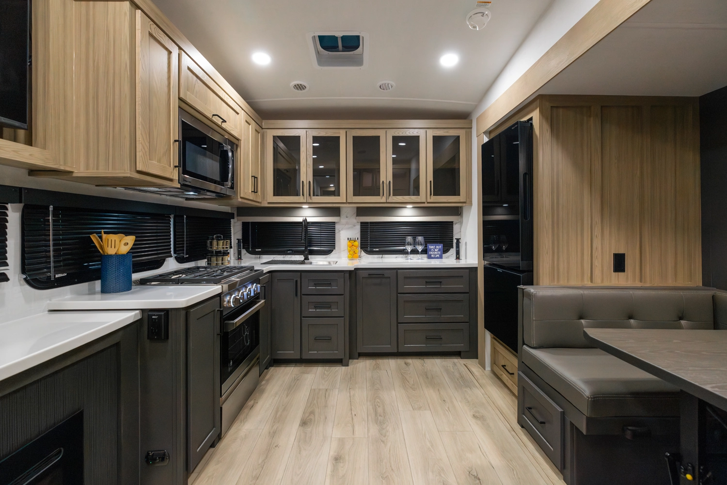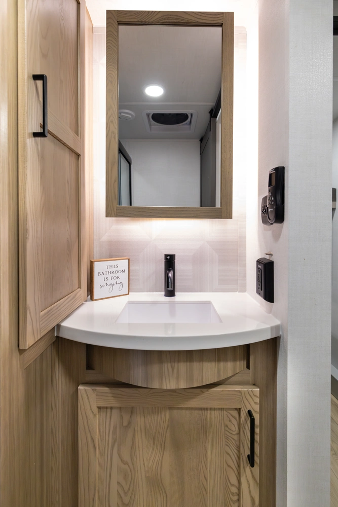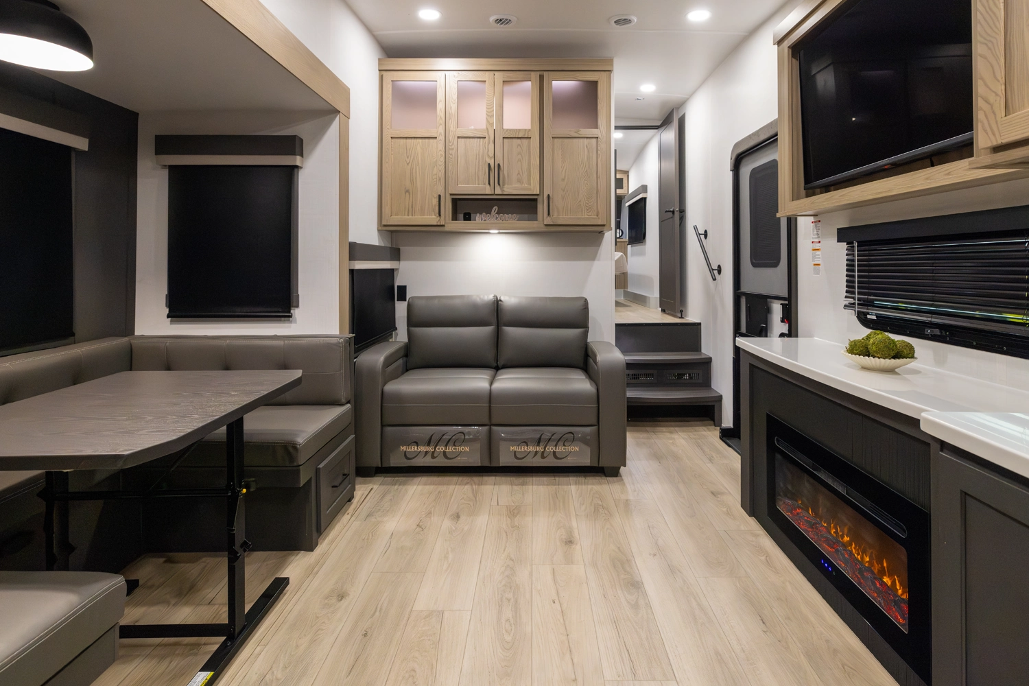 This versatile fifth wheel offers a spacious living area with a 60" hide-a-bed sofa, fireplace, and optional theater seating. The large king U-dinette converts for extra sleeping space and provides plenty of room for family meals. The front bedroom features a queen bed with an optional king upgrade and ample wardrobe storage. With a full rear kitchen, pass-thru storage, and a 21' awning, it’s designed for comfort and convenience on every trip.