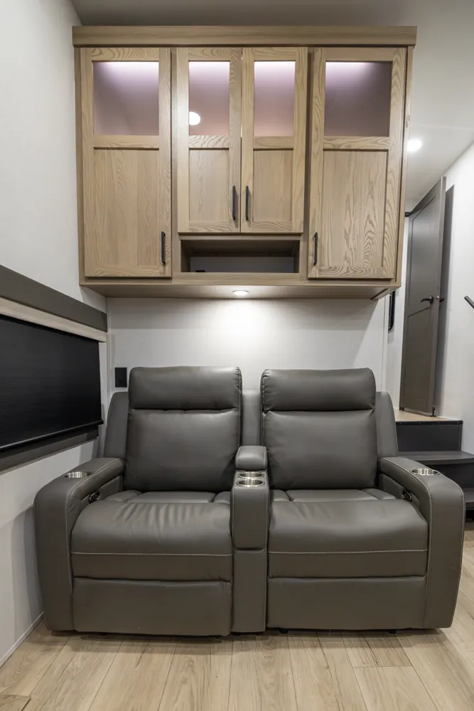 One of the best entertainment centers in the industry! This 371RK 5th wheel will entertain your family and friends for a night of relaxation after a long day of camping. It features a 68" Hide-a-Bed, a 60" Hide-a-Bed & 60" theater seating. Its front bedroom features a queen bed, (optional King) massive wardrobe storage & Washer/Dryer prep. The rear kitchen offers tons of counterspace paired with ample cabinet space, drawers, pantry storage & a trash can drawer.