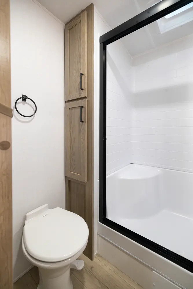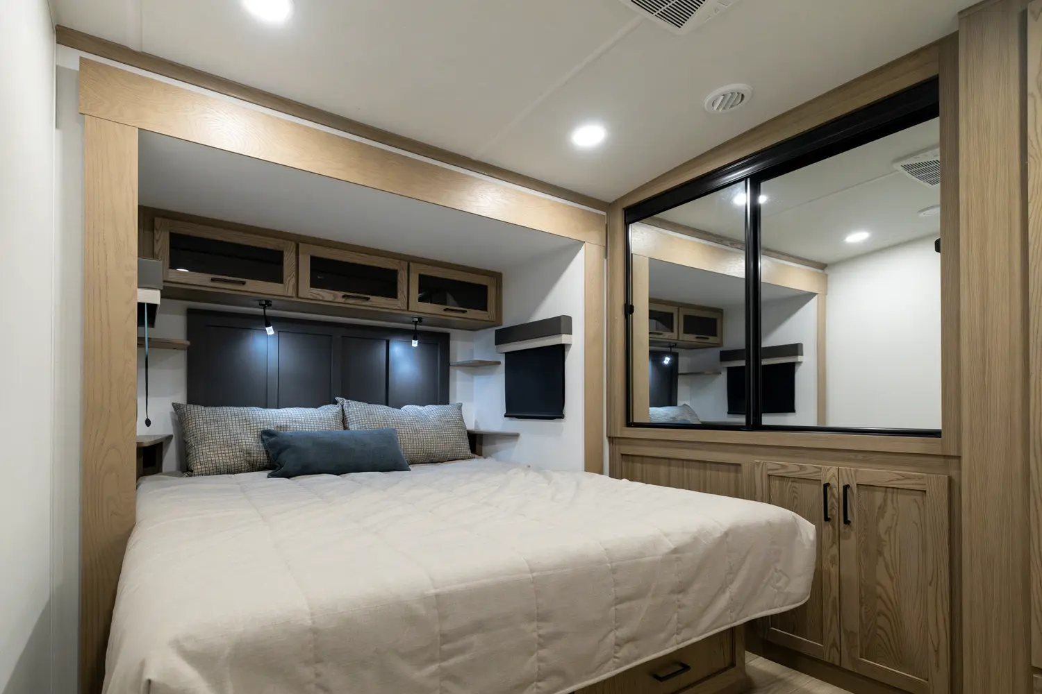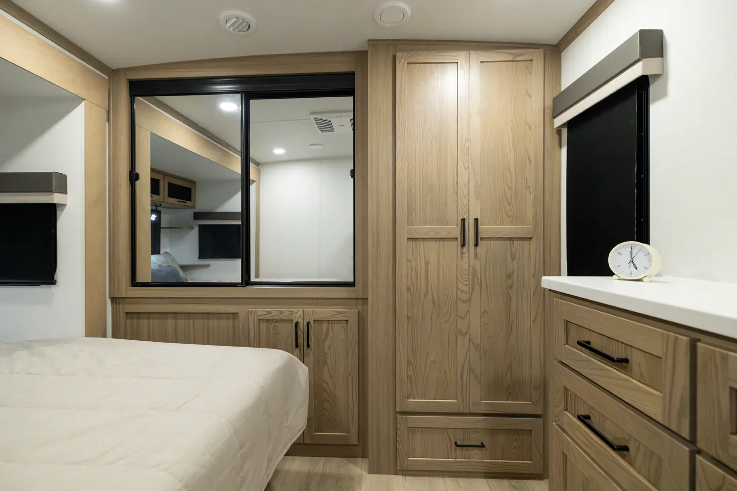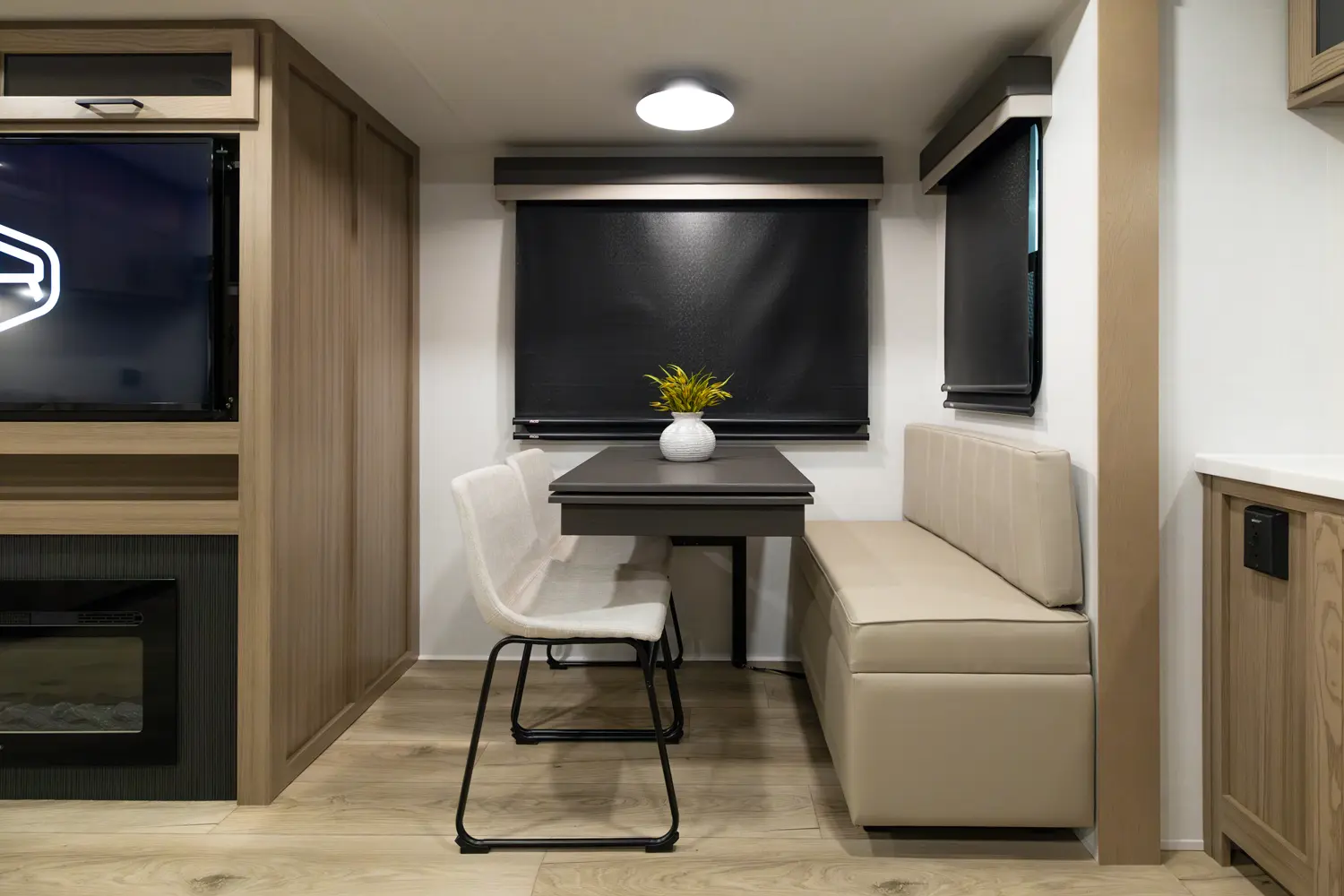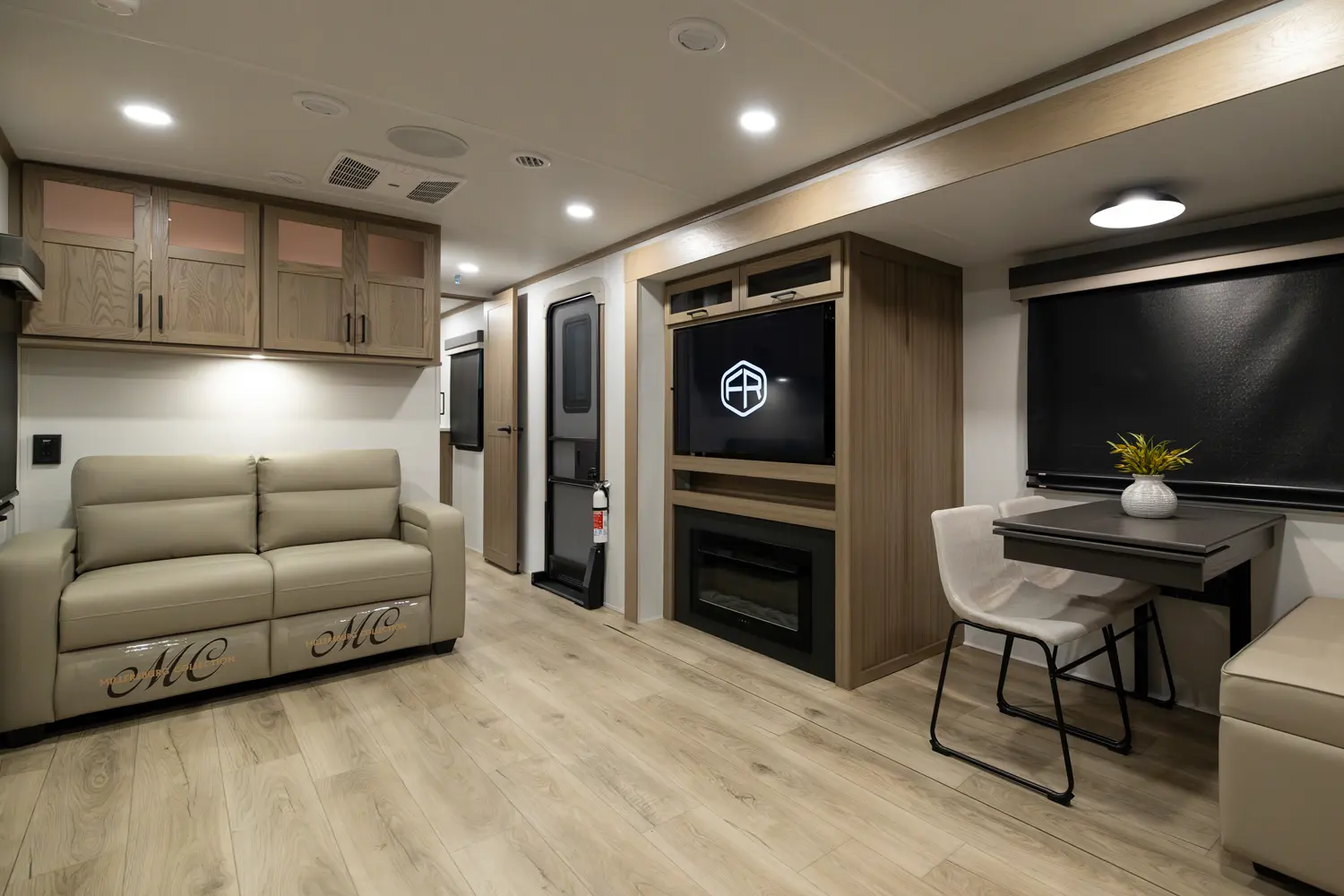 This trailer has an enormous rear kitchen area with a double slide out on each side of the unit. The 44" dinette is perfect for a night of cards or enjoying a family dinner. The living room area will fit the whole family plus more for a night of enjoying the awesome entertainment center amenities. The bedroom is equipped with a massive 72" x 80" king bed slide out and a big wardrobe that is washer and dryer prepped.