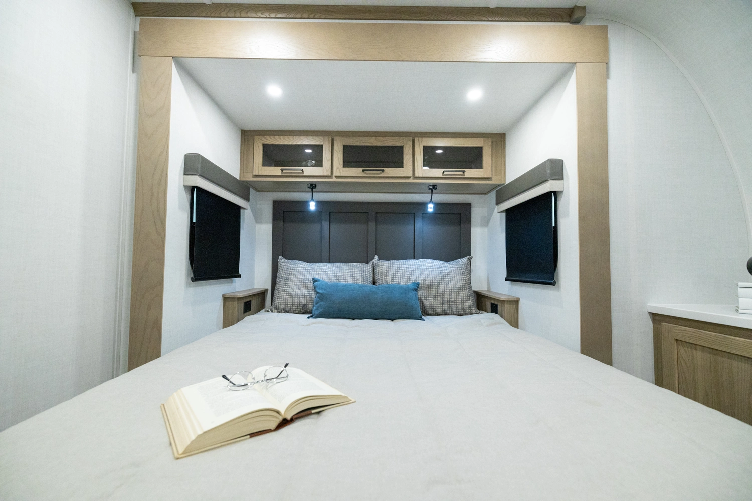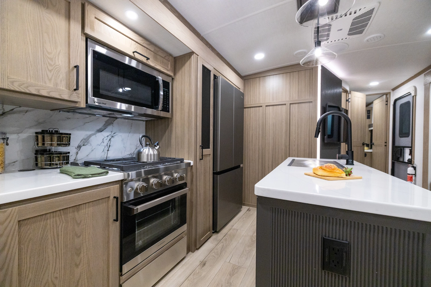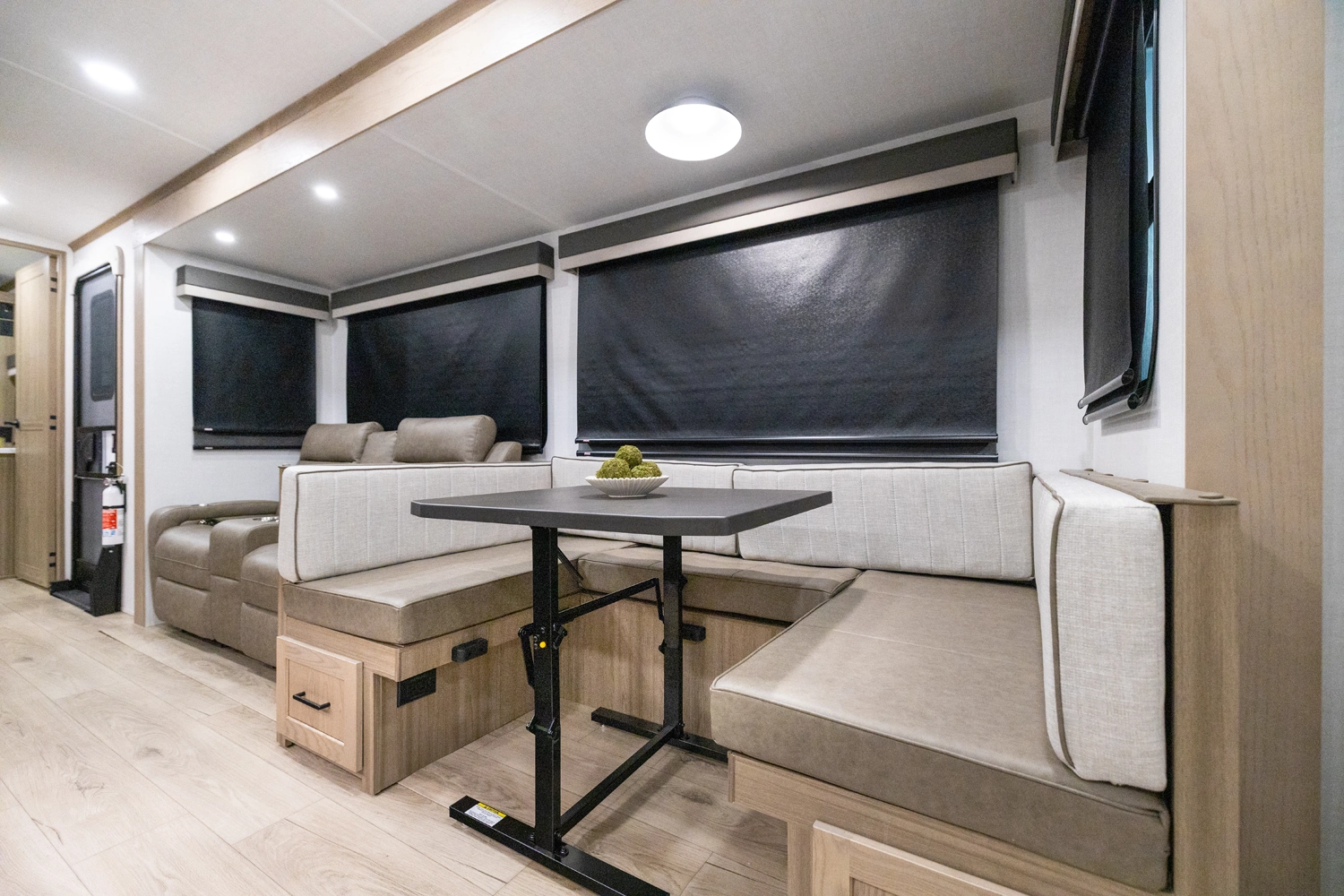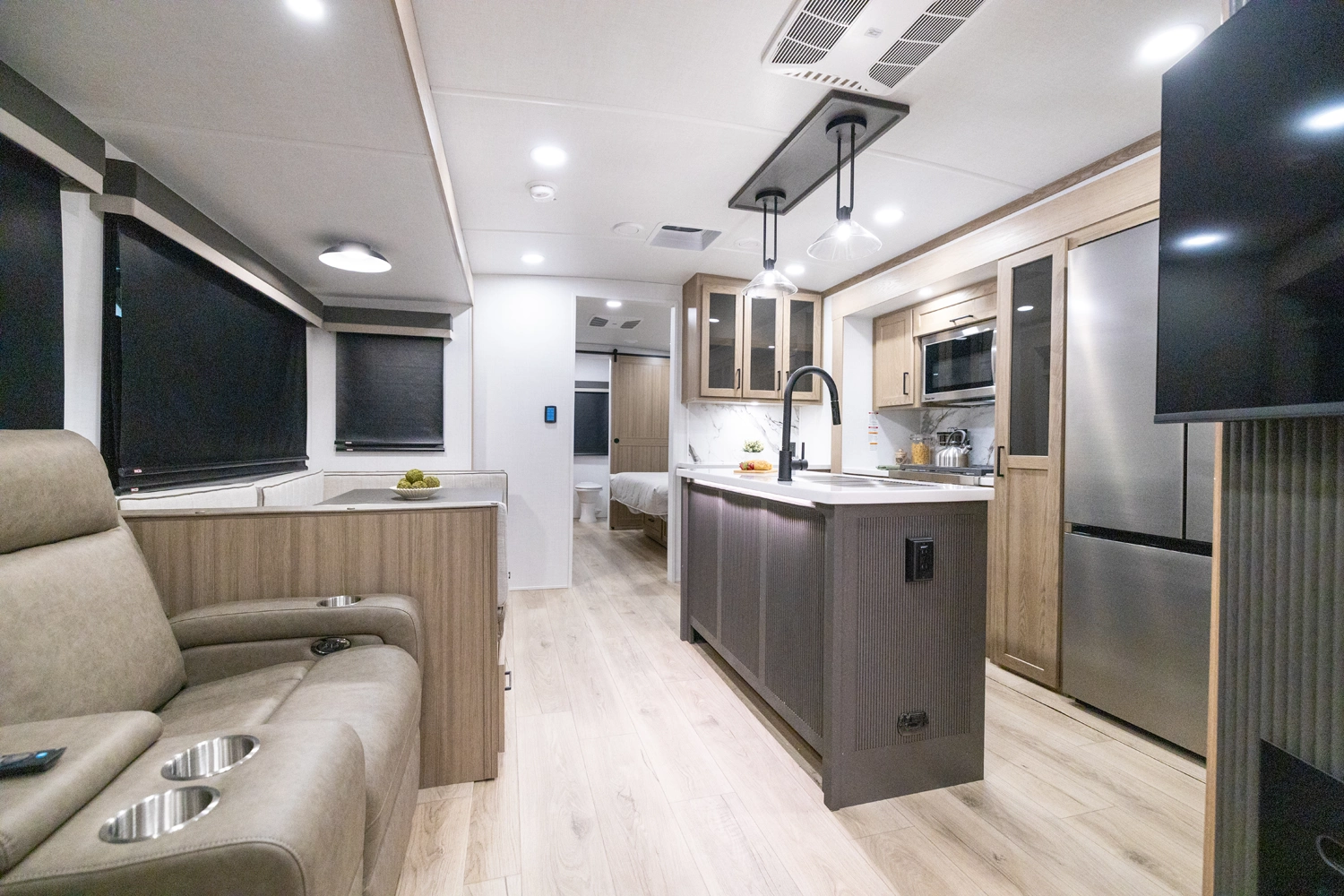 This spacious dual bedroom floorplan features a rear king suite with a full bath and a front queen bedroom with its own bath as well. Between them is a large open living area with a U-shaped dinette, theater seating, fireplace and well-equipped kitchen with an island. 4 slide outs widen the space, maximizing comfort and storage for families or couples.