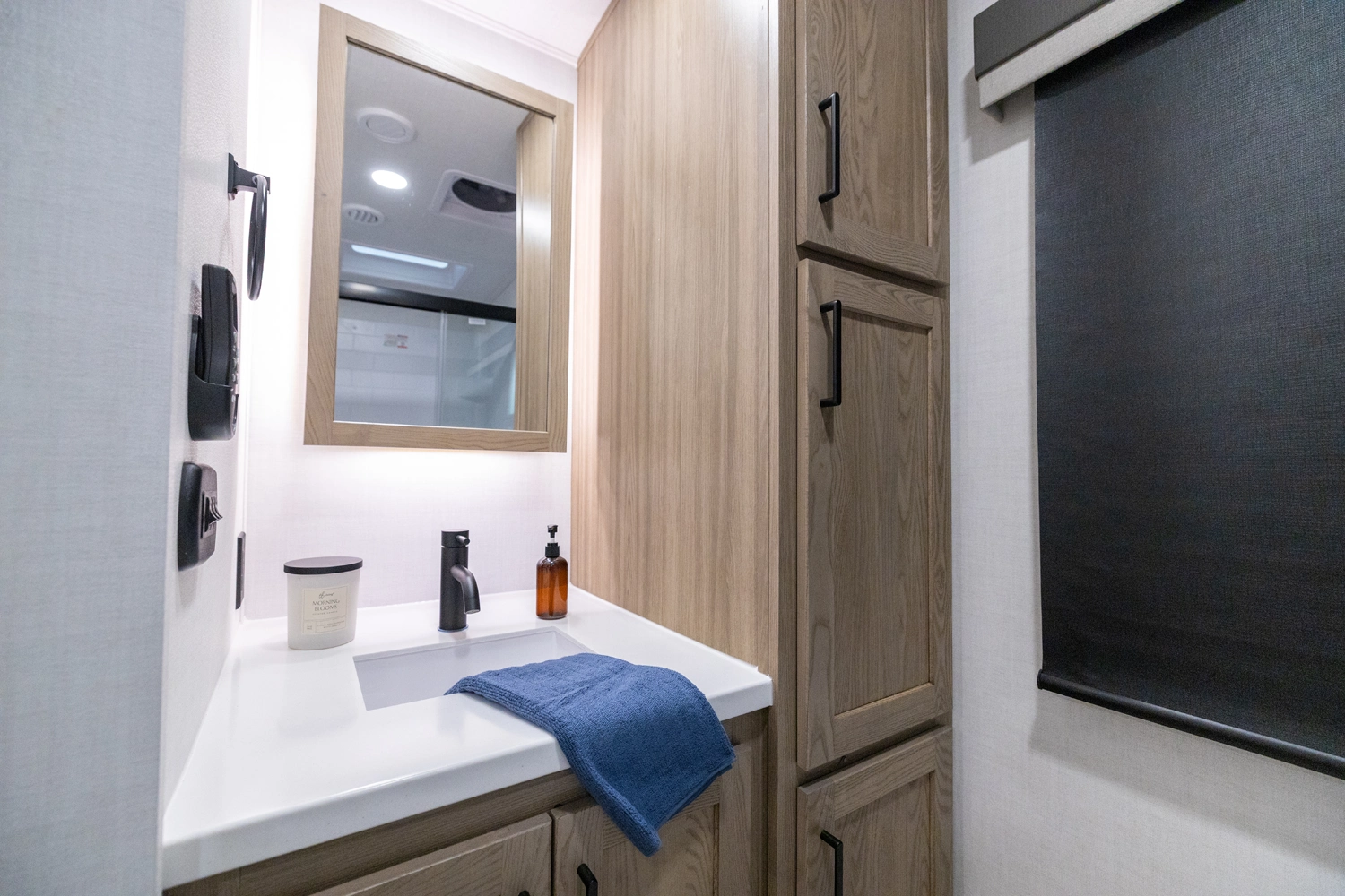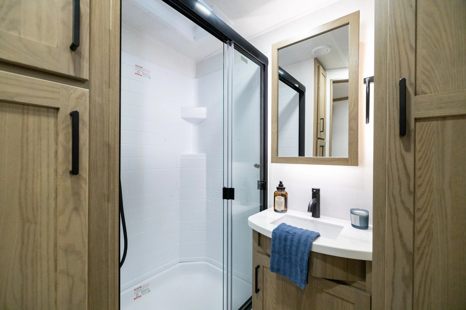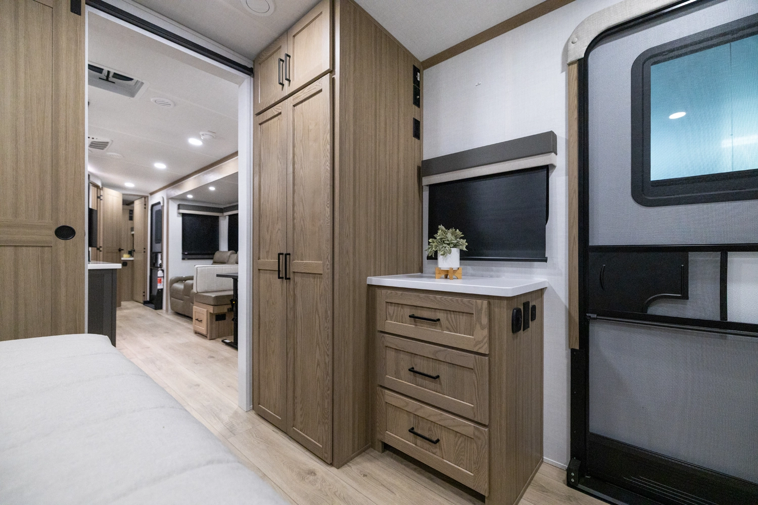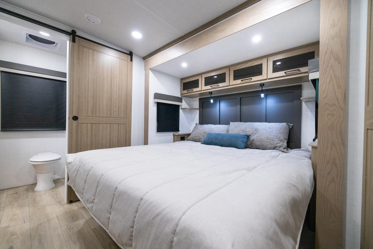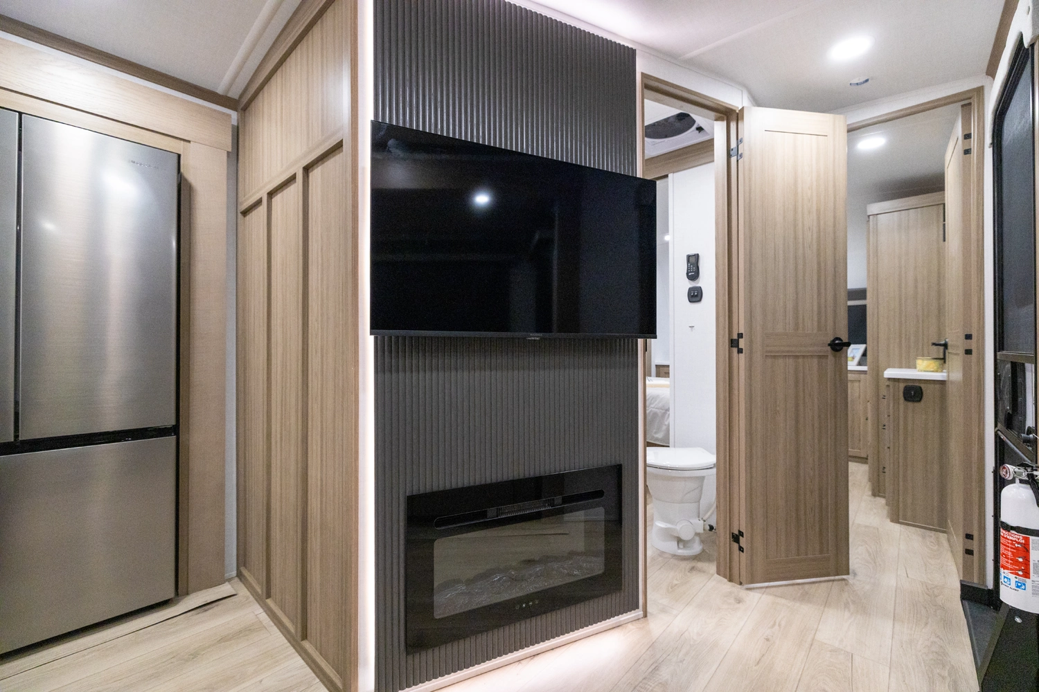 This spacious dual bedroom floorplan features a rear king suite with a full bath and a front queen bedroom with its own bath as well. Between them is a large open living area with a U-shaped dinette, theater seating, fireplace and well-equipped kitchen with an island. 4 slide outs widen the space, maximizing comfort and storage for families or couples.