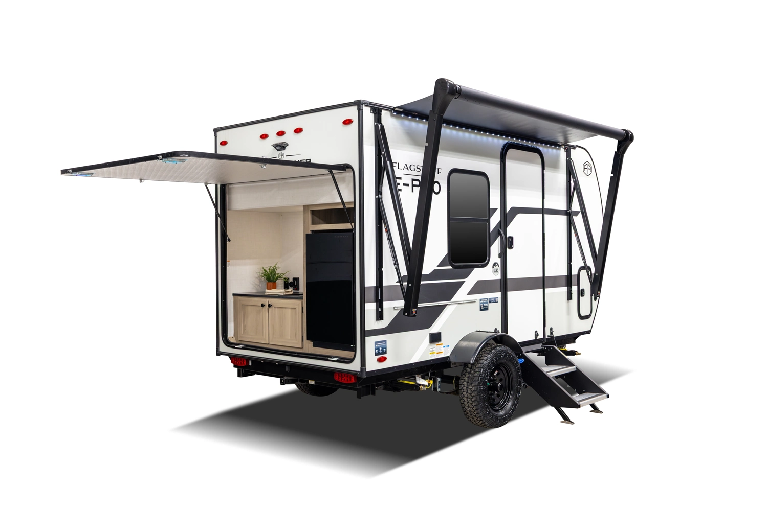 The E-Pro 11LE is an affordable lightweight camper designed for simple, practical camping. Built with aluminum framing and vacuum bonded walls and roof, it delivers durability without adding unnecessary weight. Inside, the massive 54" x 91" U-shaped dinette converts into a spacious sleeping area, while two interior bunks provide additional sleeping space. A convenient rear outdoor kitchen makes cooking at the campsite simple and easy.