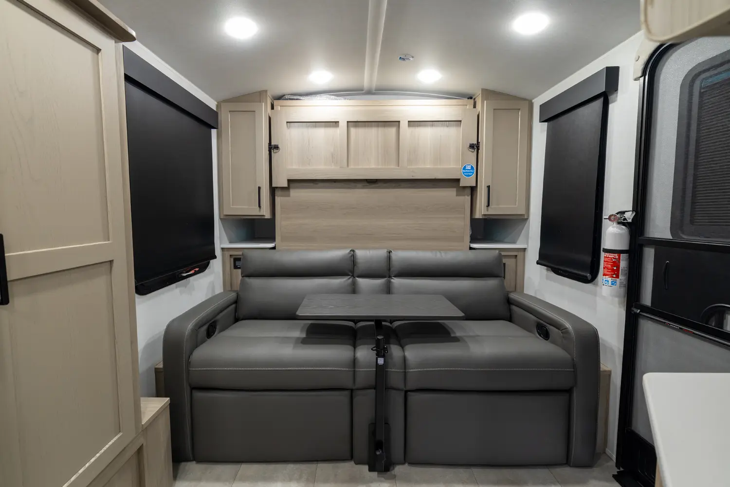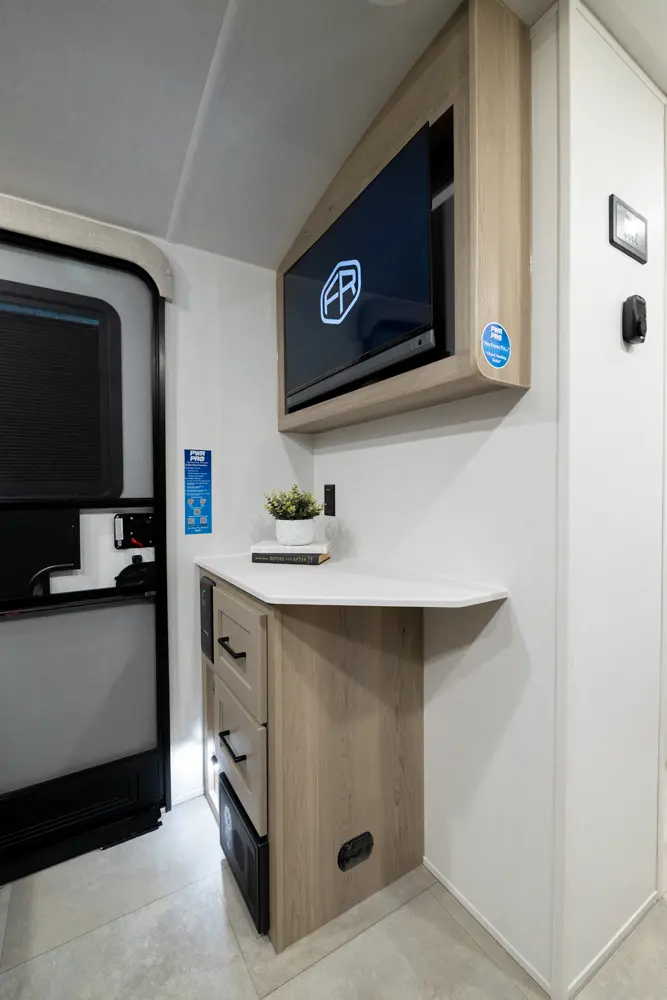 The Flagstaff E-Pro 15FBS delivers a smart, space-efficient layout and a compact, easy-to-tow trailer. The Murphy bed quickly converts into a comfortable sofa, giving you both living and sleeping space. A functional rear kitchen offers solid prep space and storage, while the large side bathroom features a squared shower providing extra comfort and room not often found in trailers this size.