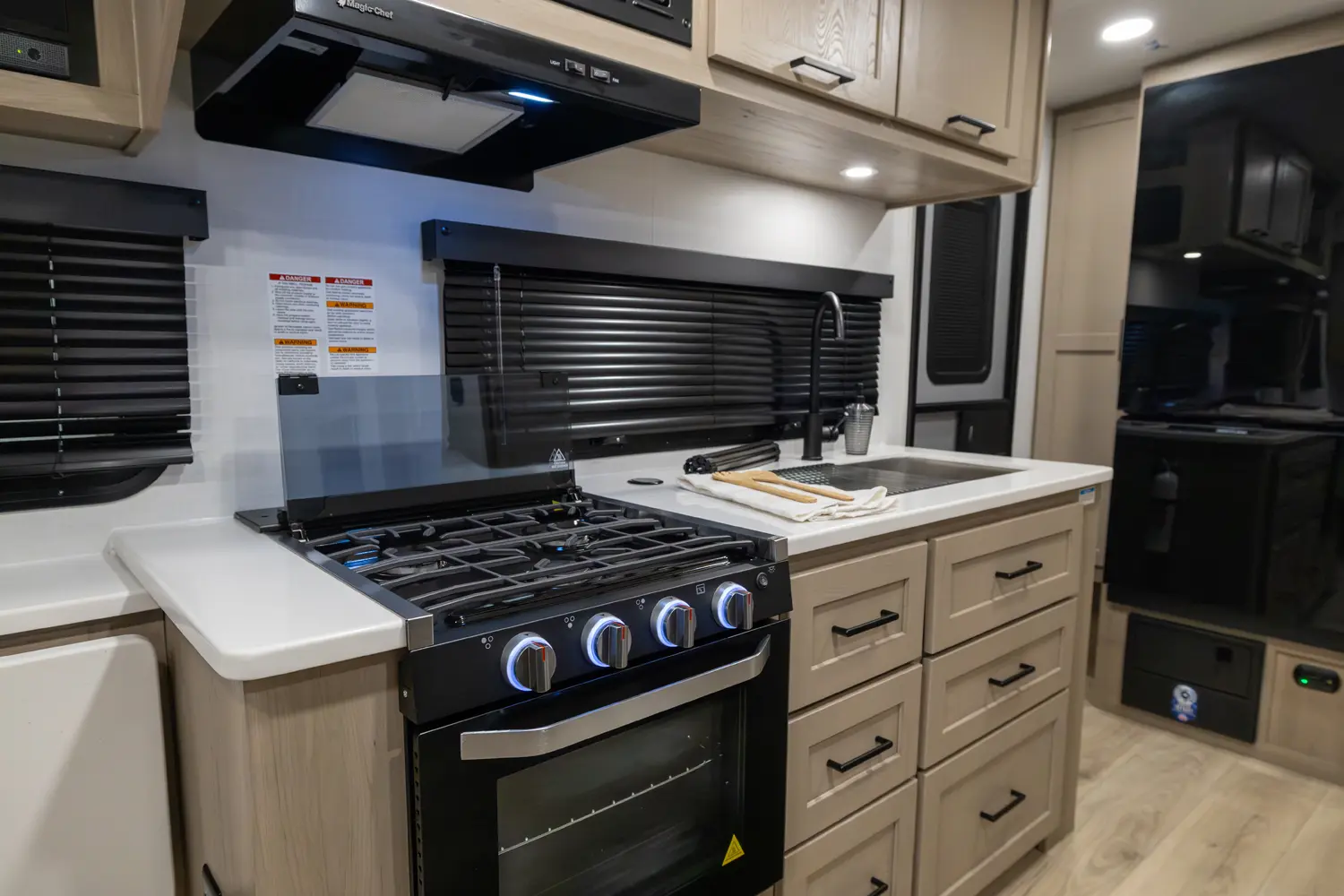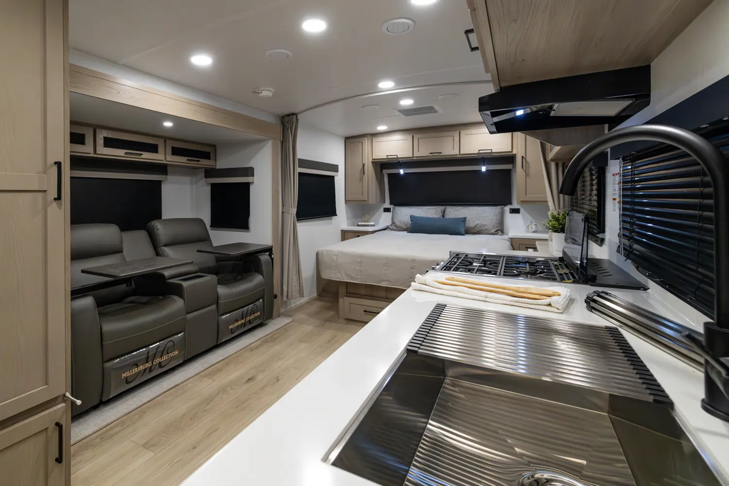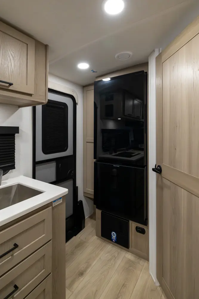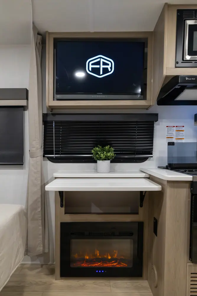 This revised floorplan features wide open living space and a drop frame for large front pass through storage. The baggage door on the front pass through is 30” by 24” which will accommodate all your camping accessories. The floor space in this unit caters to pet-friendly campers with room for kennels and large animal sleeping areas. If you and your pet want to cuddle up next to a nice warm fireplace with some family members on the theater seating, this is the unit for you.