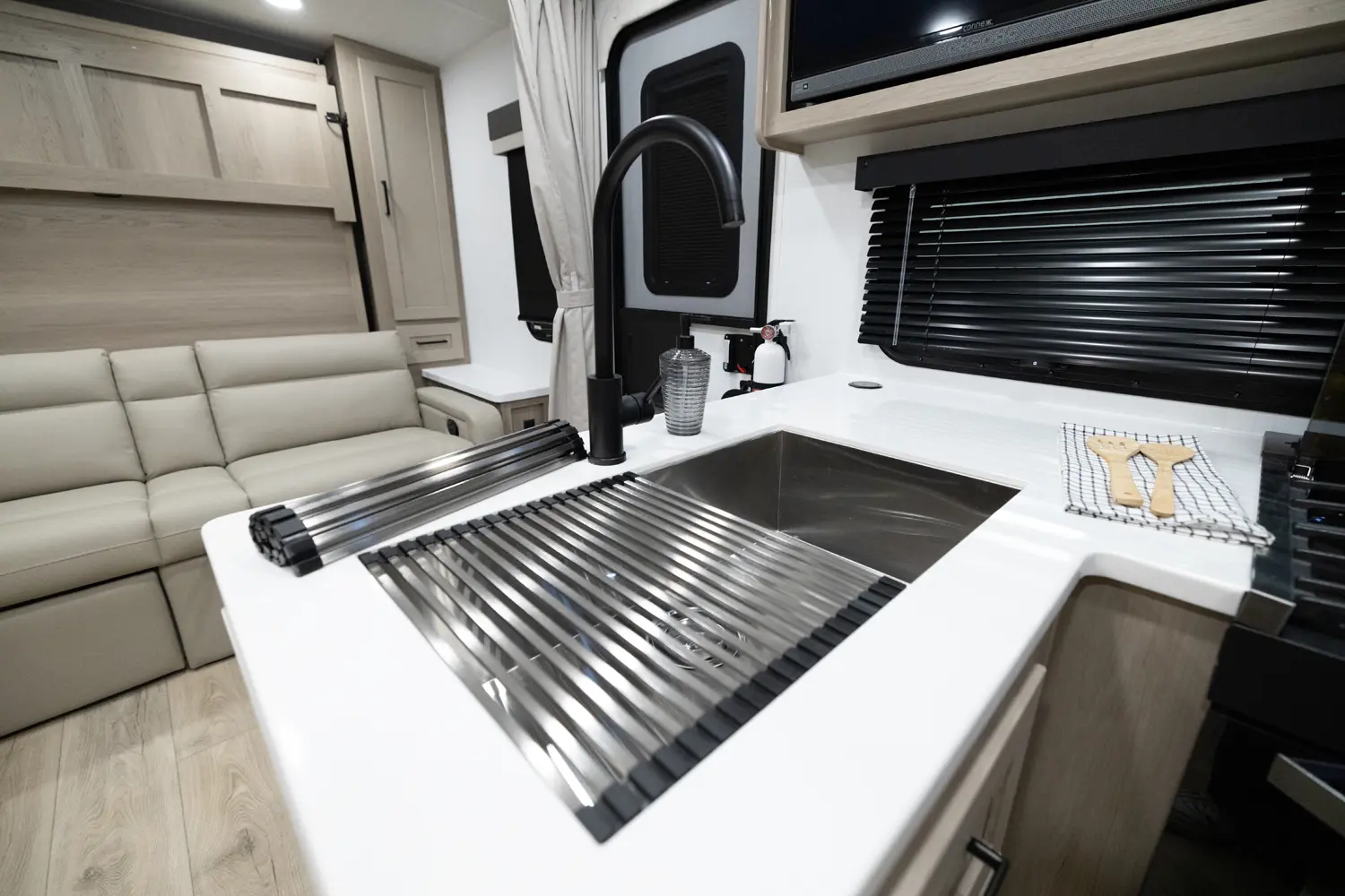 The 25FBH is built for comfort and family fun, featuring a private rear bunk room that gives kids (or guests) their own space. In the main area, you’ll find a massive U-shaped dinette perfect for meals and lounging, plus a front Murphy bed that easily converts to maximize living space. A large rectangular shower in the bathroom adds everyday convenience, making the 25FBH a great choice for families who want room to relax and recharge on every adventure.