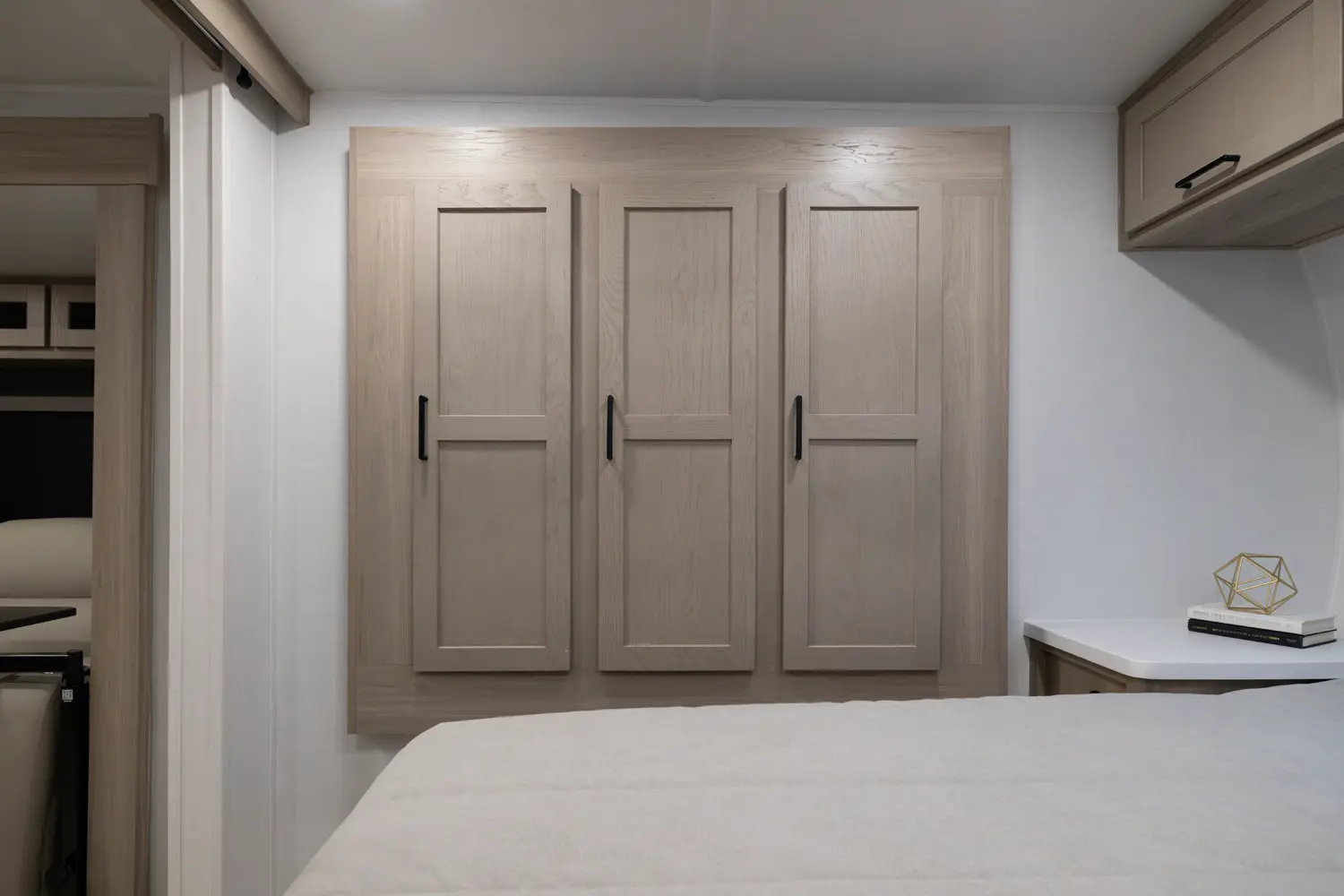 This unit is unique with its big 36" sliding doors leading to the bathroom and bedroom. These doors make moving around for a broad shouldered person easier and comfortable. The entertainment center is loaded with 32" tv, a residential-style soundbar and a fireplace space heater. Across from this lovely entertainment center is a 72" theatre seating which is perfect for reclining and watching a good movie.