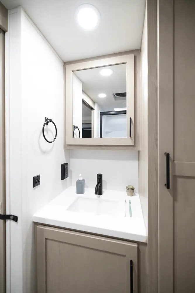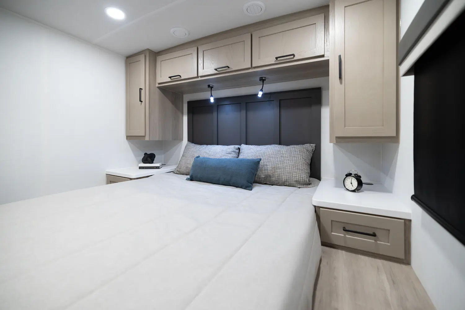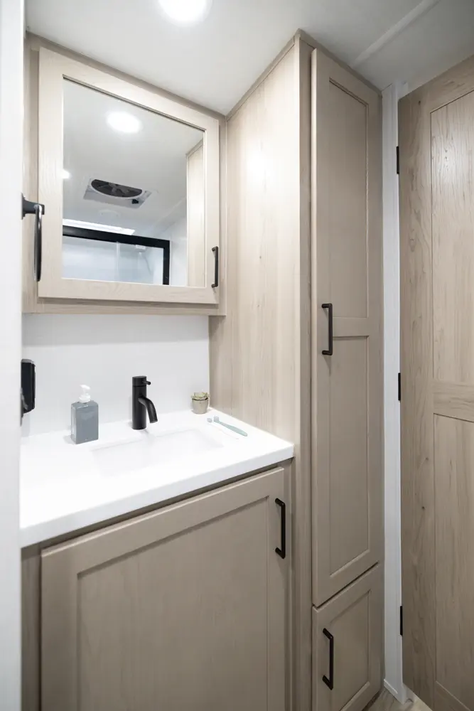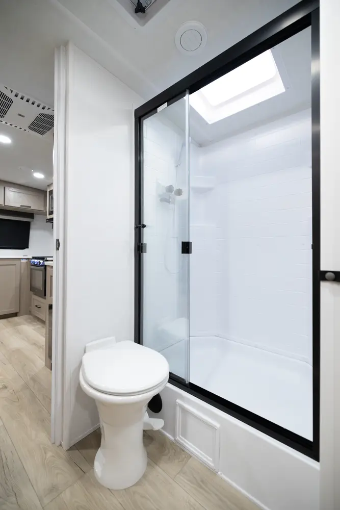 The 25FKB blends spacious comfort with smart design for a great value. The front kitchen offers abundant counter space and storage, perfect for meal prep and entertaining. The U-shaped dinette provides a roomy dining area that can convert to extra sleeping space. (optional Hide-a-Bed or Theater seating) The pass-through bathroom comes equipped with a large rectangular shower, and the rear bedroom gives you a private retreat on the road.