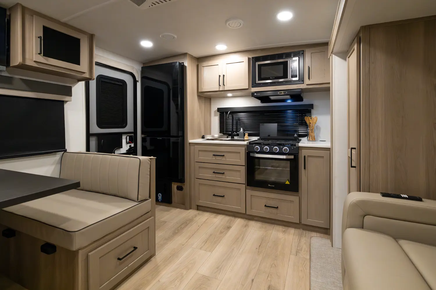 The 25SRK offers a spacious convenient layout with two entry doors providing easy access to the kitchen, bedroom, and bathroom, all while the slides are retracted. The rear kitchen features ample counter space while the living area includes a U-shaped dinette and theater seating. (optional hide-a-bed) The wardrobe slide adds generous storage making this a perfect choice for families or couples seeking flexibility and functionality on the road.