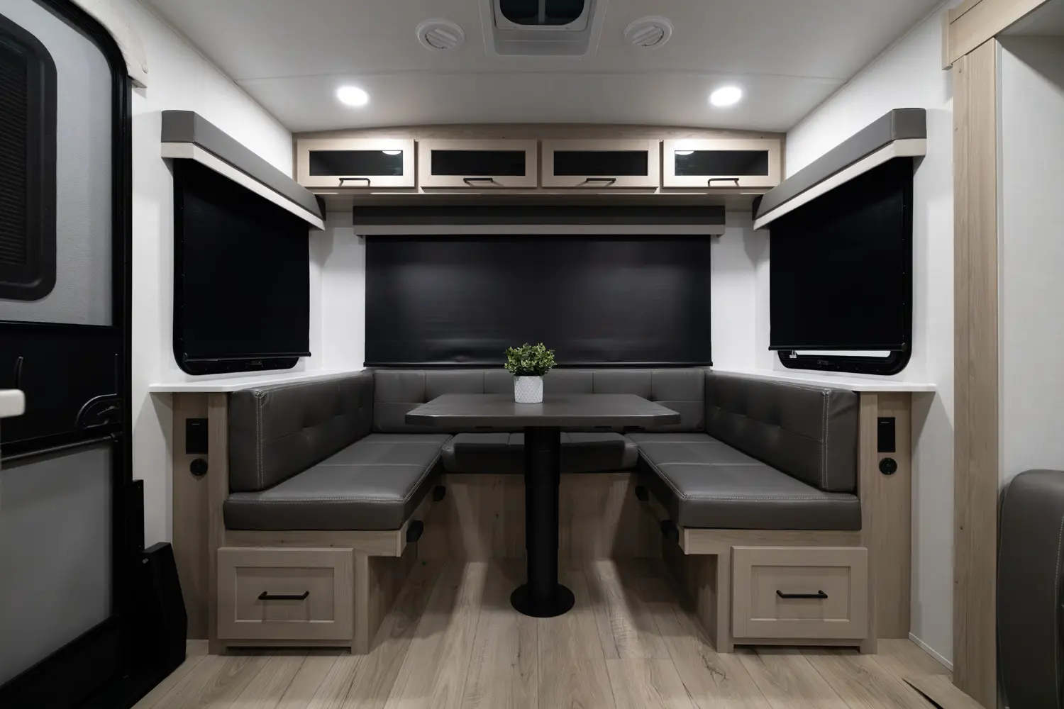 The Flagstaff 26SRD Super Lite features a front bedroom with a true queen bed and wardrobe slide. Two entry doors provide easy access to the bedroom, large pass-through bathroom, and kitchen even when the slides are in. The rear U-shaped dinette and 67" theater seat create a spacious, comfortable living area, making the 26SRD perfect for couples or small families.