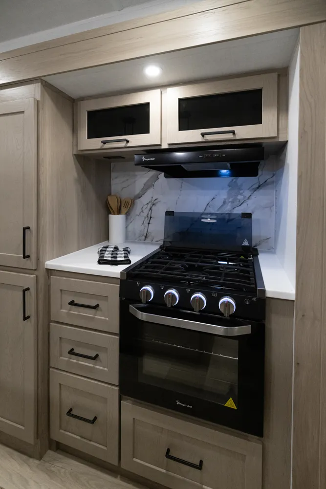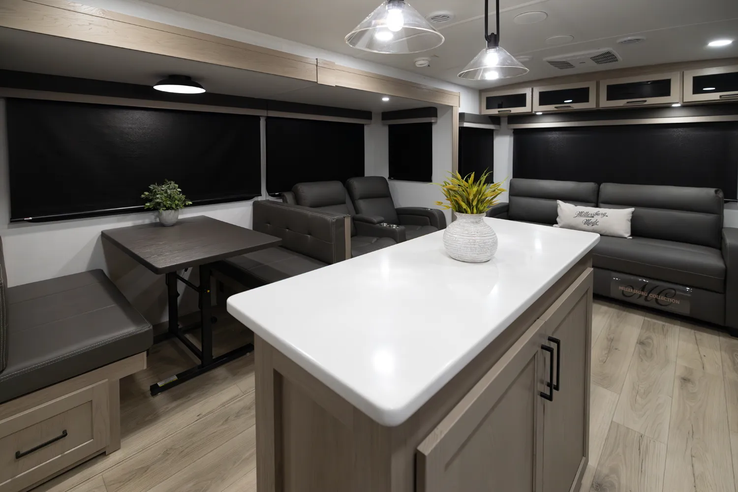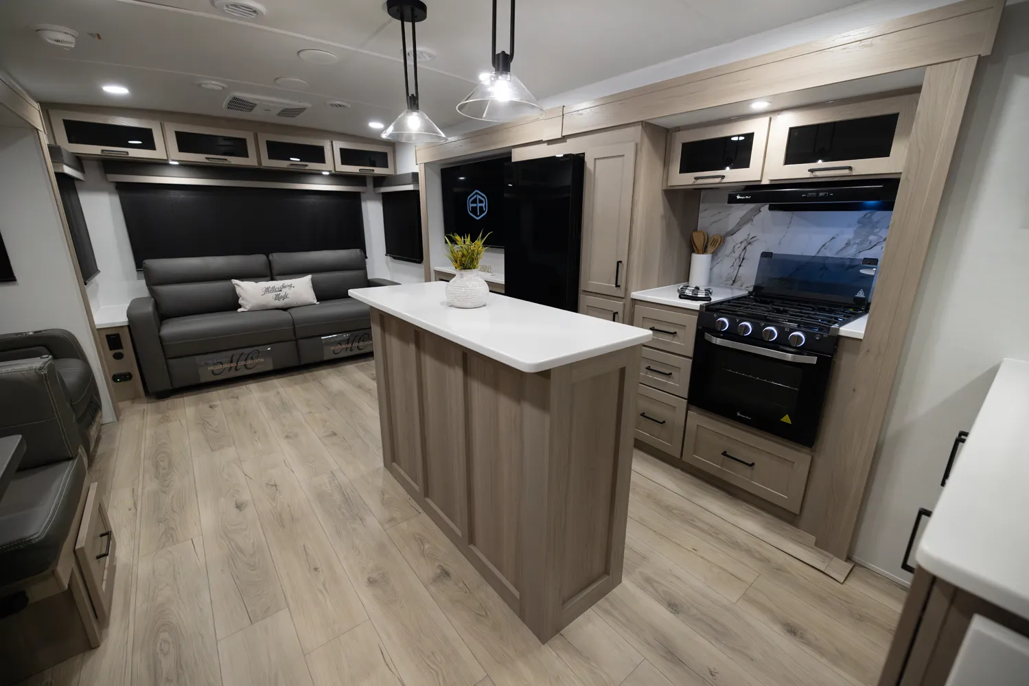 • Platinum Package: Auto Leveling, Frameless Windows, 1800W Inverter, MORryde Strut Assist Entry Step, Dual 30 LP Tanks