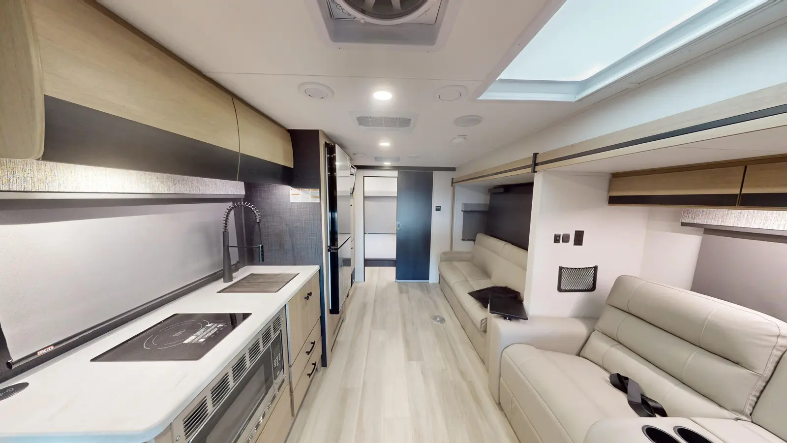 The Forester 2401T is a unique floorplan that features a Murphy bed for comfortable sleeping space at night, and a sofa with a removable table for daytime.The kitchen offers a 10.7 cu. ft. 12V refrigerator, a convection microwave, a recessed three-burner range, soft touch self-closing drawer guides and a cordless 12V charging plate, while the spacious rear bath includes a 24" x 36" skylight shower, commode, and vanity sink with a medicine cabinet.