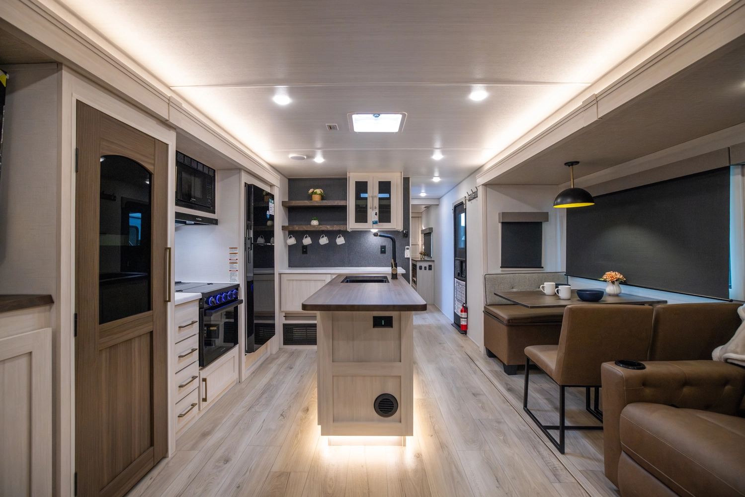 This 38' 10" travel trailer features a front private bedroom with a king bed and ample storage. The rear living area includes a sofa, theater seating, and a fireplace. The kitchen boasts a central island with sink, pantry, and a 10 cu. ft. 12V refrigerator with oven and stovetop. Exterior features include dual electric awnings, outdoor camp kitchen, and a hot & cold spray port.