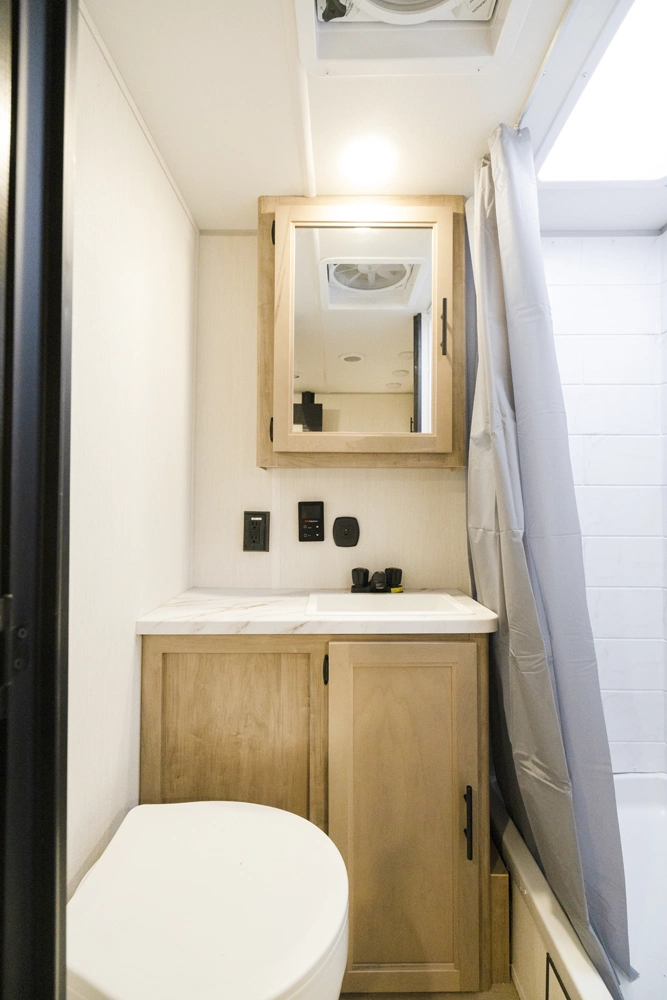 The Grey Wolf 22CE by Forest River is a stylish and functional travel trailer. Its open-concept design, featuring a bedroom, living room, and kitchen seamlessly blended together, maximizes space and creates a spacious feel. The 22CE offers a full bathroom, a large pantry, a 12-volt refrigerator, an air fryer combo microwave, and a king-size bed for ultimate comfort. The convertible dinette and sofa provide additional sleeping options, making it perfect for family trips or entertaining guests.