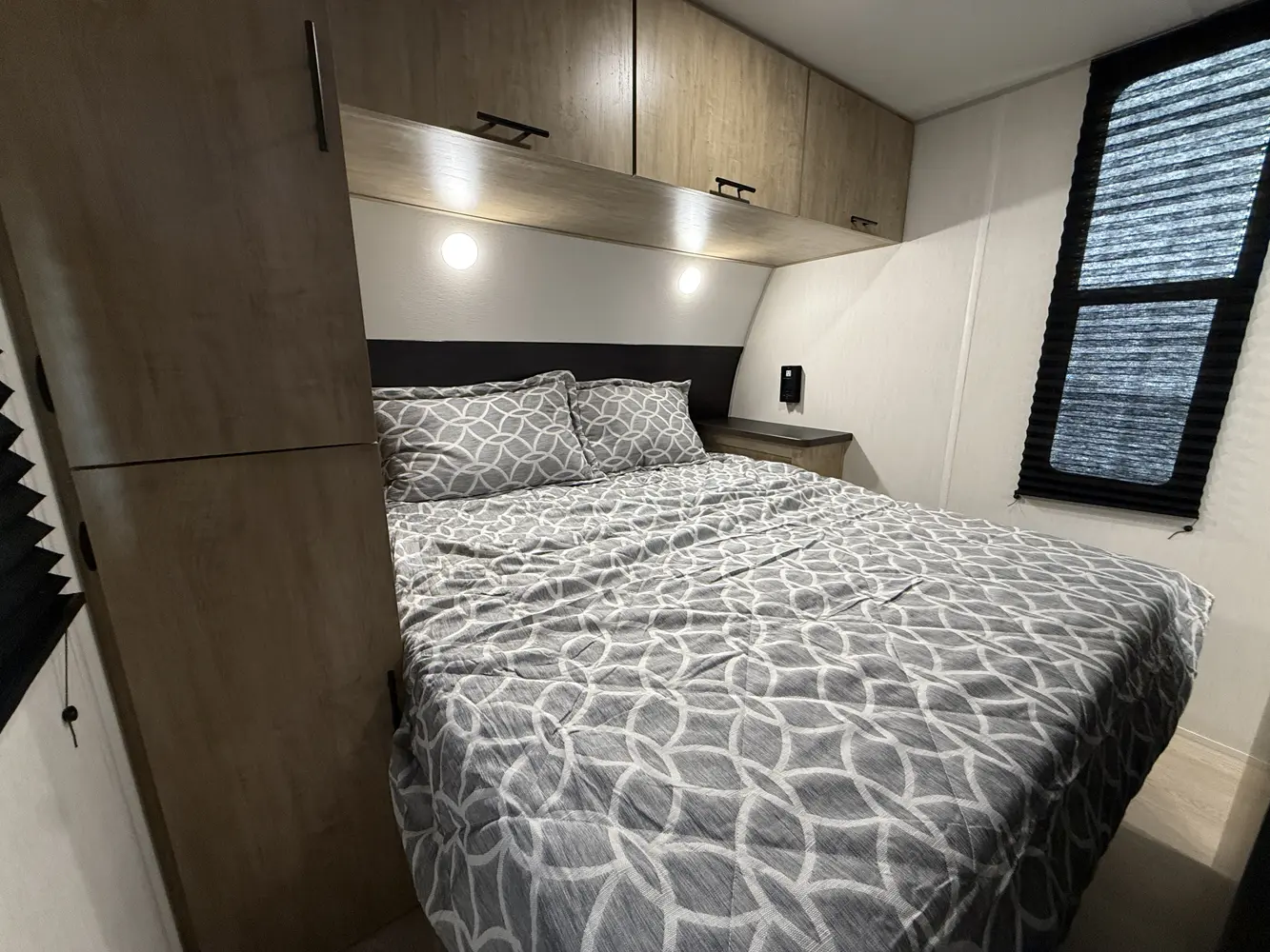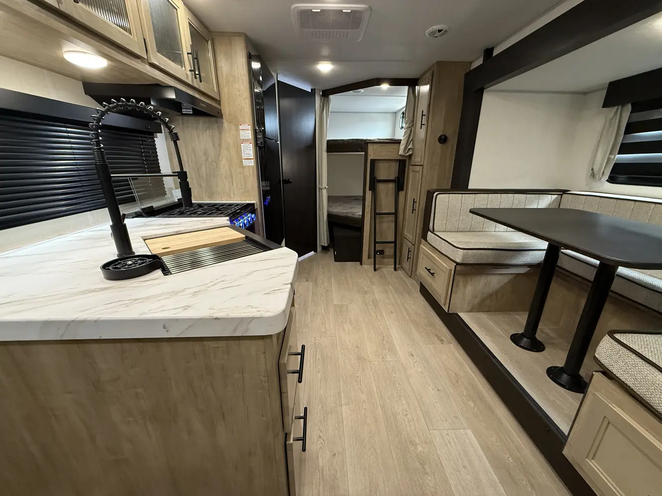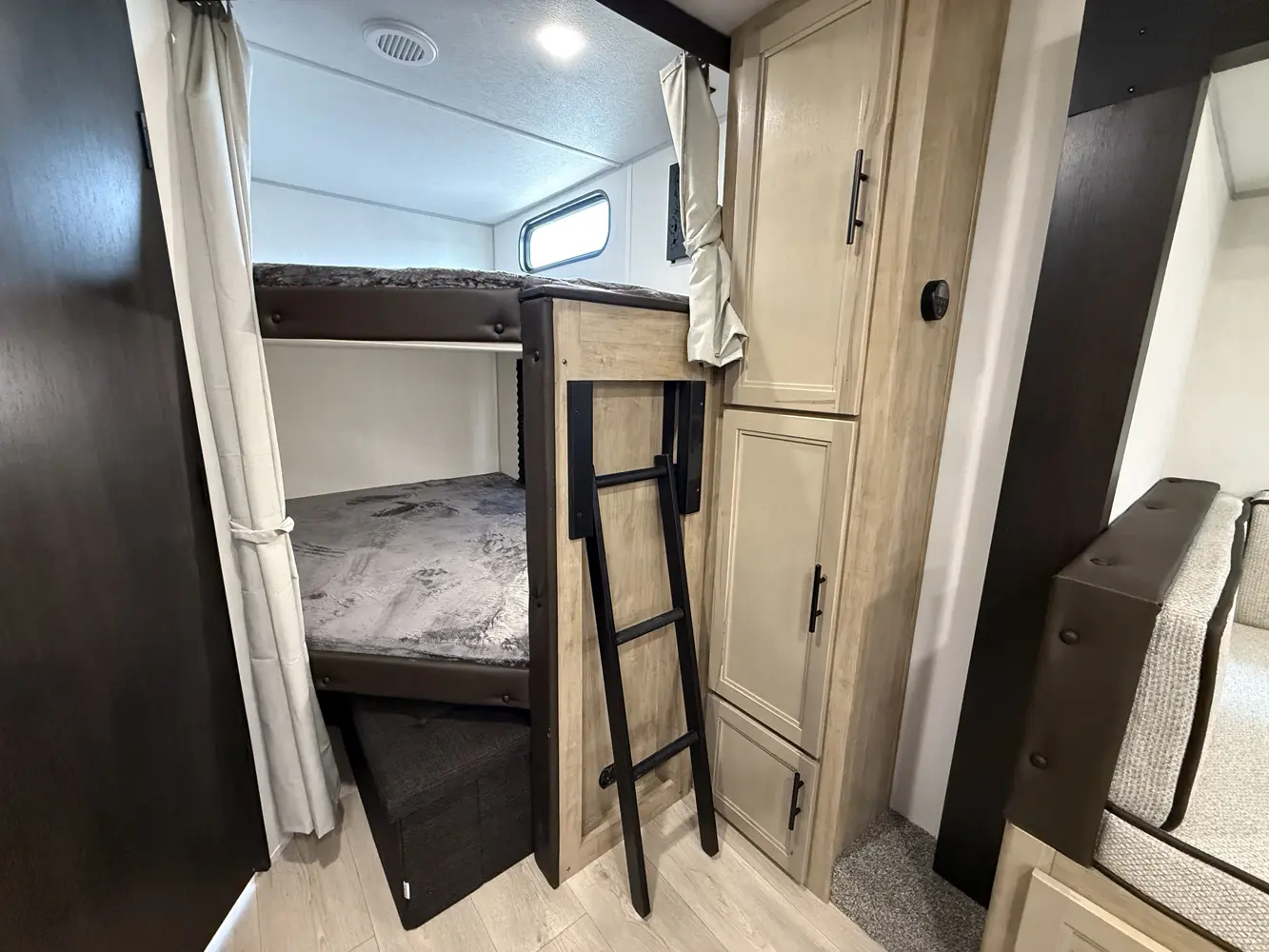 The Grey Wolf 23DBH by Forest River is a family-friendly travel trailer, perfect for camping adventures. The spacious bunkhouse, with a large double bunk, provides plenty of sleeping space for kids. The double entry doors offer convenient access to the bathroom and kitchen. The well-equipped kitchen, with its modern appliances and large U-shaped dinette, provides ample storage and dining space. The private master suite, with a queen-size bed and ample storage, offers a peaceful retreat.