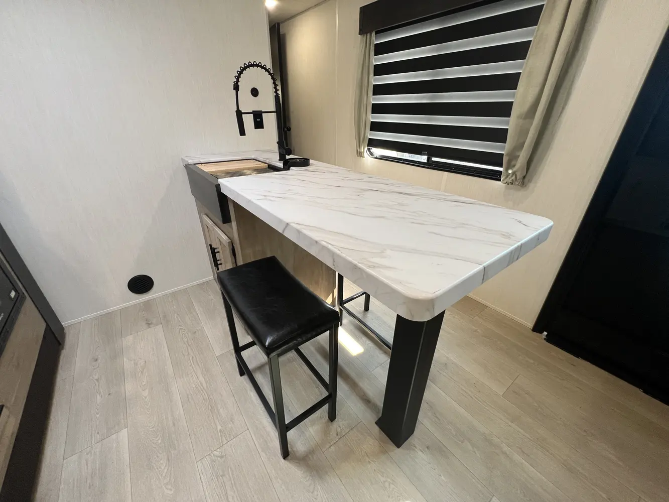 The Cherokee Grey Wolf 27LH by Forest River is a stylish and functional travel trailer with a focus on affordability, perfect for modern camping. Despite its compact 33-foot, 6-inch length, the 27LH feels incredibly spacious, thanks to its residential-style sofa and large windows that flood the interior with natural light. The bedroom is also impressive with a king size bed and plenty of wardrobe space.