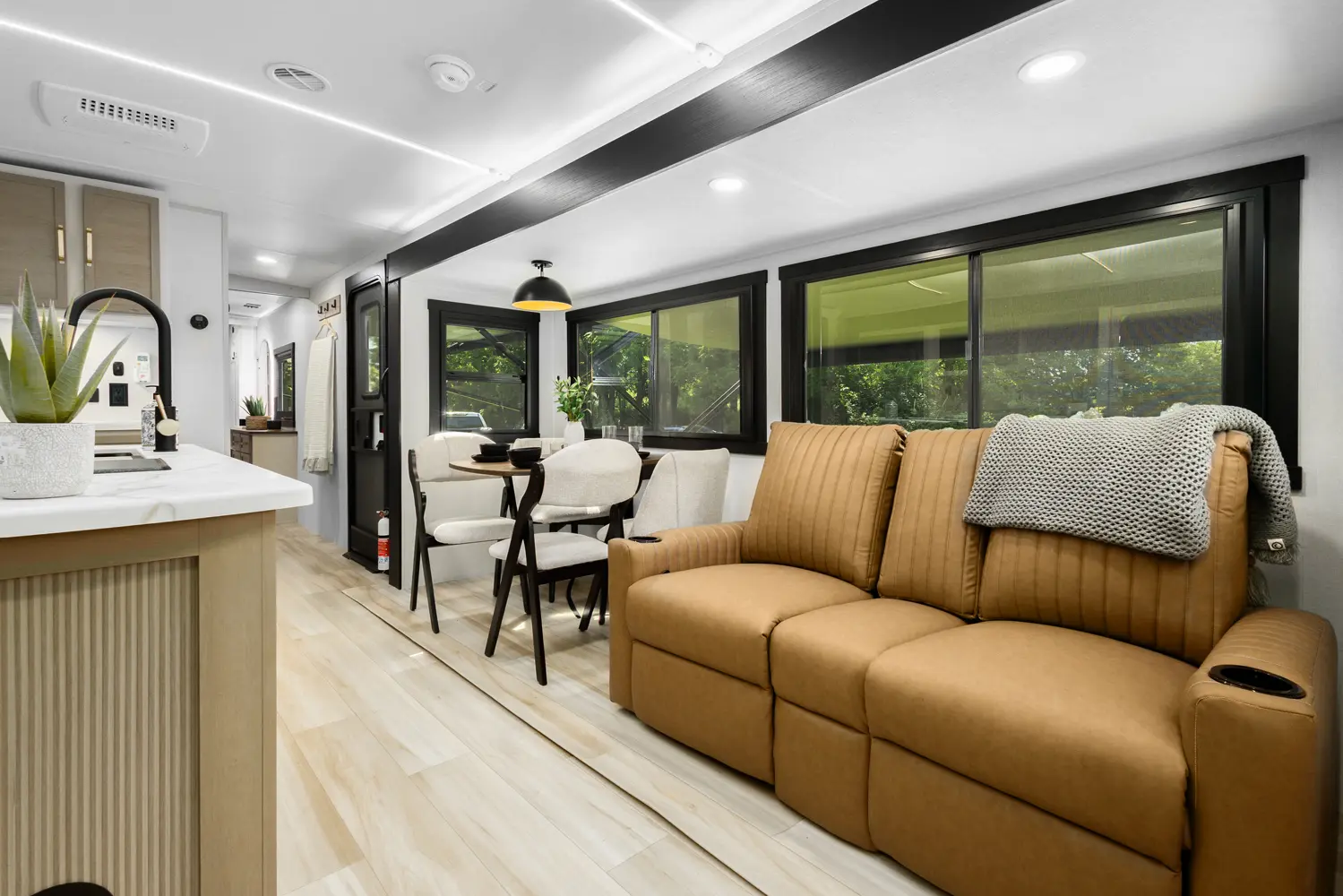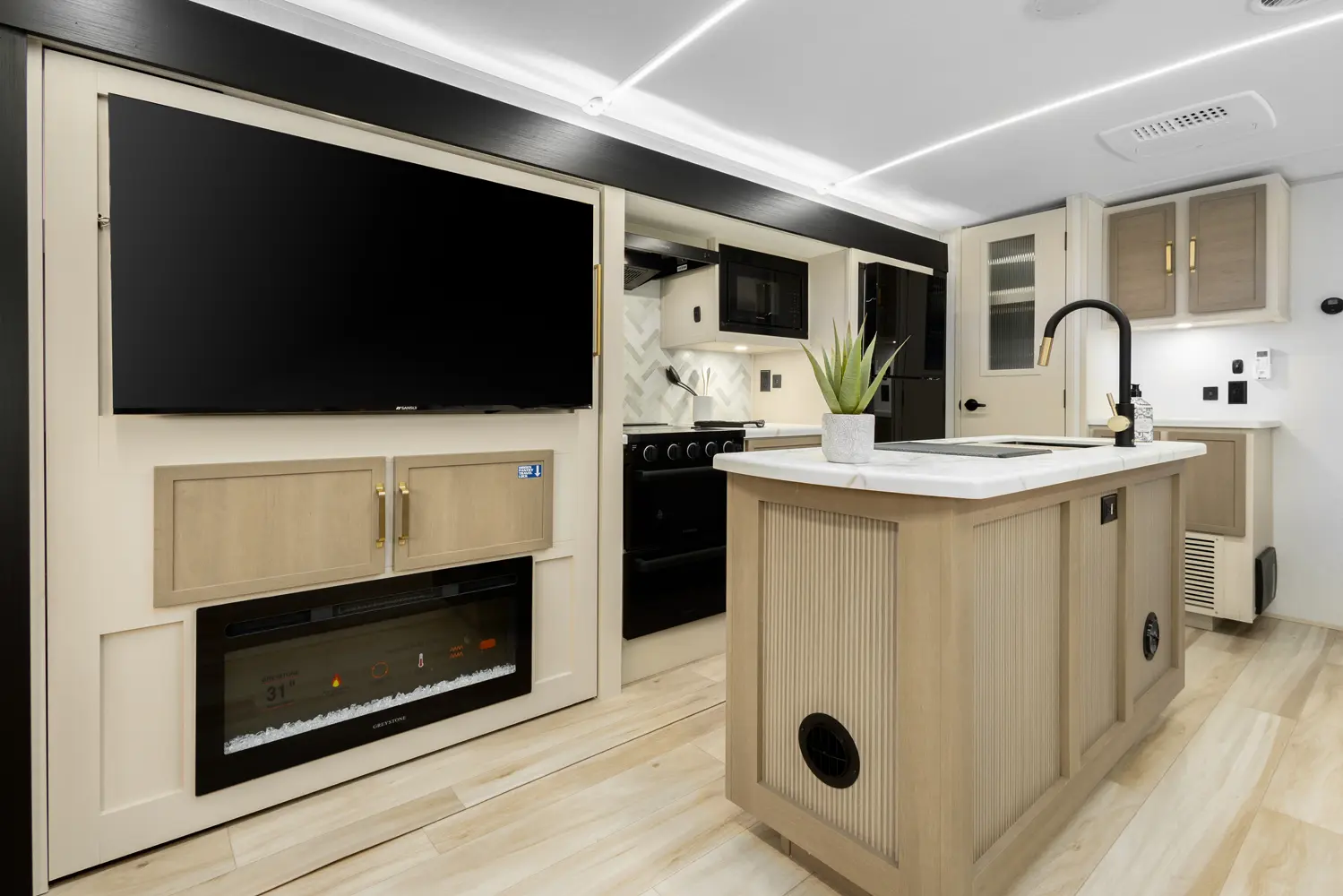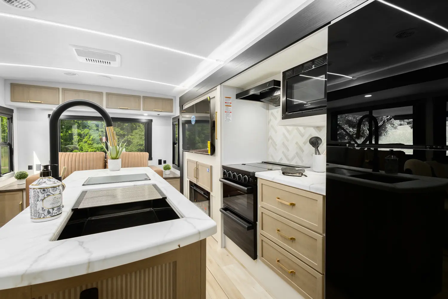 Touting 3 slide-outs, the 308RL is the most spacious Hemisphere Travel Trailer for coupes. Enjoy a breath-taking view of your campsite in the living room or relax in the wide-open bedroom. Past the bedroom you'll find a WALK-IN wardrobe, and washer/dryer prep area spacious enough for separate washer & dryer. (This is the only model without a windshield, because we didn't think your laundry would care to see outside).