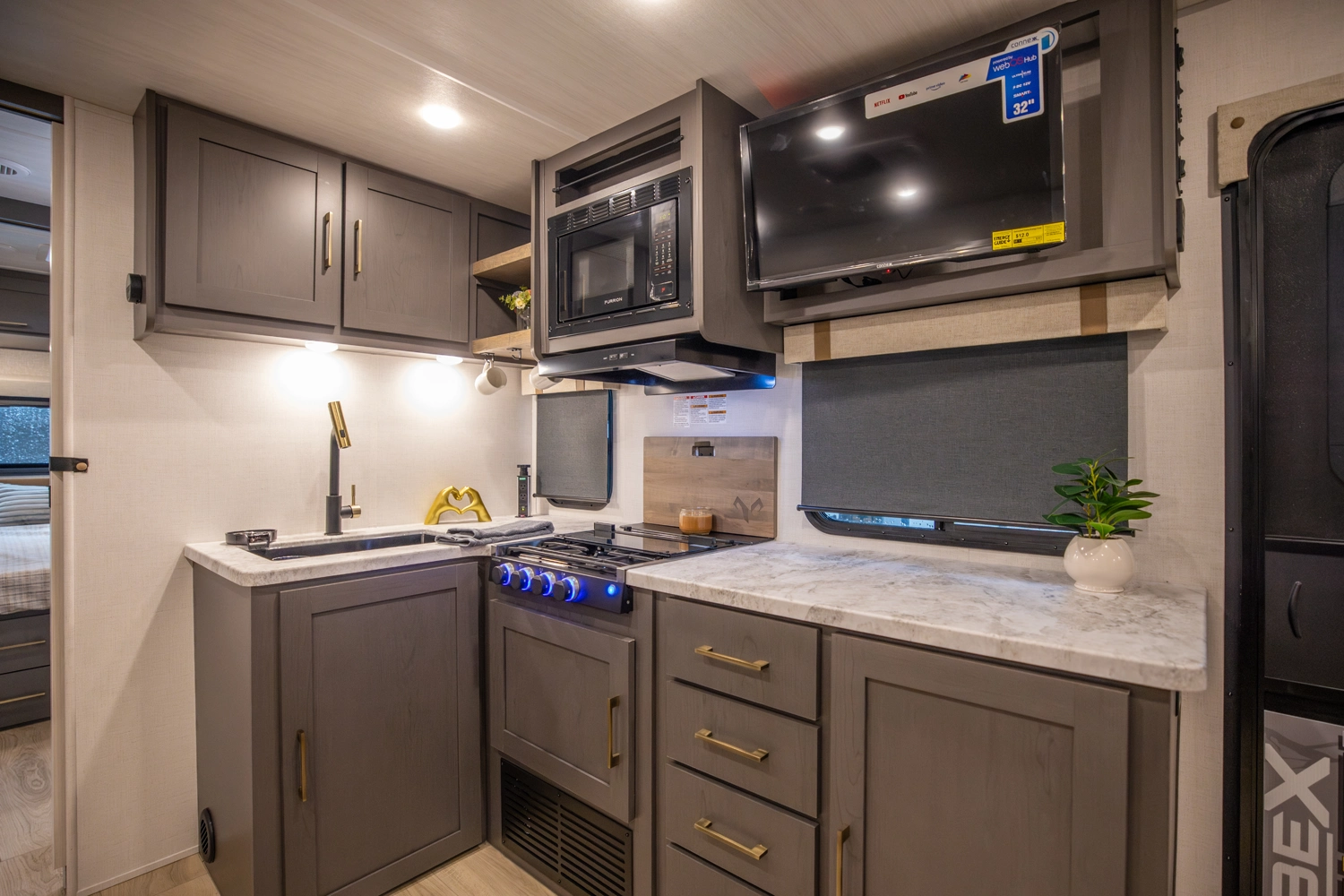 The 25RLSS front master bedroom features a queen-sized bed with dual wardrobes, providing ample storage space. The walk-through bath offers convenient access from both the living area and the bedroom. The rear living space boasts a tri-fold sofa slide-out and a booth dinette, creating a comfortable area for relaxation and dining. The well-equipped kitchen includes a microwave air fryer, refrigerator and large pantry. Exterior features like 12V heated pads and a 19' awning complete this coach.