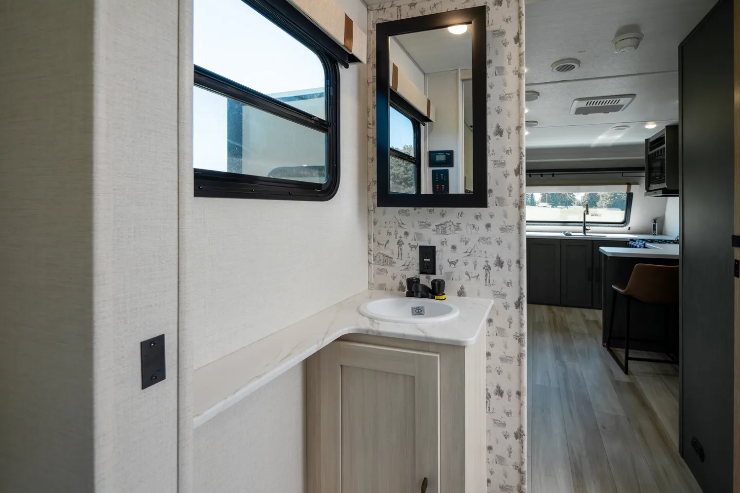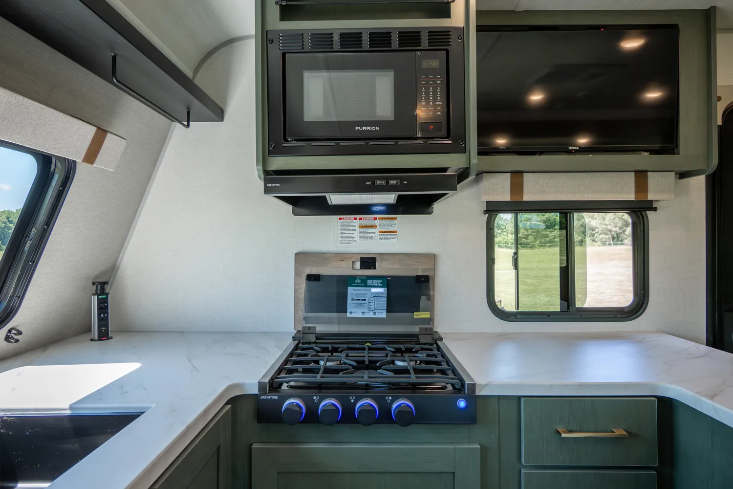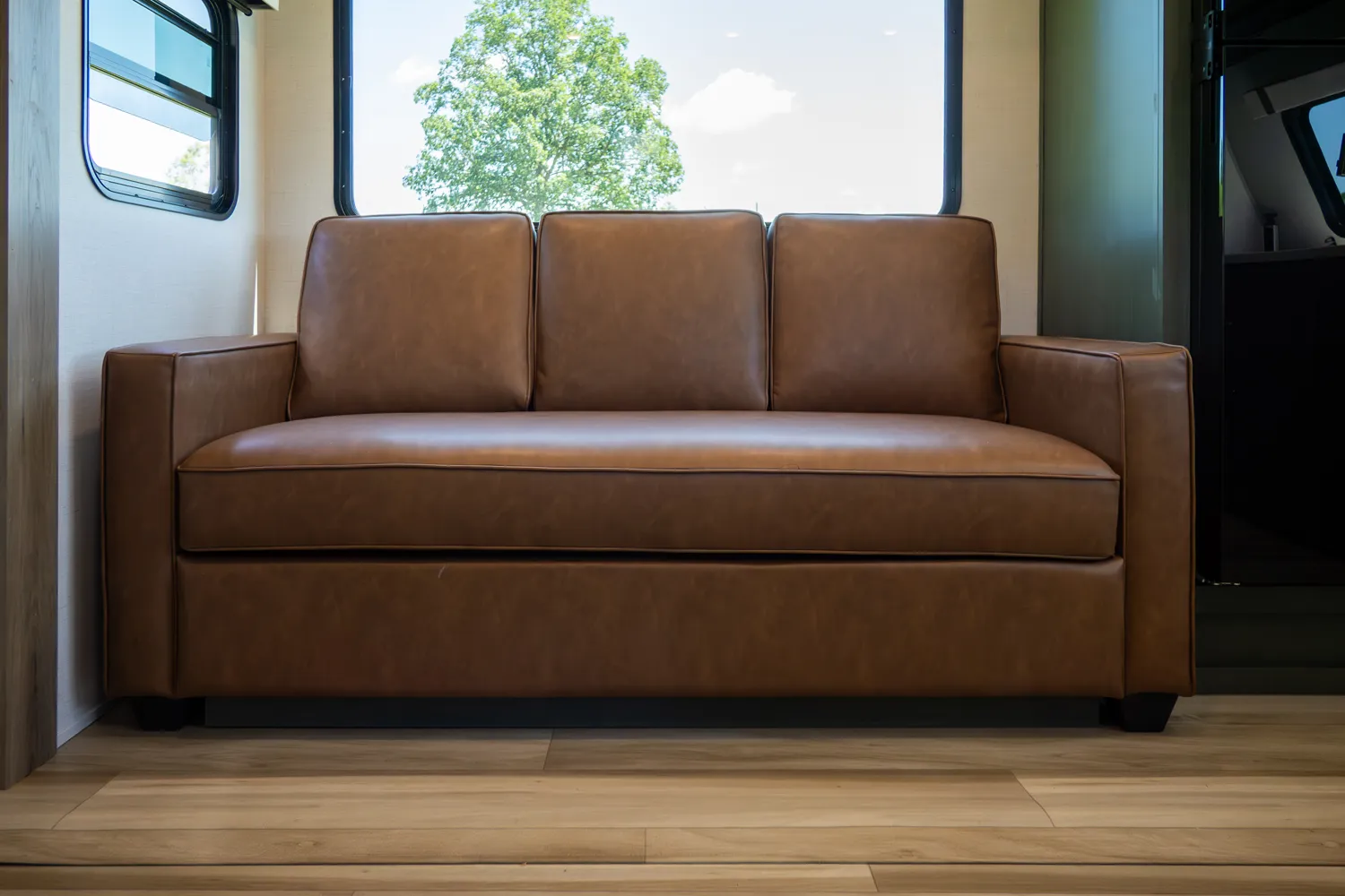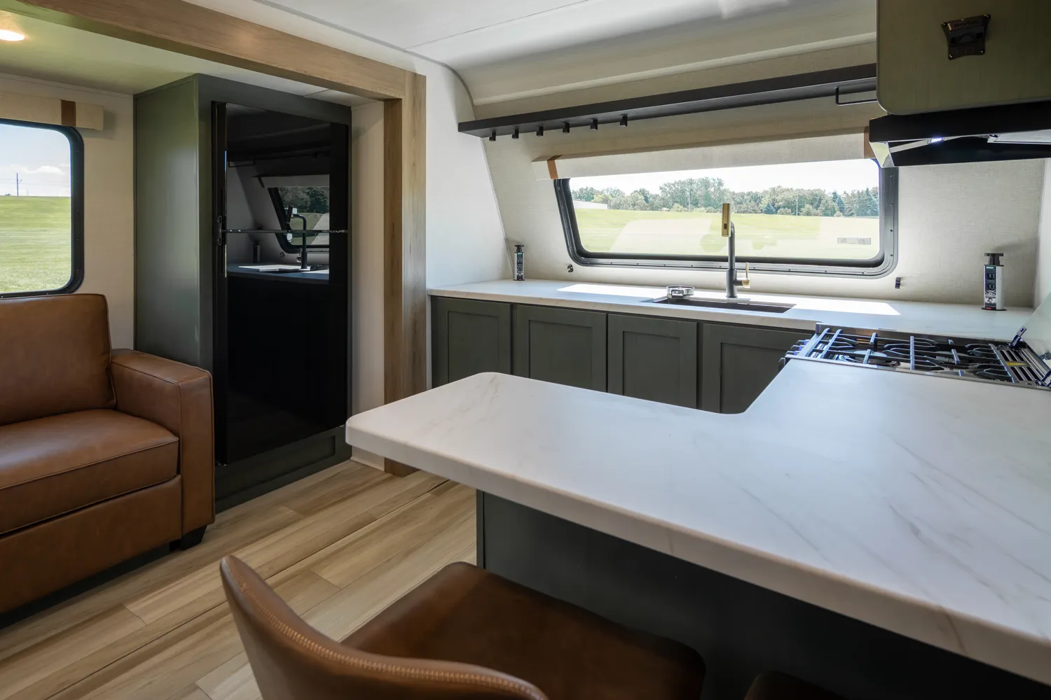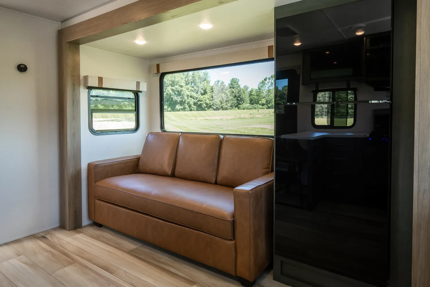 Thoughtfully designed, this travel trailer features a front kitchen with breakfast bar, tri-fold sofa slide-out, walk-through bath, and rear queen bedroom with ample storage. Built for extended-season use with heated enclosed underbelly and radiant foil insulation, it also includes a 19' awning to expand your outdoor living space.