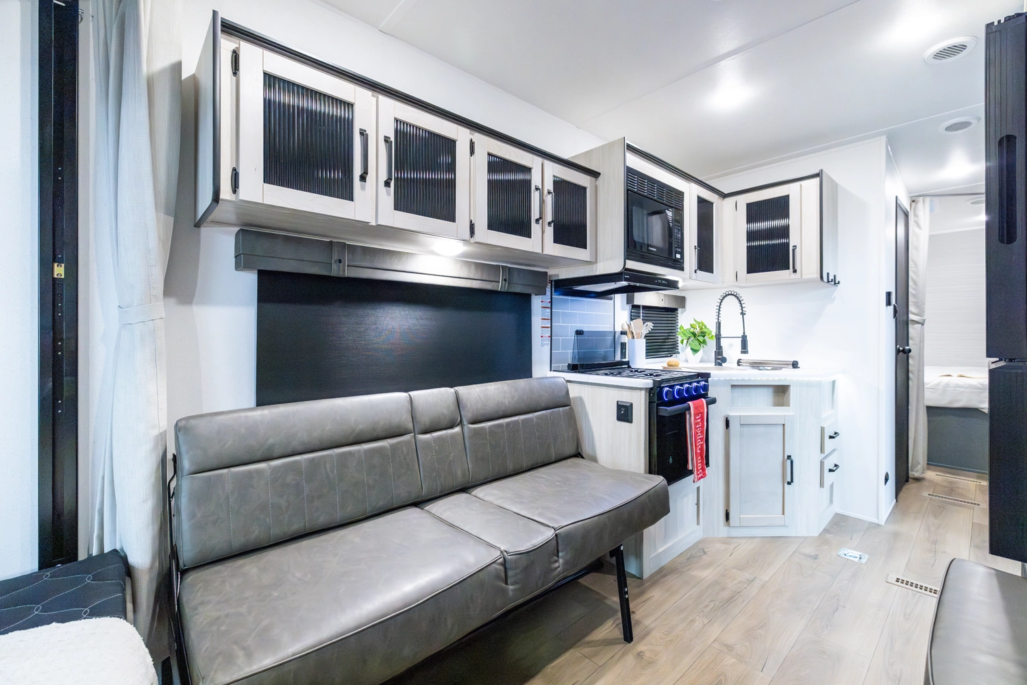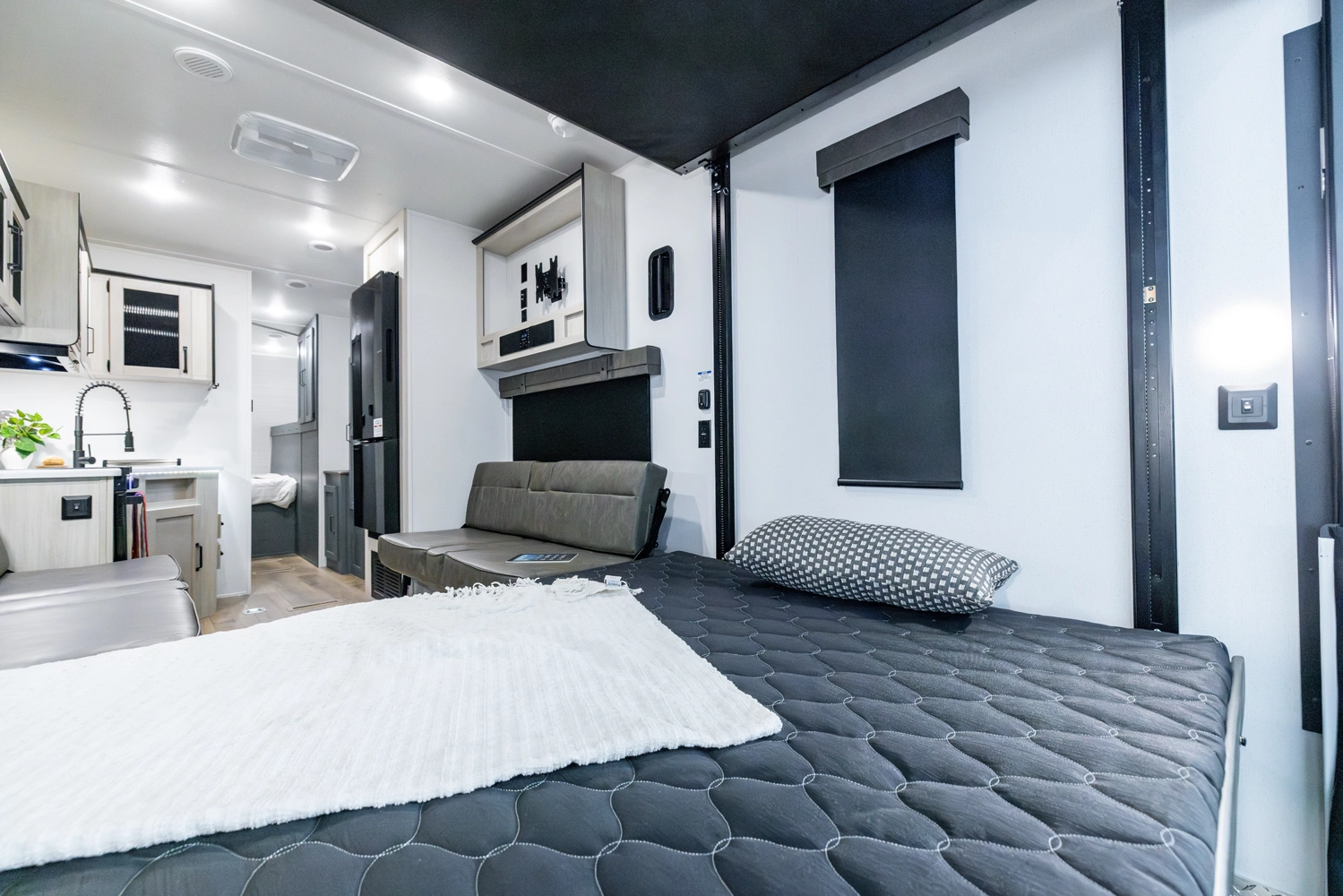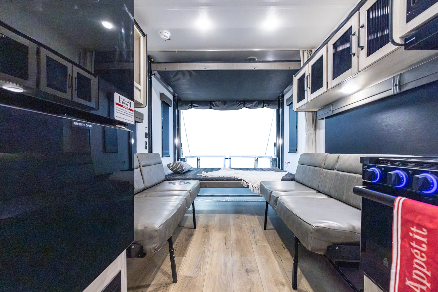 This Toy Hauler is a Travel Trailer that will grant you a vast majority of the layout to be optional cargo area. With 11' of cargo space in the garage, make sure to bring all the toys. The Flip Up Sleeper Sofa's in the garage of this floorplan provide sleeping areas for you and your guests. An optional queen bed electric lift can also be added to the garage for more sleeping quarters, too. Furthermore, an optional outside kitchen can be added for those of you who like to cook in nature.