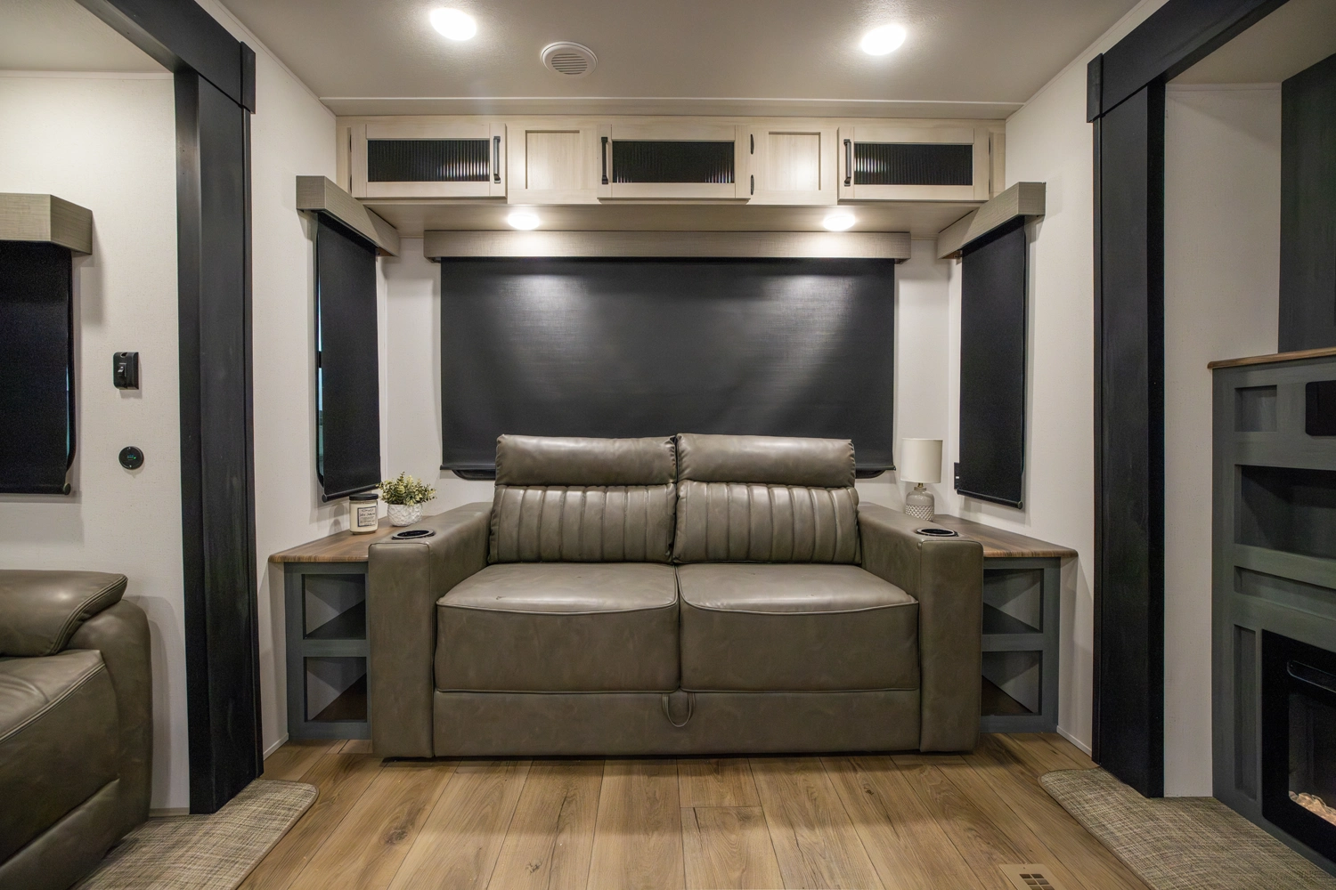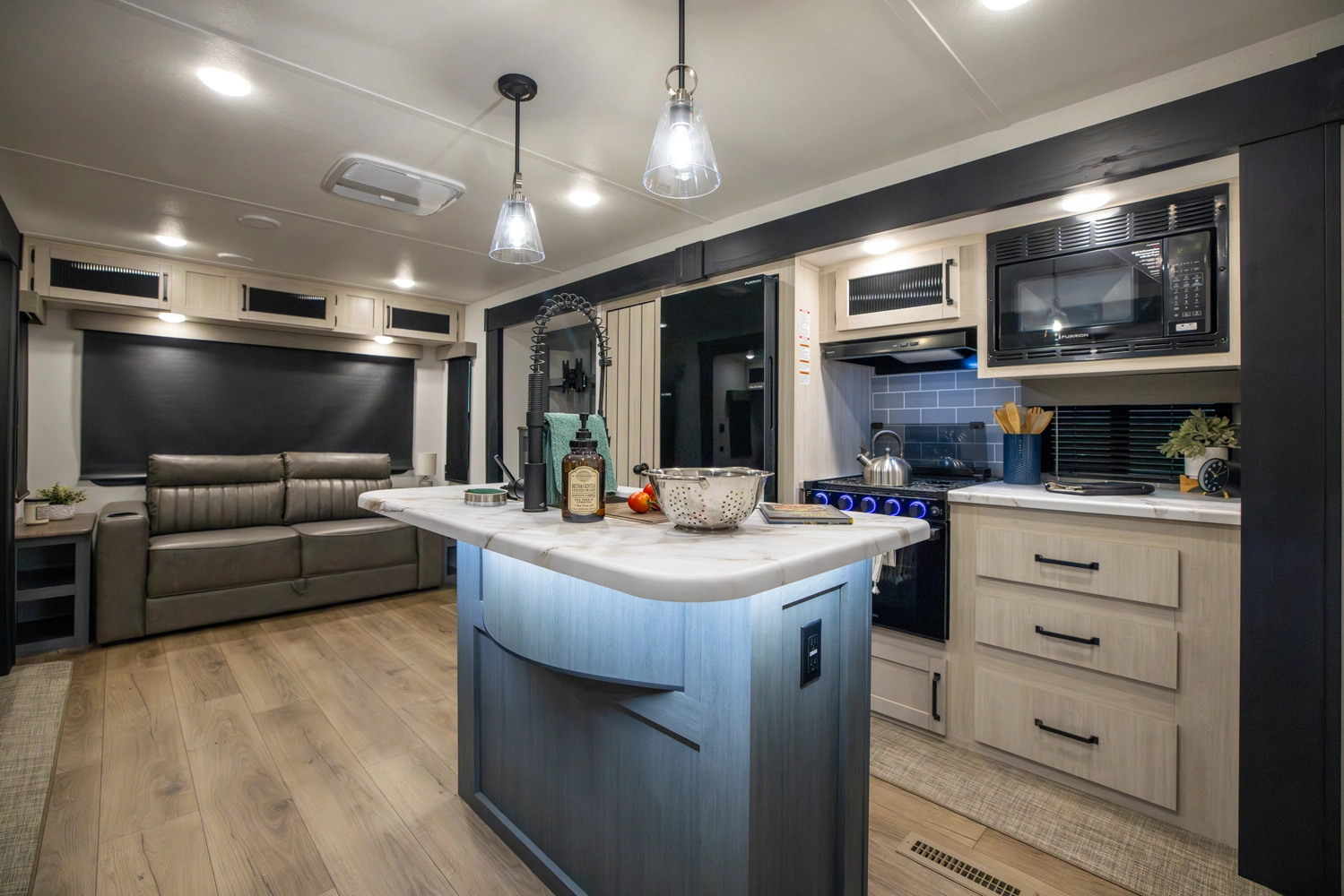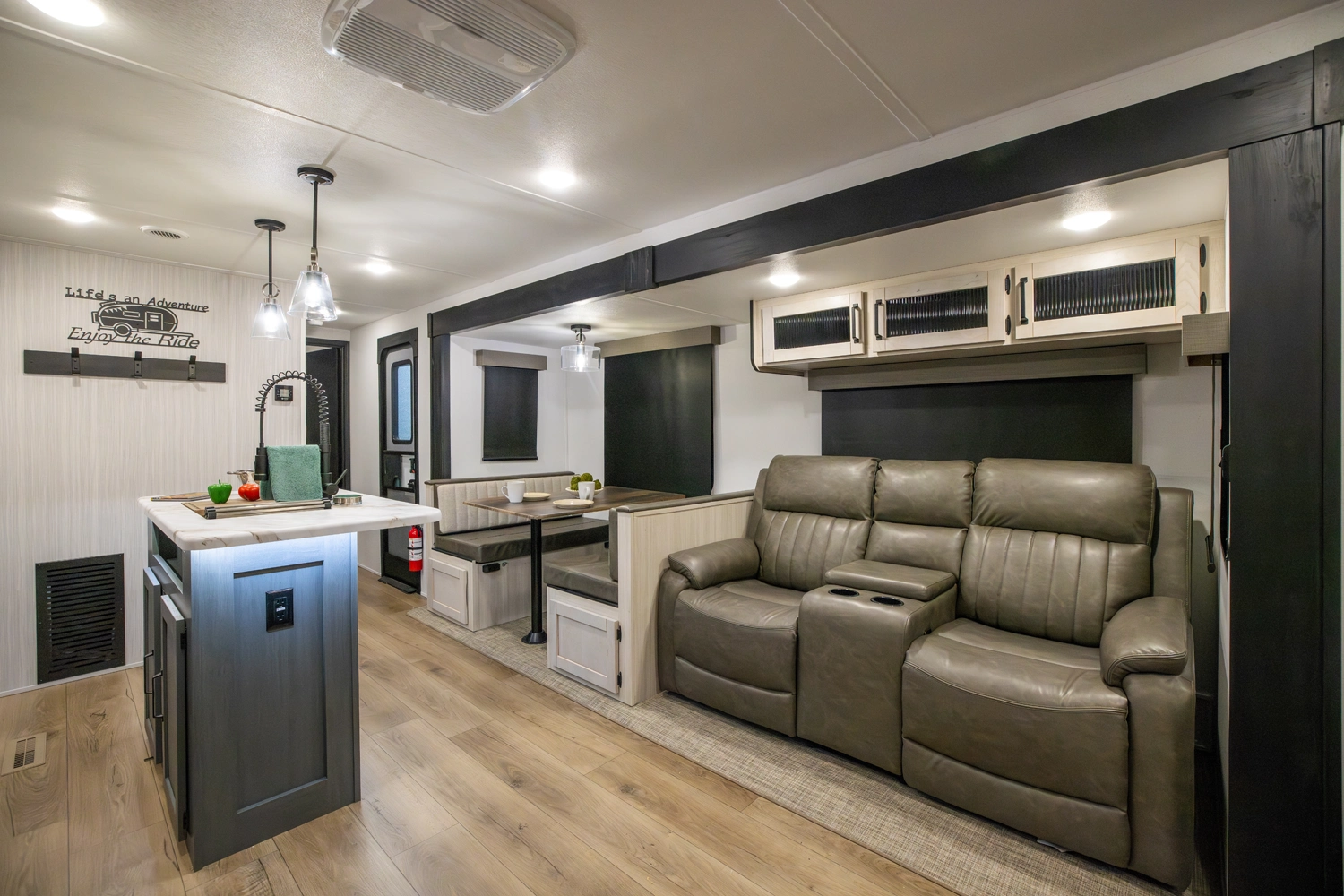 This rear living travel trailer has a sofa, recliners, and a dinette all in the rear of the camper. This spacious floor plan provides you with opposing slides that will make you feel as if you are right at home due to all of the space you receive. This island kitchen fifth wheel with an enormous rear window gives you a great vista of the back of your camper. To top things off, the front of the camper will have a slide out containing a queen bed, closet with washer/dryer prep and a full bathroom.
