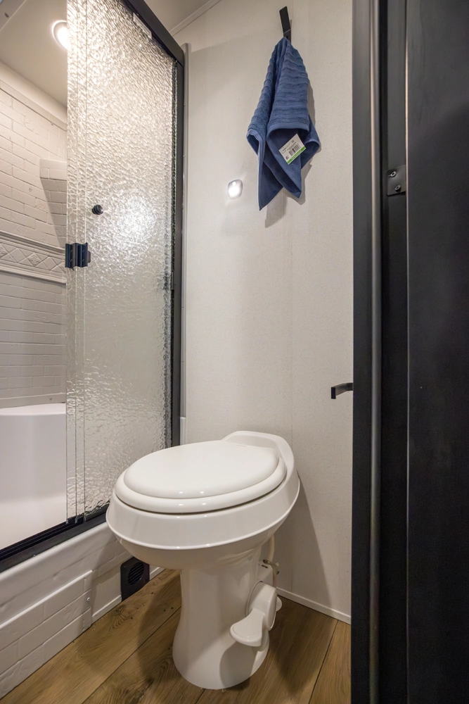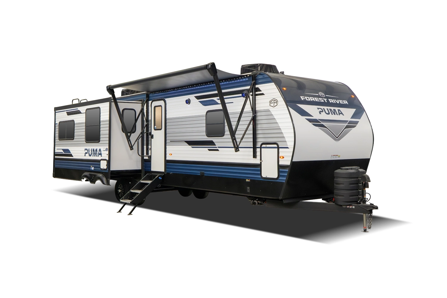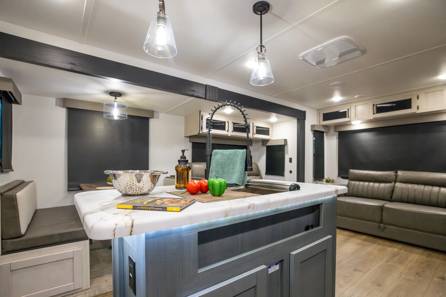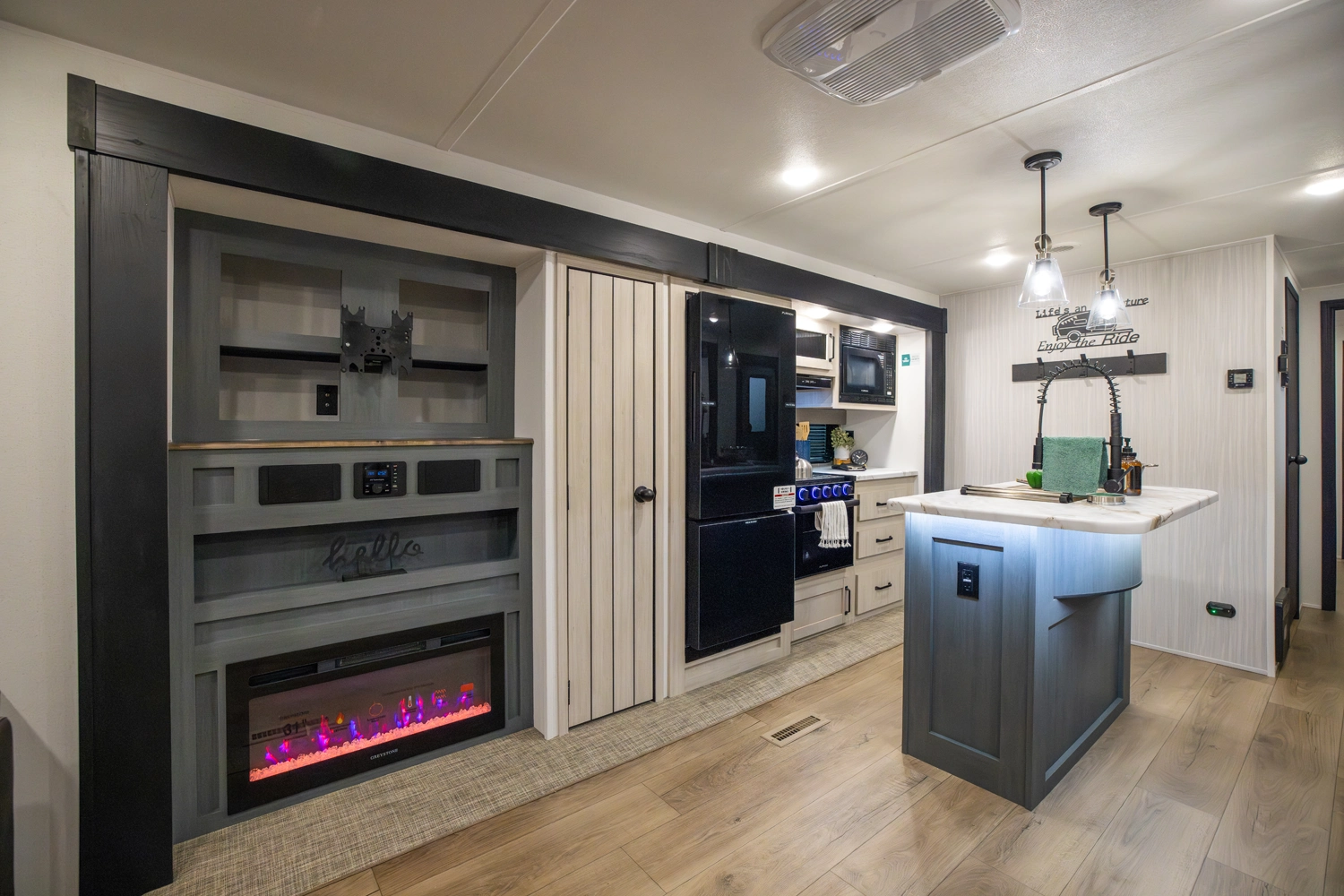 This rear living travel trailer has a sofa, recliners, and a dinette all in the rear of the camper. This spacious floor plan provides you with opposing slides that will make you feel as if you are right at home due to all of the space you receive. This island kitchen fifth wheel with an enormous rear window gives you a great vista of the back of your camper. To top things off, the front of the camper will have a slide out containing a queen bed, closet with washer/dryer prep and a full bathroom.