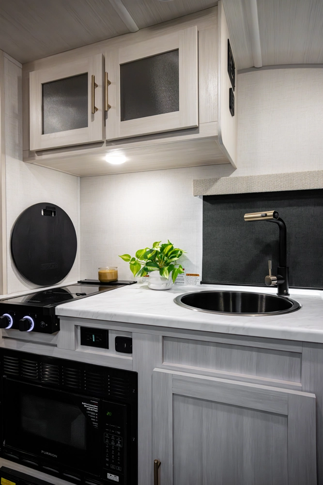 The RP-171 is an ultra-lite travel trailer offering serious features in compact form. With a well-appointed wet bath, efficient kitchen space, and a rear bedroom for restful nights, it delivers comfortable camping without excess bulk. Ample storage, modern finishes, and the thoughtful r•pod design make it ideal for couples or small families seeking lightweight, no-compromise adventures.