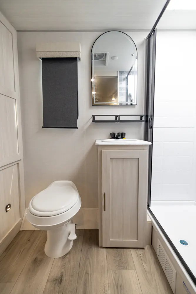 This 25' 8" ultra-lite travel trailer offers a spacious layout with a private front queen bed and a full rear bath. The well-equipped kitchen features a bar top with a flip-up window, convection microwave, and 12V refrigerator. Inside, enjoy 64" theater seating for relaxation. Exterior amenities include a 13' power awning and a hot & cold spray port, perfect for compact adventures.