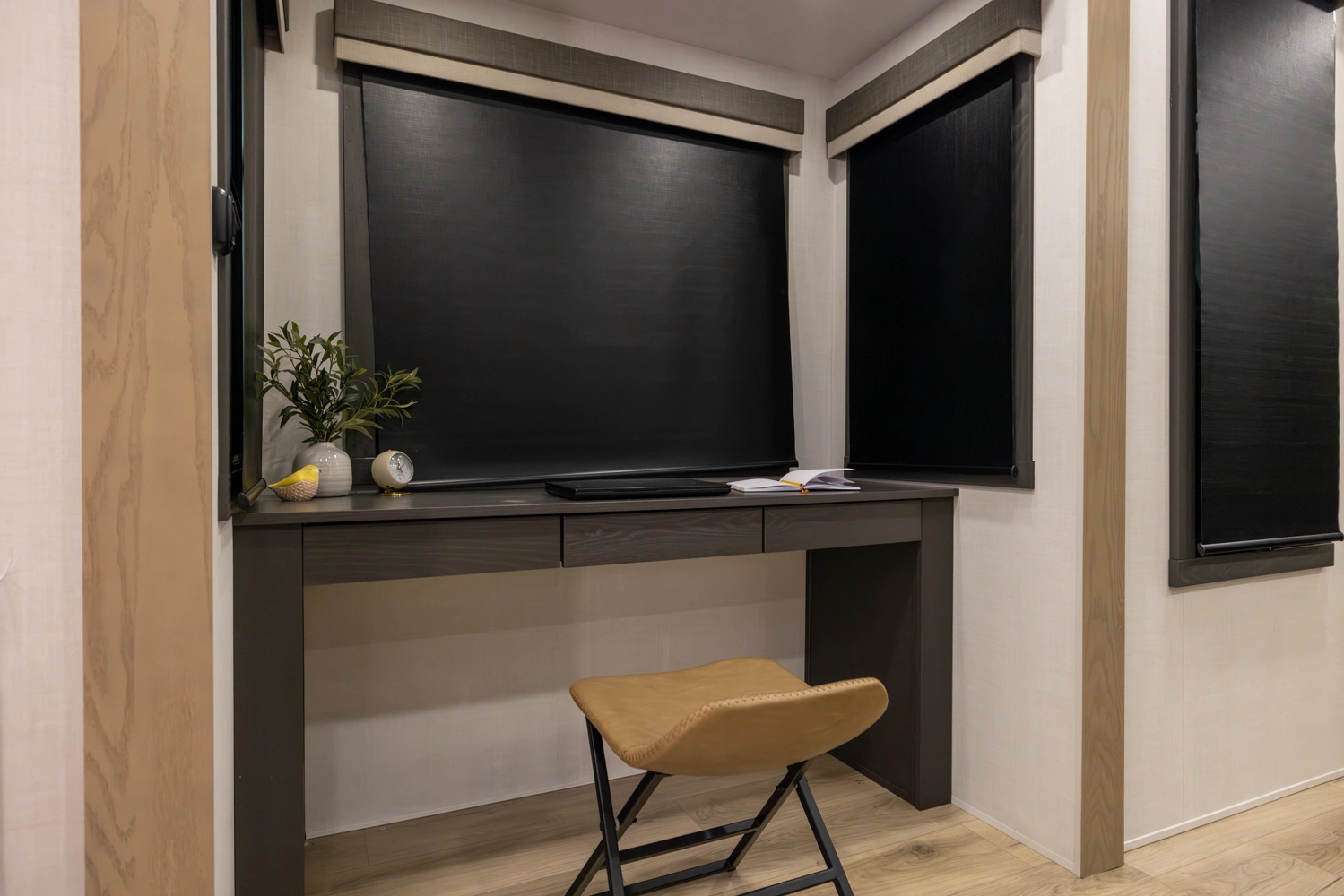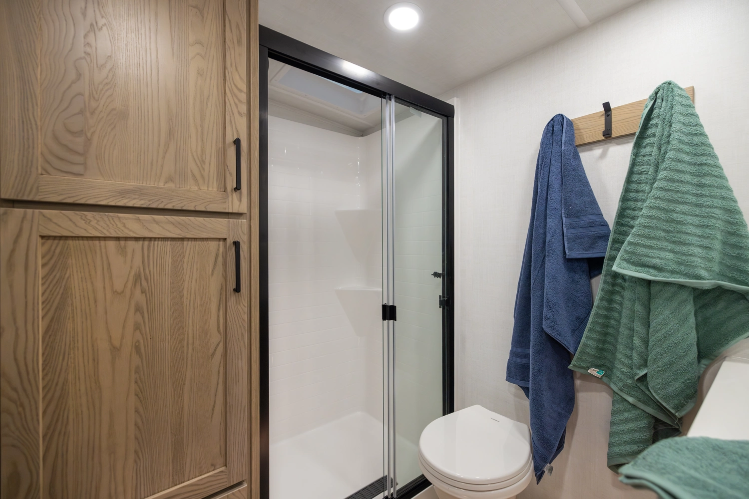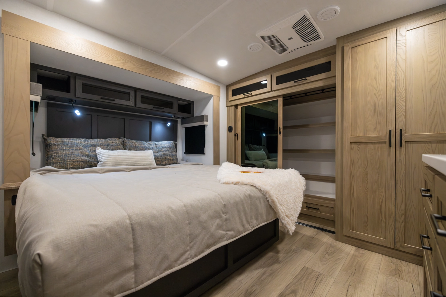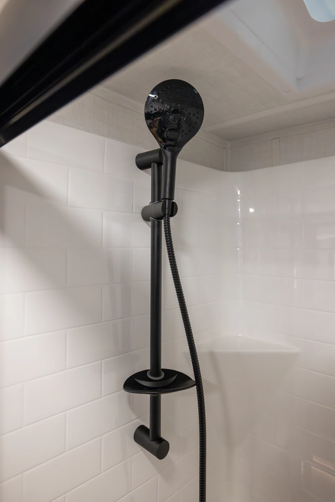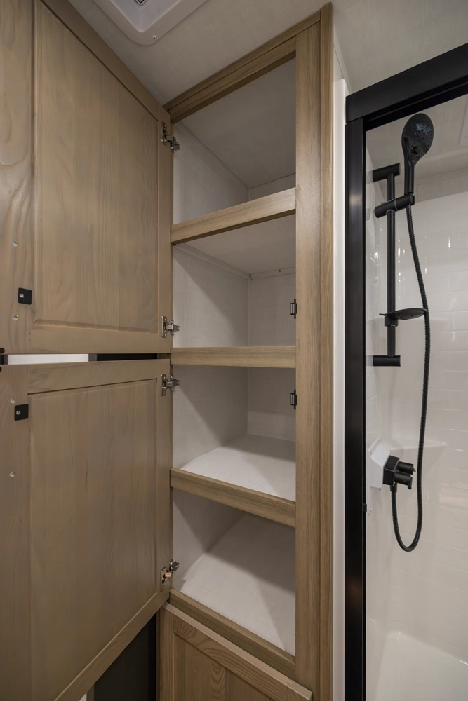 This 101" Wide Body fifth wheel is a rear kitchen layout features expansive counter space, residential style appliances, and abundant storage, making it ideal for those who love to cook while traveling. The mid living area features an L-shaped sofa with an integrated Hide-a-bed and 52" theater seat that requires no dismantling when the slides are retracted. Up front you have a private bedroom with a king bed and generous wardrobe space that is Washer/Dryer ready!