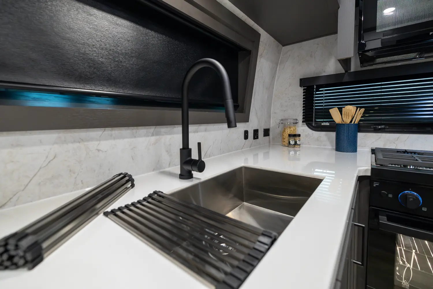 EXQUISITE, EXPANSIVE INTERIORS AS THE NORM. WELCOME TO THE SIGNATURE SERIES, REDEFINING THE CAMPING EXPERIENCE THROUGH AN ARRAY OF REMARKABLE FEATURES. With its inviting open floorplans and ample storage capacity, there's room for those cherished guests or family you wish to bring along. As you nestle into the embrace of a plush king or queen sized bed, the restlessness of your adventures fade away. Through its efficient layout and panoramic windows, the Signature travel trailers offer you an opportunity to luxuriate in your surroundings, all while enjoying the comfort of your serene interior.