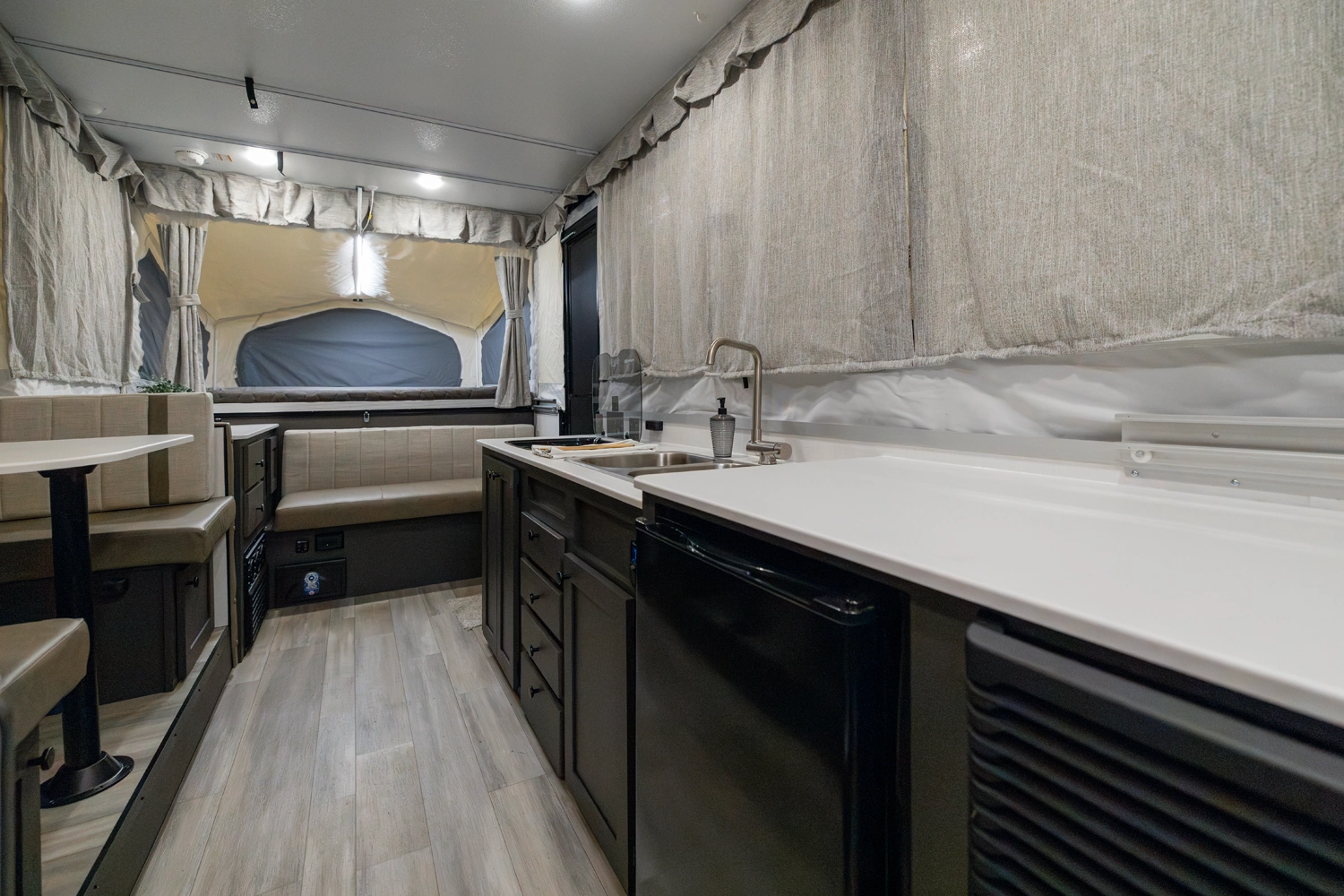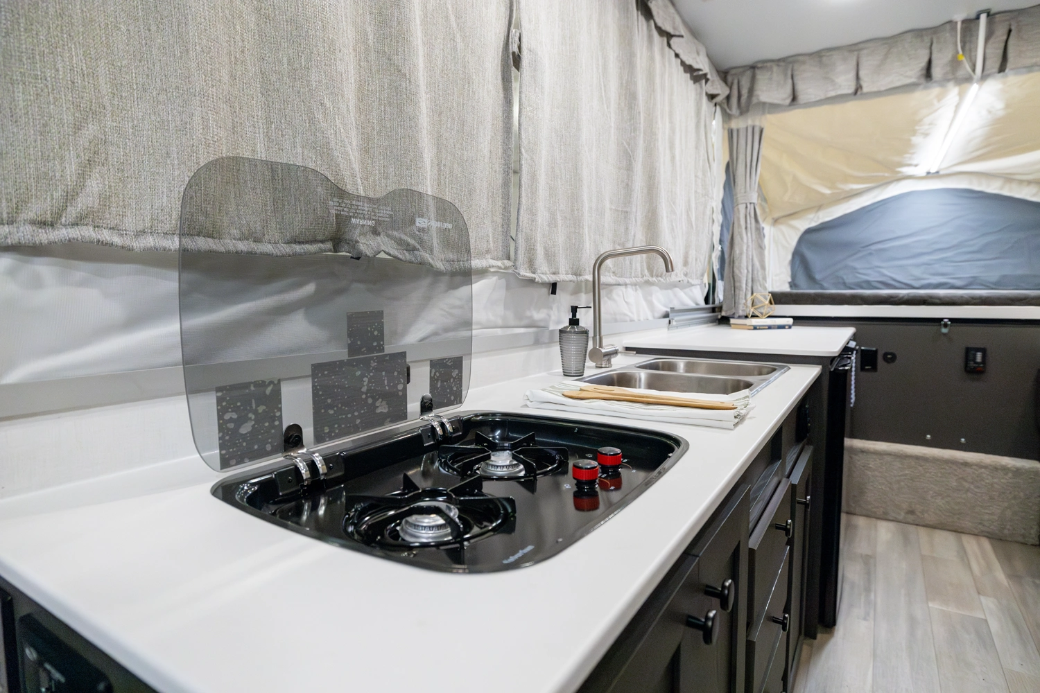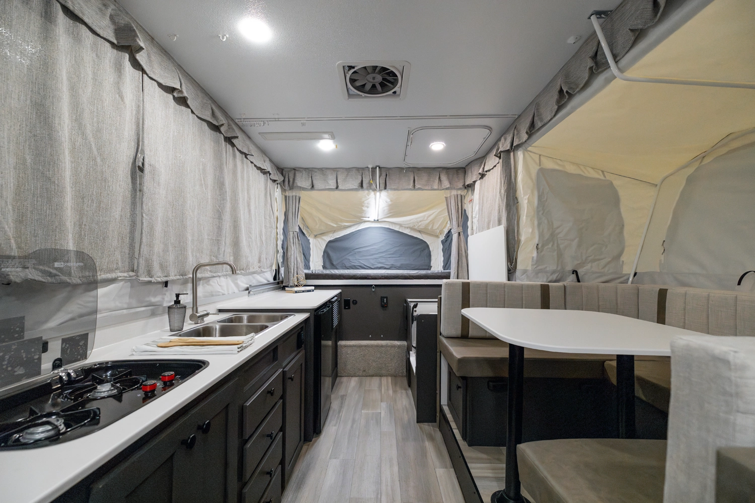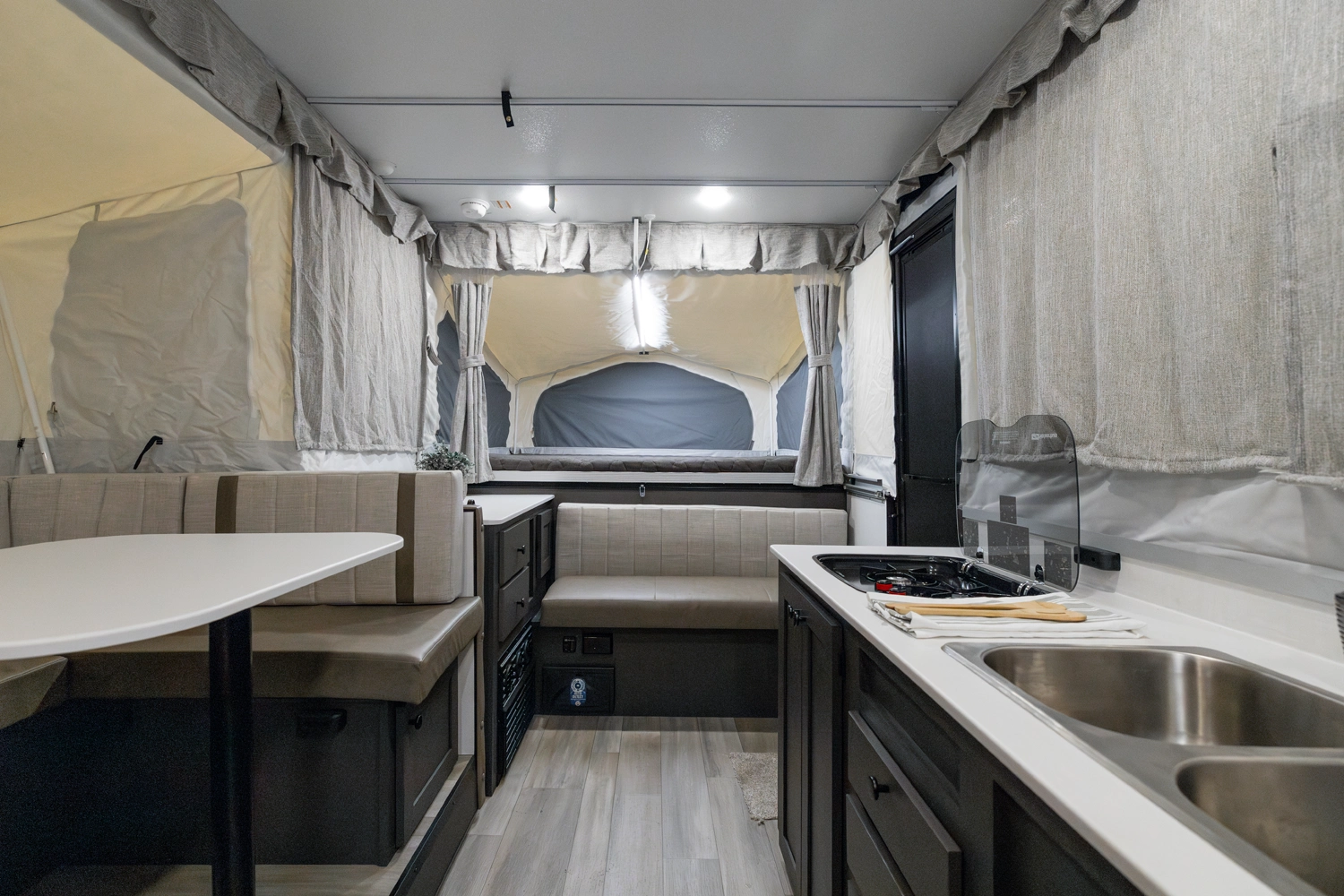 MAXIMIZING YOUR INVESTMENT FOR THE LONG HAUL. Elevate your camping experience with the unmatched quality of the Freedom series line, enhanced by a host of additional features. Imagine the comfort of a Create-a-Breeze fan for optimal ventilation, the convenience of a power roof lift, an outdoor grill for culinary adventures, four stabilizer jacks for stability, and the warm embrace of brilliant LED awning lights that gracefully guide you back to your camper as the sun sets. Embrace the luxurious side of camping with your Rockwood tent camper, where 'roughing it' becomes a thing of the past.