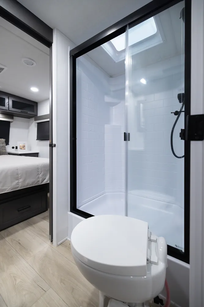 • Platinum Package: Auto Leveling, Frameless Windows, 1800W Inverter, MORryde Strut Assist Entry Step, Dual 30 LP Tanks