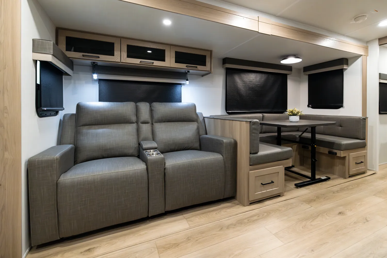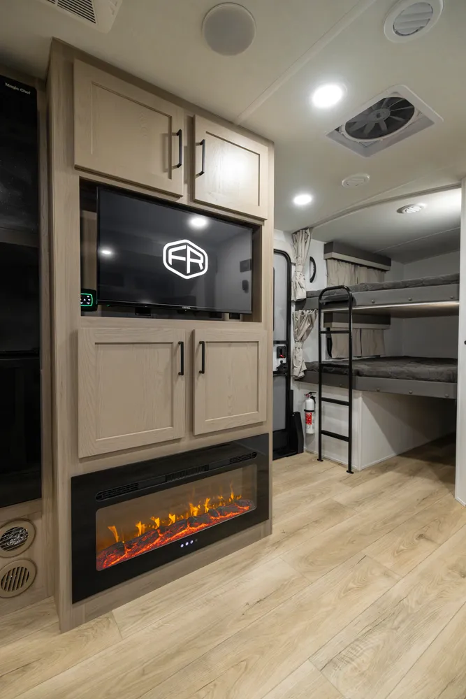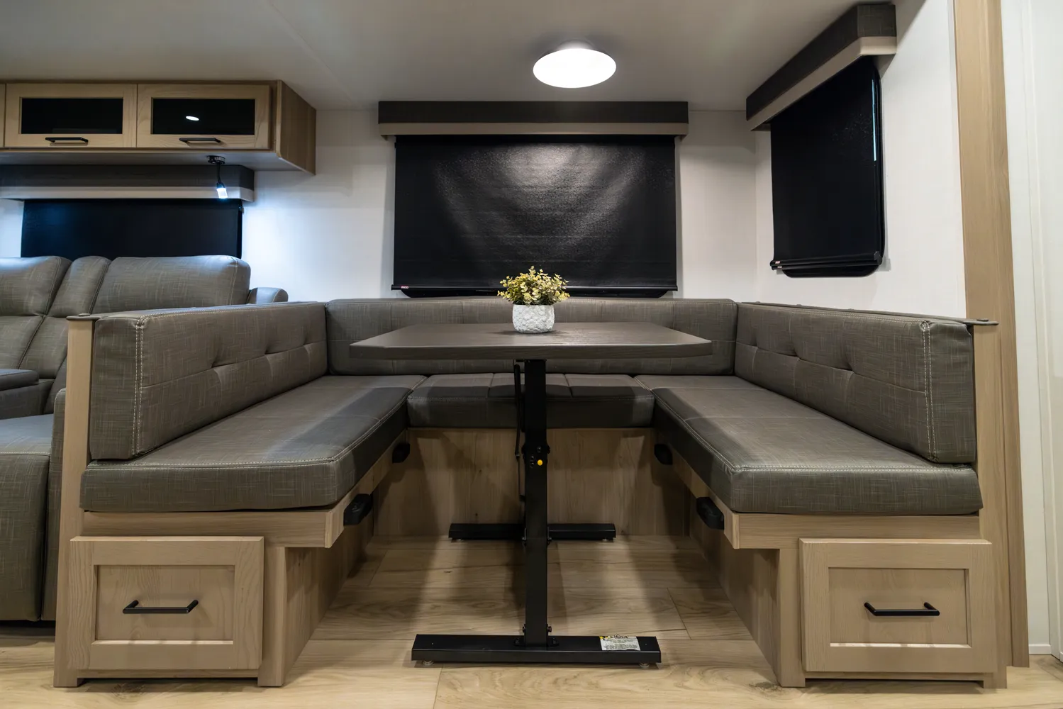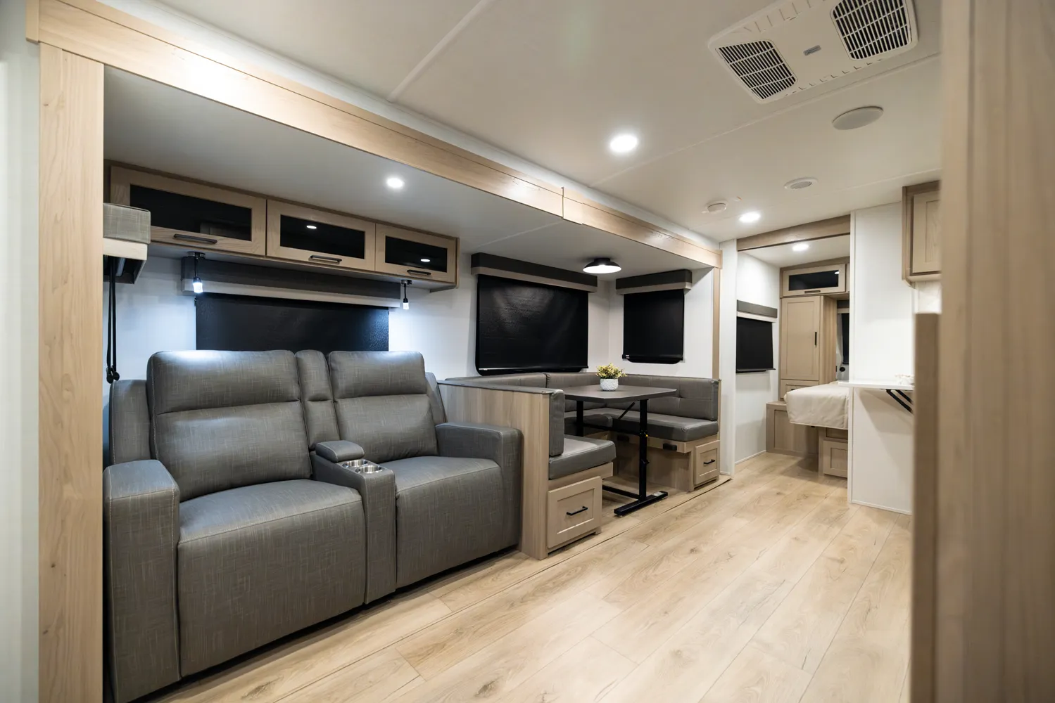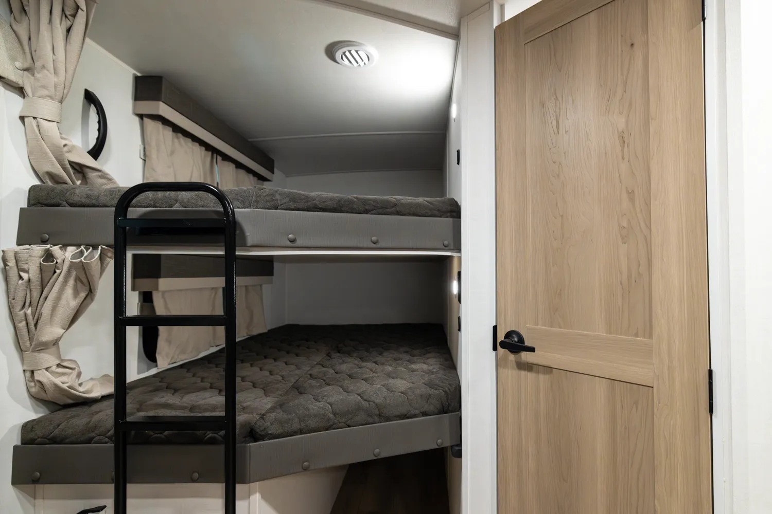 The 2706BH is a versatile, family friendly floorplan featuring a front bedroom with a true queen bed and a large rear bathroom with a shower. The living area and kitchen include comfortable seating and a dinette for meals and relaxation, while the segregated rear bunk room provides privacy and extra sleeping space, making the 2706BH perfect for families seeking comfort and functionality at the campsite.