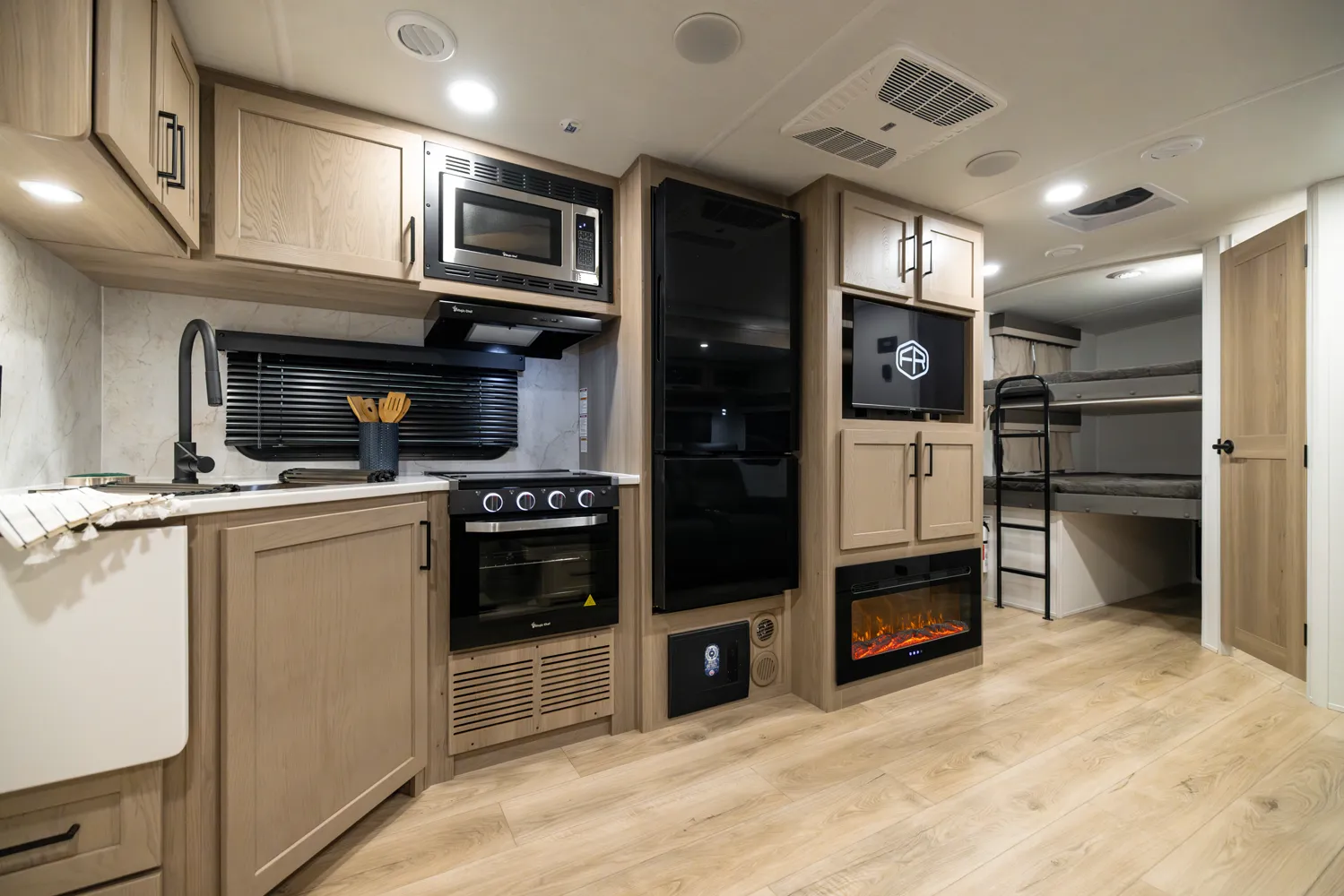 • Platinum Package: Auto Leveling, Frameless Windows, 1800W Inverter, MORryde Strut Assist Entry Step, Dual 30 LP Tanks