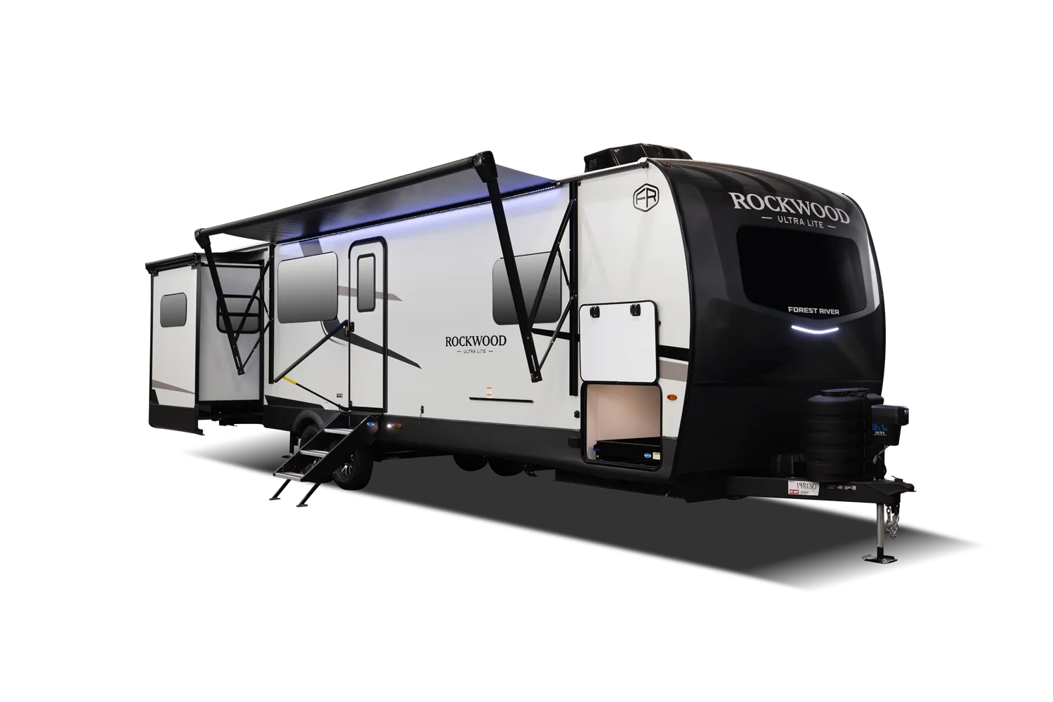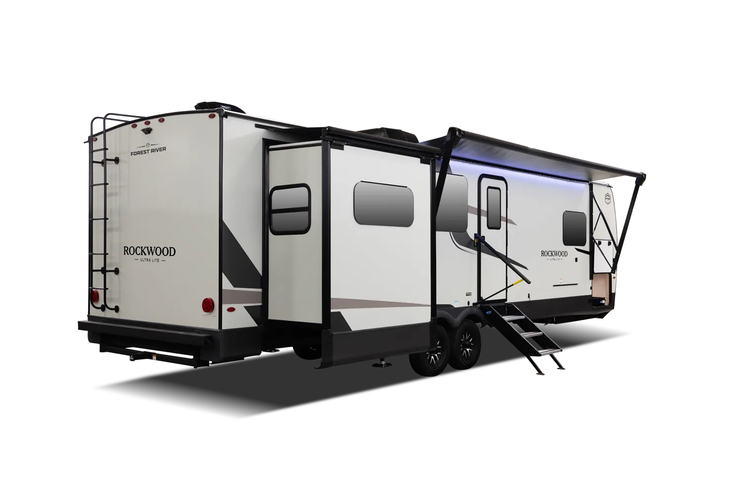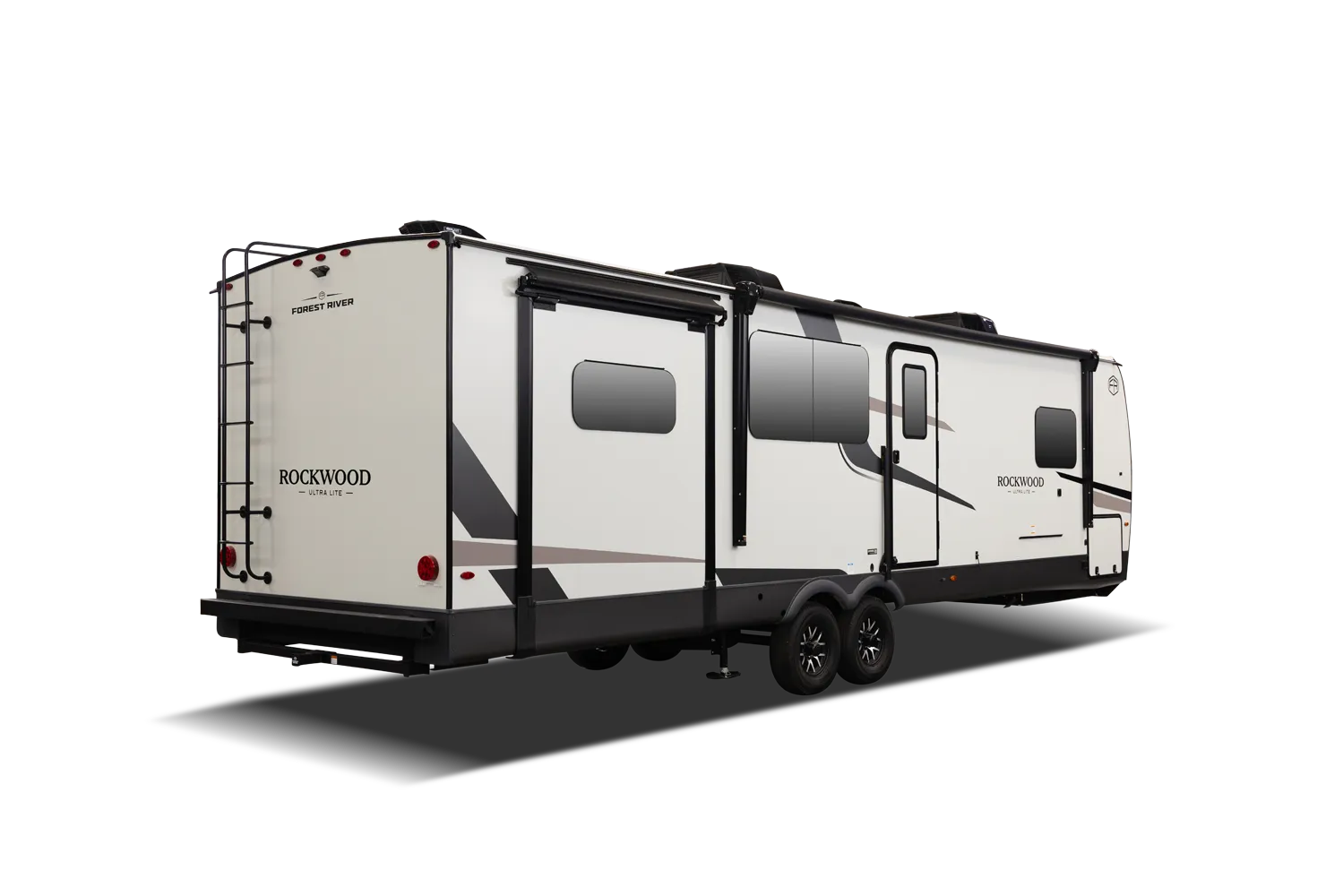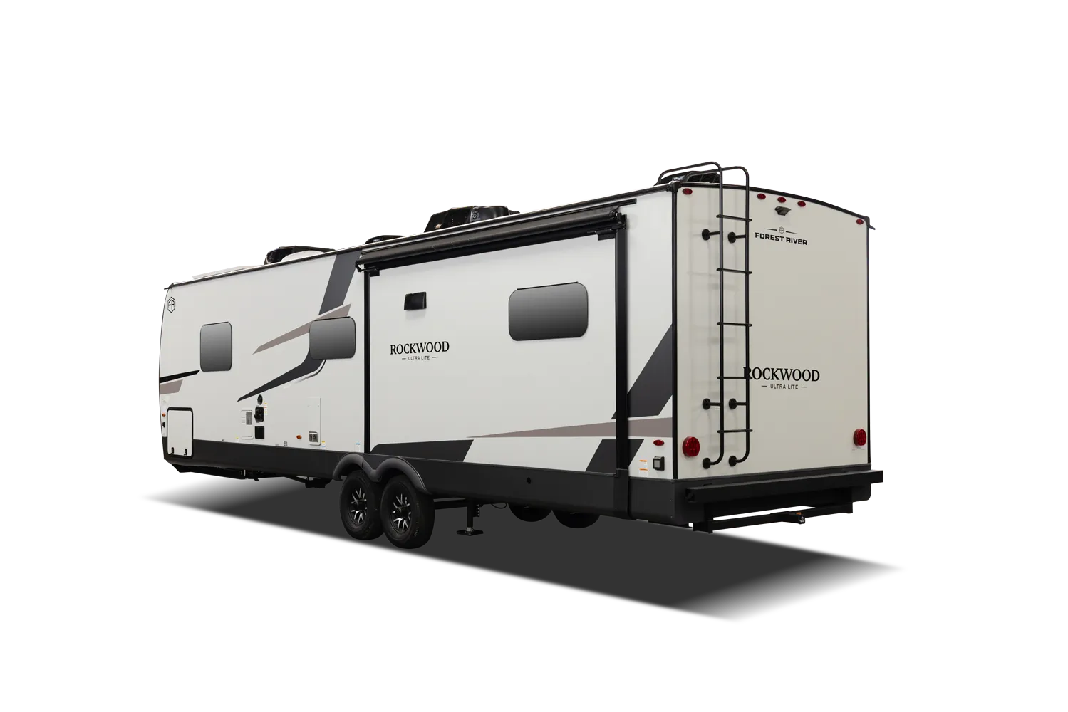 The Rockwood 2908SRL impresses with a beautiful rear entertainment center and rear living area featuring two 60" hide a beds and a 60" theater seat. In the kitchen, enjoy a table with barstools and plenty of countertop space. In the bathroom, a large rectangular shower, and in the front bedroom, a true queen bed, making this Ultra Lite perfect for comfort, style, and family fun on the road.