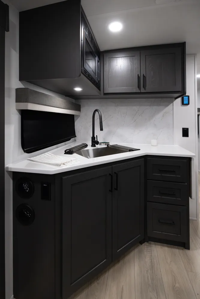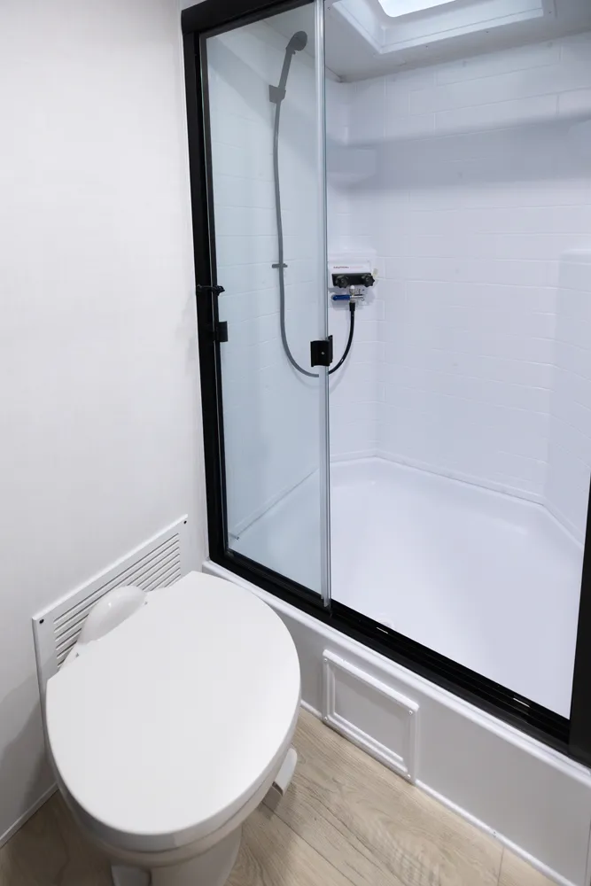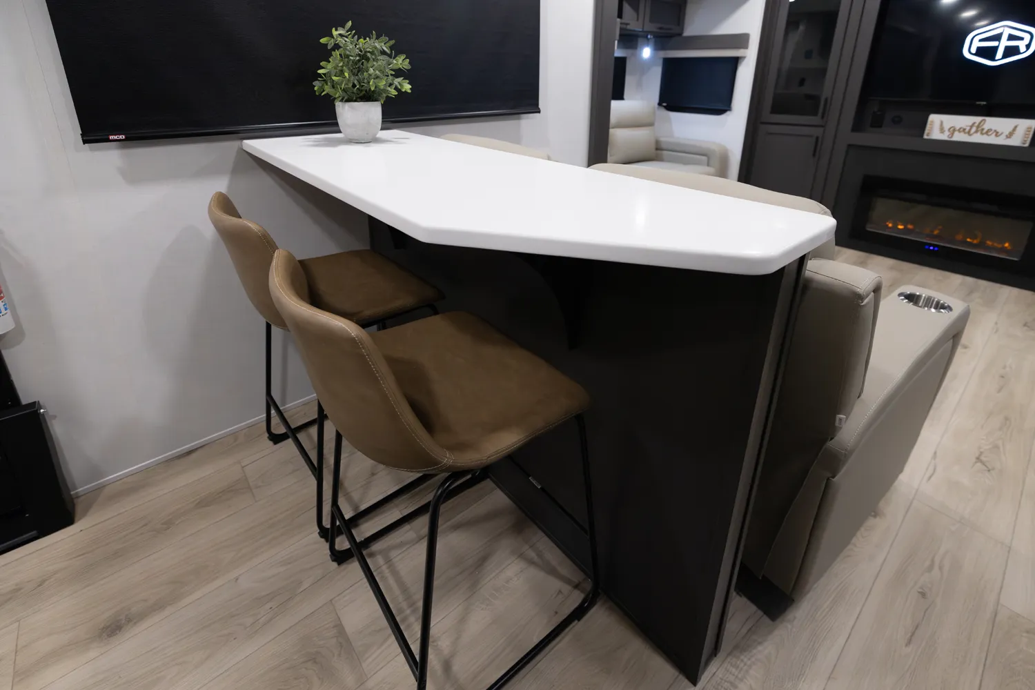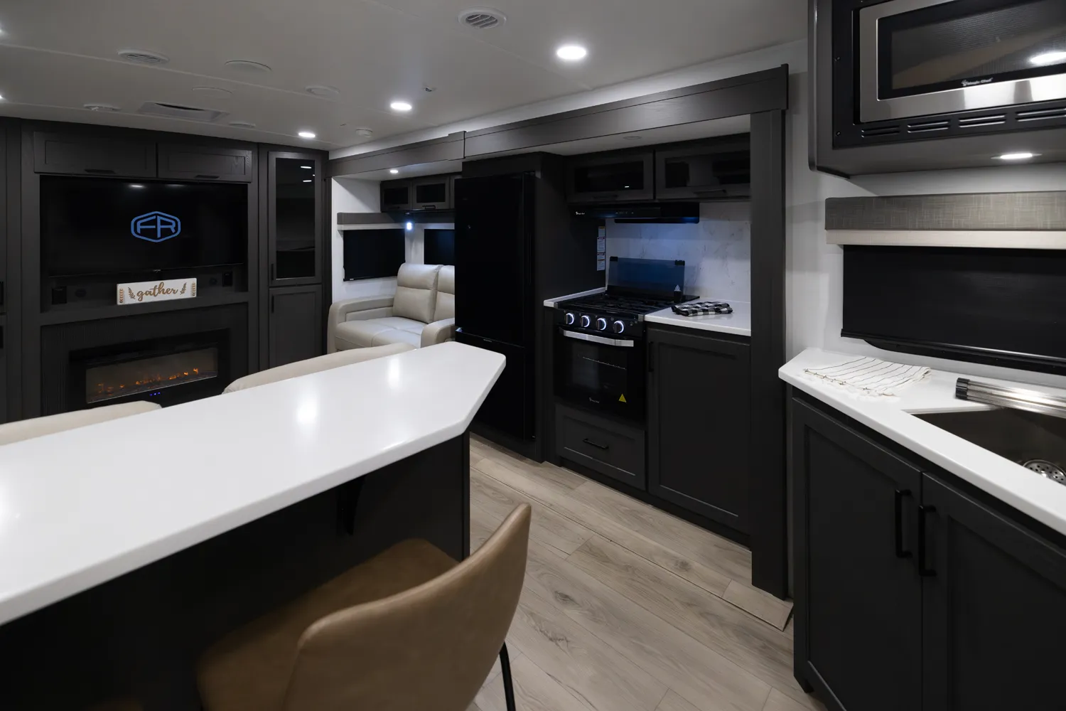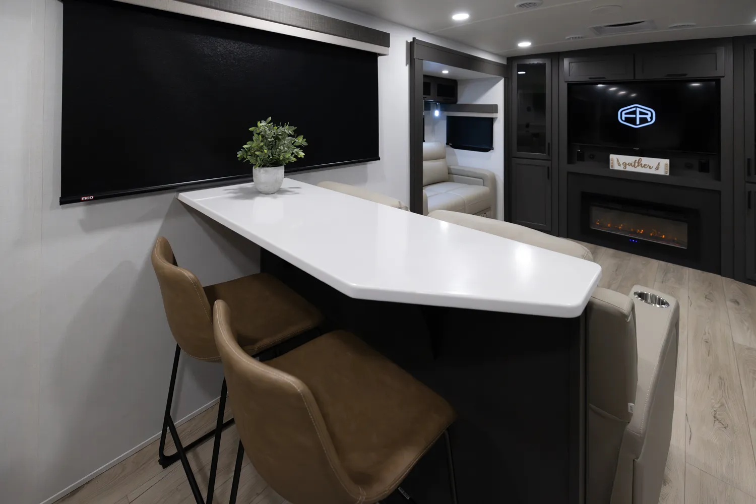 The Rockwood 2908SRL impresses with a beautiful rear entertainment center and rear living area featuring two 60" hide a beds and a 60" theater seat. In the kitchen, enjoy a table with barstools and plenty of countertop space. In the bathroom, a large rectangular shower, and in the front bedroom, a true queen bed, making this Ultra Lite perfect for comfort, style, and family fun on the road.