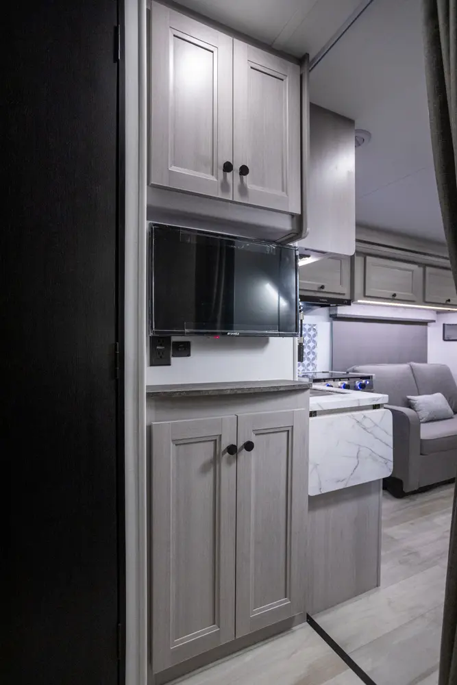 The Solera 32DSB is built on the Ford E450 chassis. This motorhome provides sleeping space for adults and kids alike, with a rear 60" x 74" queen bedroom that includes a wardrobe, plus a 28" x 72" flip-down bunk above the kid's sofa sleeper and the 60" x 80" bunk over cab. You could even transform the booth dinette and sofa into extra sleeping spaces if needed. The kitchen area is fully equipped for meals on the go, with a 10.7 cu ft 12V refrigerator, recessed 3-burner range with flush glass cover, and a 1.3 cu ft convection microwave oven. Overhead cabinets provide additional storage. The 60" x 80" bunk over cab provides more room for sleeping plus a 12V LED TV for extra entertainment!
