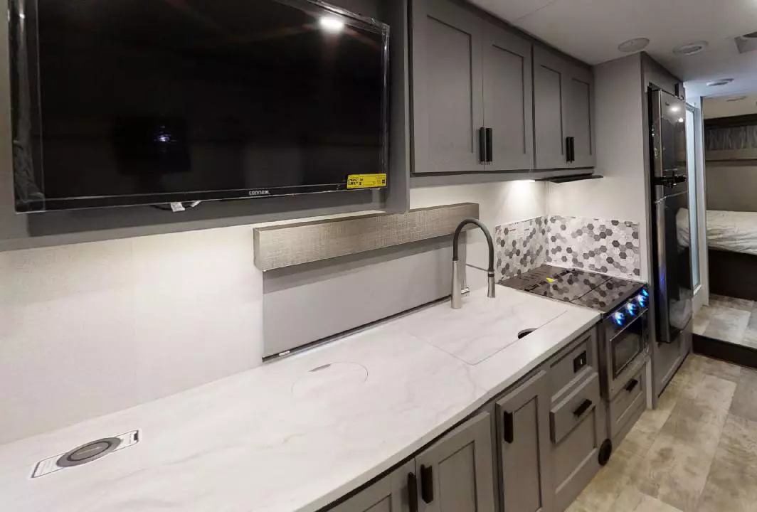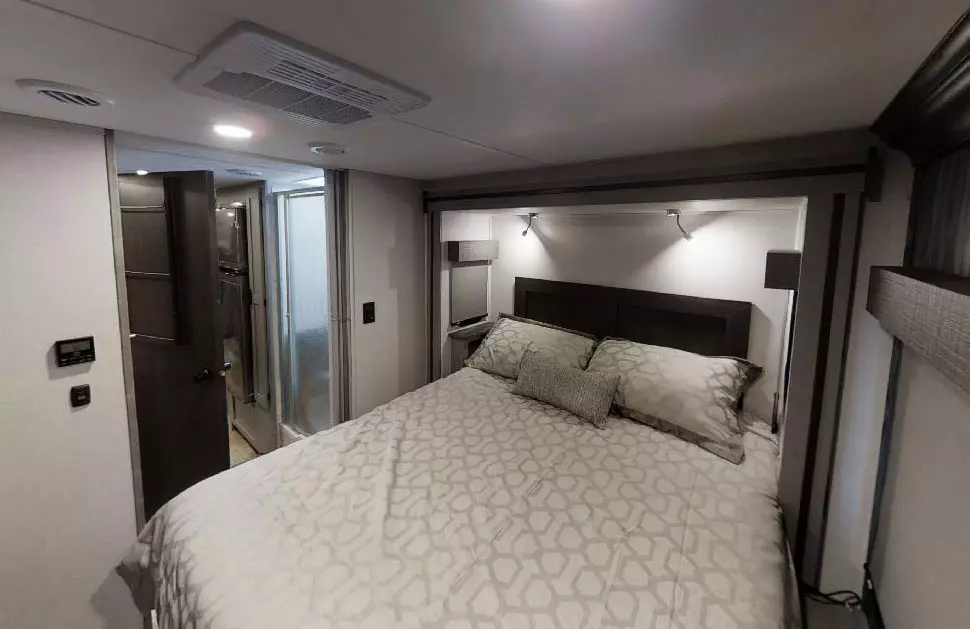 The Solera 32DSK is built on the Ford E450 chassis. This motorhome features a rear private bedroom has a 60" x 74" queen bed slide for more interior space and a linen closet with wardrobes on either side. There is also a split-style bath with a private toilet and sink, with the shower right across the hall. The kitchen area is fully equipped for meals on the go, with a 10.7 cu ft 12V refrigerator, recessed 3-burner range with flush glass cover, and a 1.3 cu ft convection microwave oven. Overhead cabinets provide additional storage. The 60" x 80" bunk over cab provides more room for sleeping plus a 12V LED TV for extra entertainment!