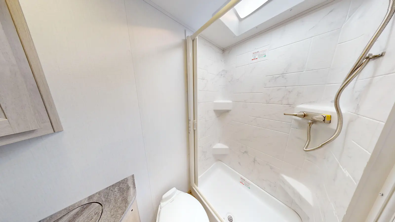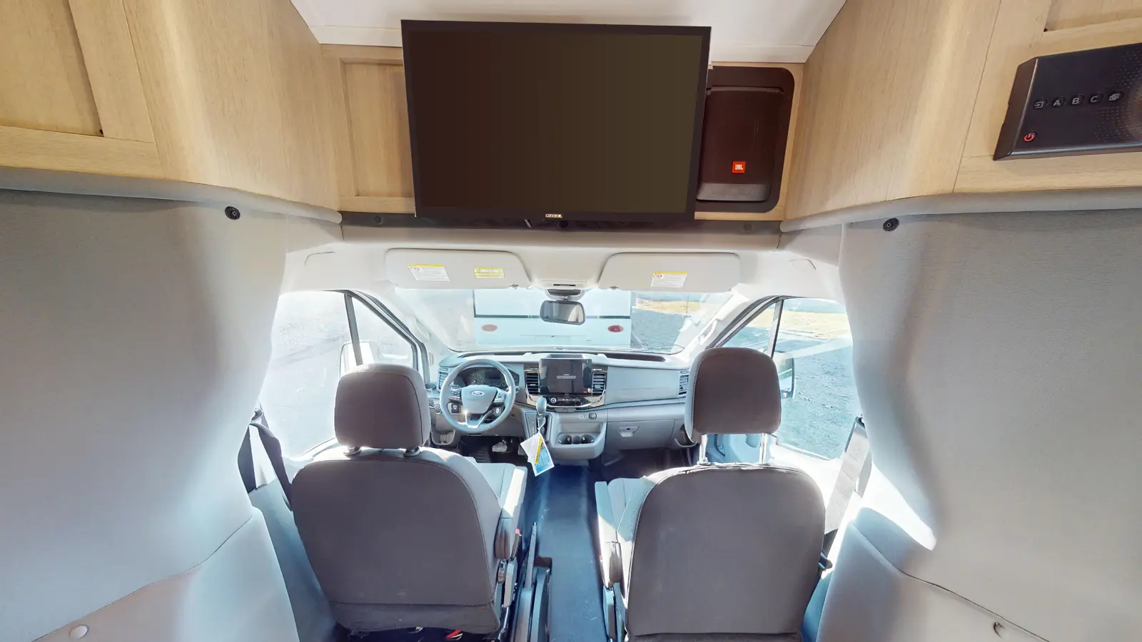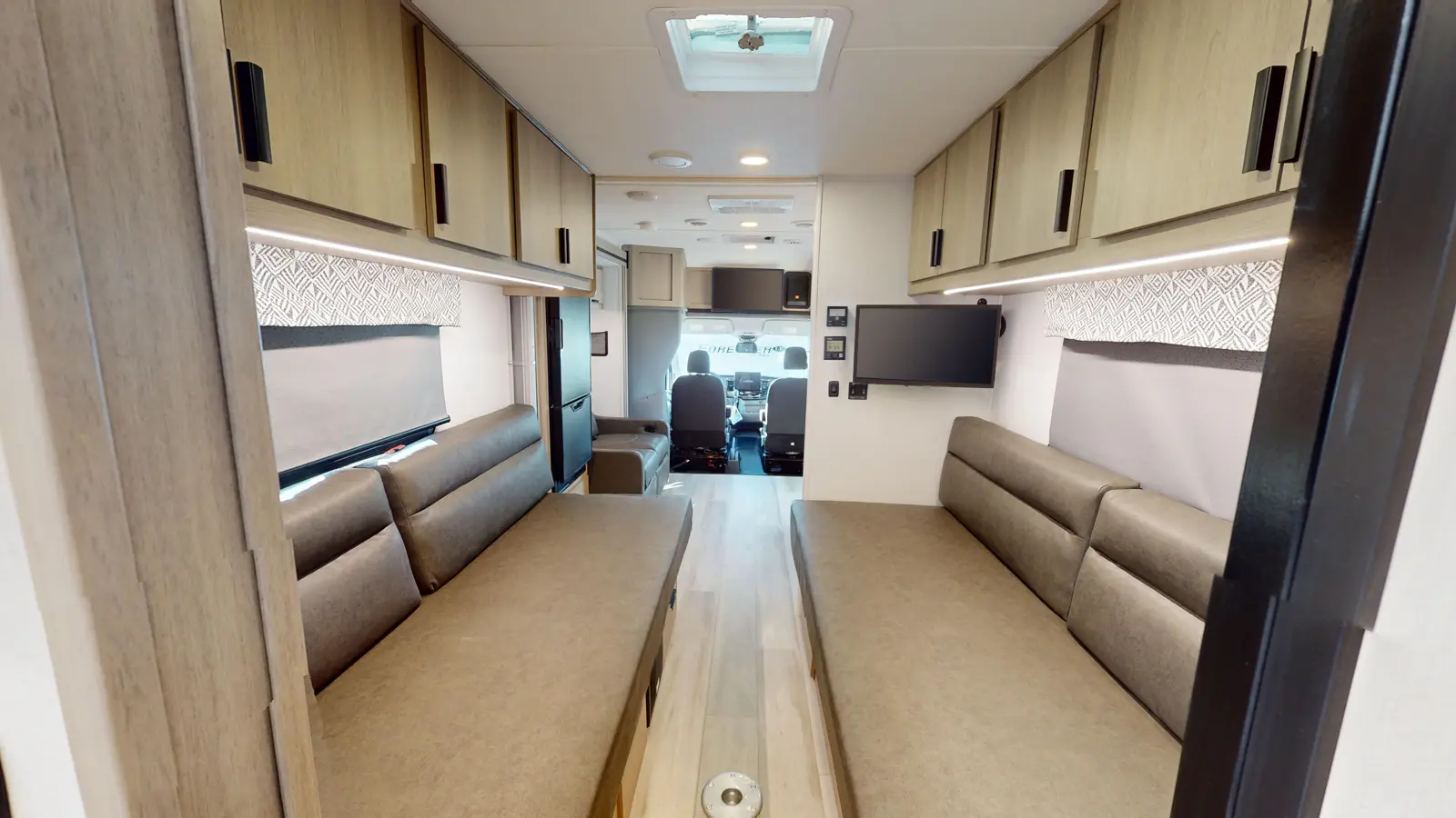 Trips across country or state are made comfortable in this motorhome for two. This unique floorplan features a pair of twin beds that can convert to a queen if you'd rather have one large sleeping area. The full rear bath includes a 24" x 36" shower and a wardrobe to store clean towels, and you'll find plenty of overhead compartments for all your belongings. Each morning you can prepare breakfast on the two burner range, or use the convenient convection microwave.
