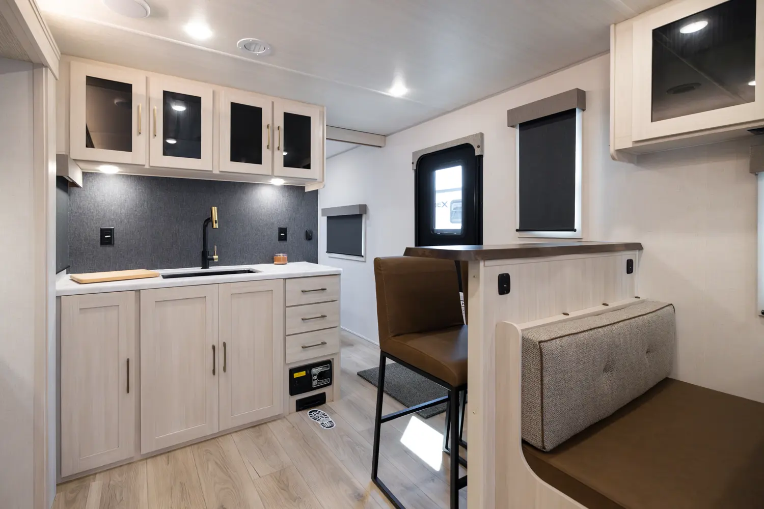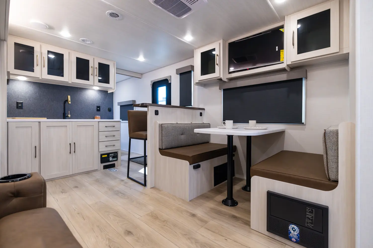 This 30' 9" travel trailer features a rear bathroom with a shower, toilet, and sink. The kitchen includes a 10 cu. ft. 12V refrigerator and stovetop. Living space includes an EZ-Out sofa bed, breakfast bar and dinette. The front private bedroom offers a queen bed with dual wardrobes and overhead storage. Exterior amenities include a 21' power awning with LED lights and pass-through storage.