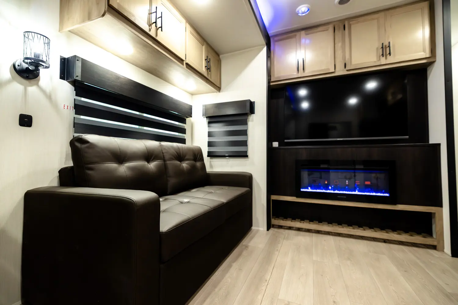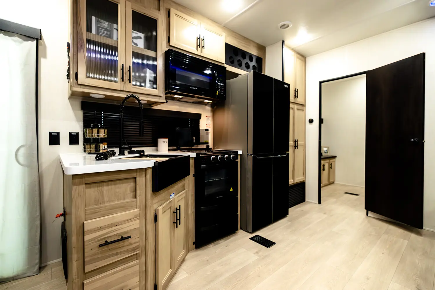• Cherokee Black Label Timberwolf (Deep Tinted Frameless Automotive Glass Windows, High Gloss Gel Coat Exterior Sidewalls, Multicolor Reading Lights, Pillowtop Mattress Upgrade, Thermo Foil Arctic Insulation, Wall Controlled Power Shades for Living Room and Kitchen)